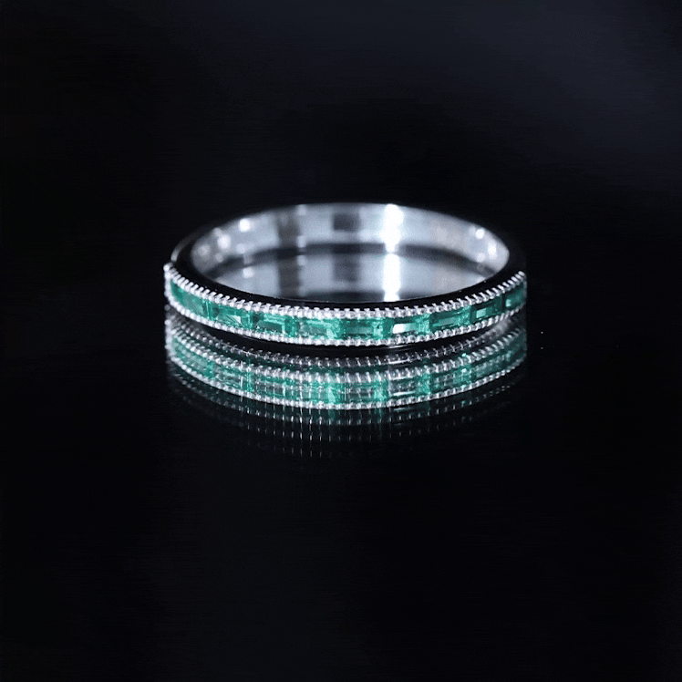 Baguette Cut Lab Grown Emerald Eternity Ring with Beaded Detailing