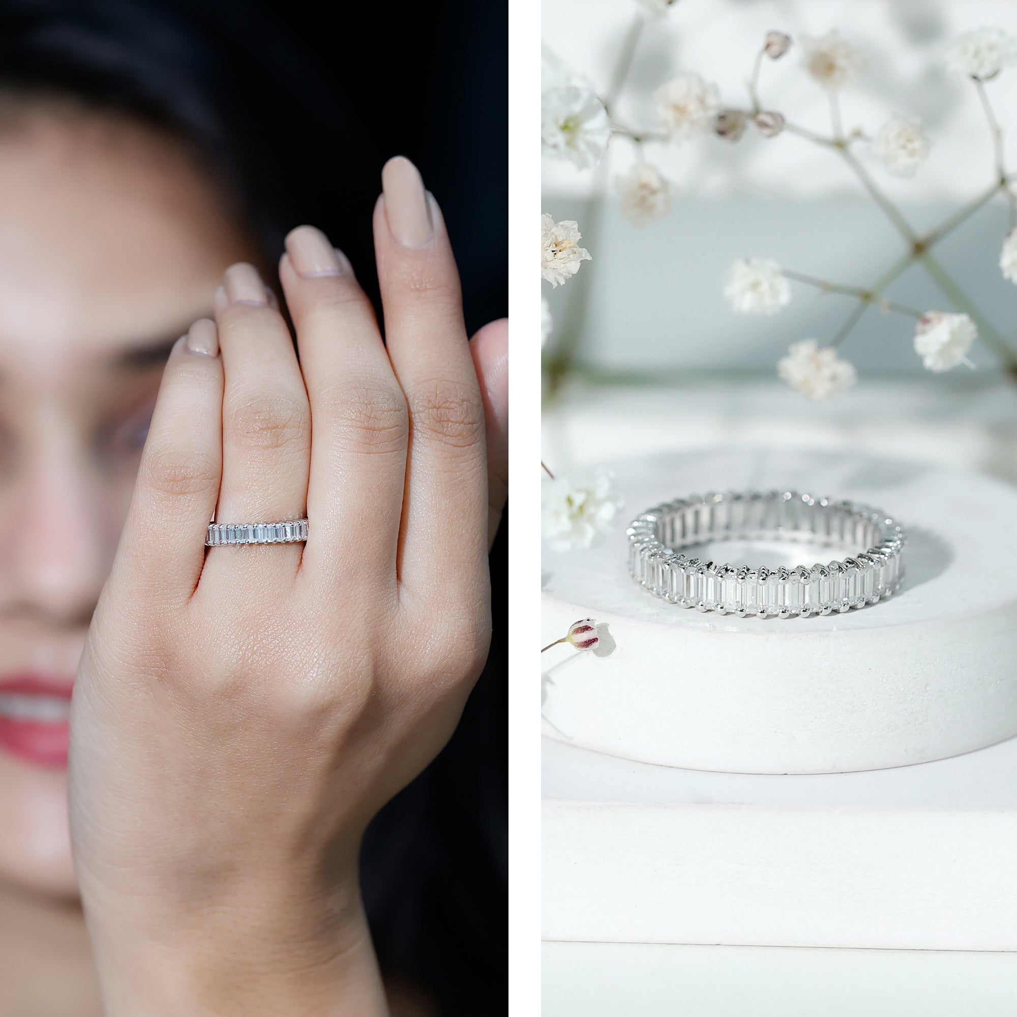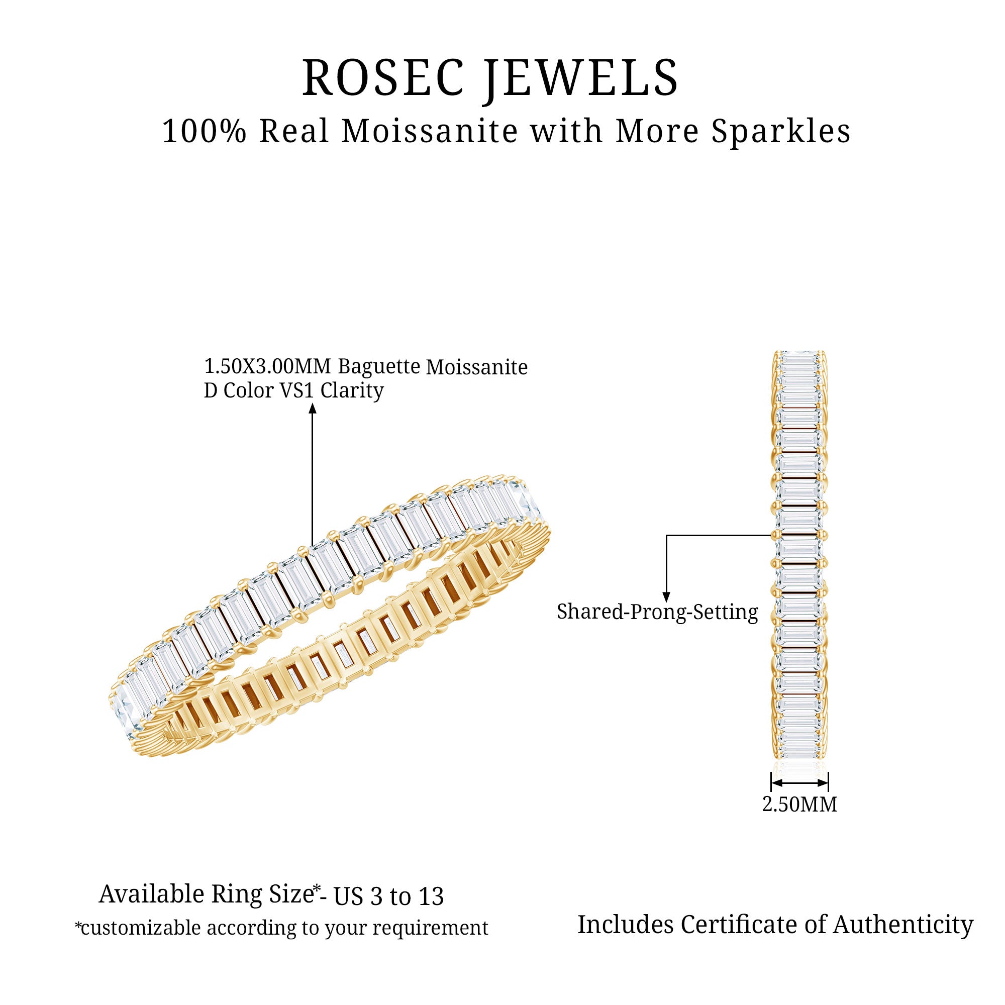 Shine with timeless elegance and captivating beauty when you slip on this Eternity Wedding Band. This stunning ring features an endless line of sparkle, showcasing Baguette Cut Moissanite set in Shared Prong Setting, adding a touch of glamour to any occasion. Whether you are looking to complement an engagement ring or use it as a Wedding Anniversary Band, this Baguette Cut Eternity Band symbolizes a new journey filled with love and commitment. Its meaning is especially significant when gifted during important moments like proposals or milestone anniversaries. With a variety of ring sizes available, this Moissanite Stackable Ring guarantees a perfect fit for every hand ready to display forever. Packaged in a signature jewelry box, it is a gift that is sure to wow. This Moissanite Wedding Band conveys love with a sparkle that is hard to overlook. It blends classic style with a modern twist, making it ideal for those who appreciate their sparkle with a hint of uniqueness.