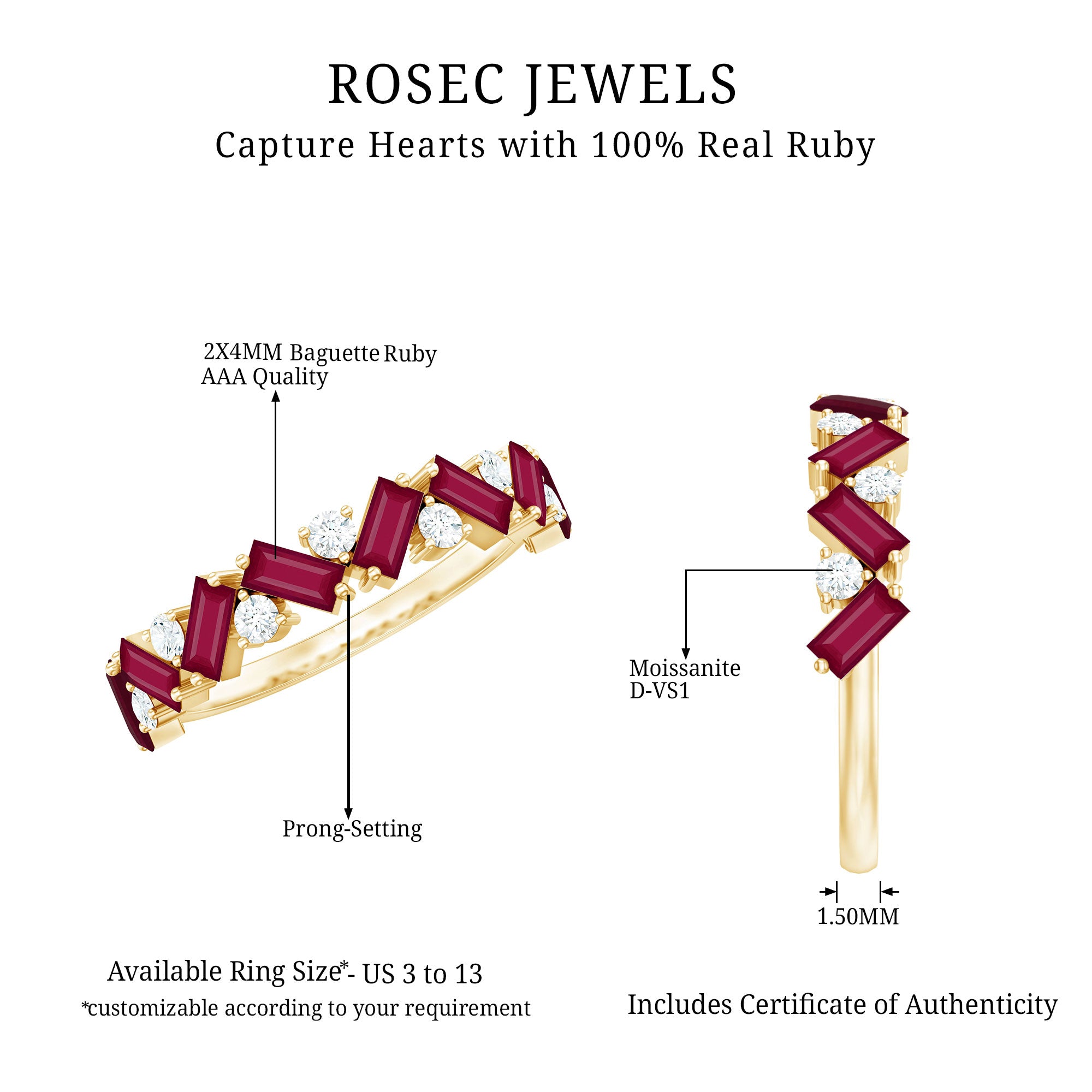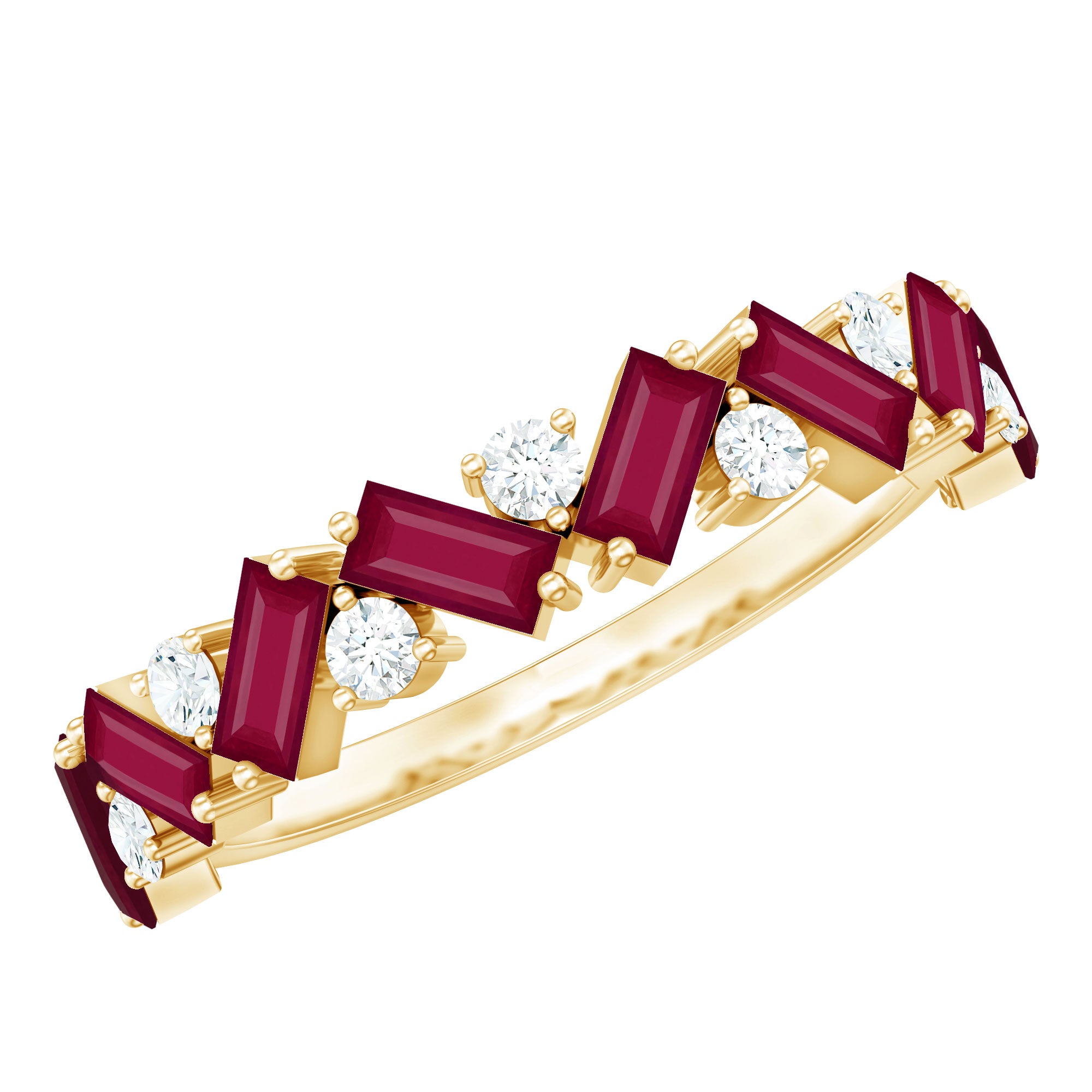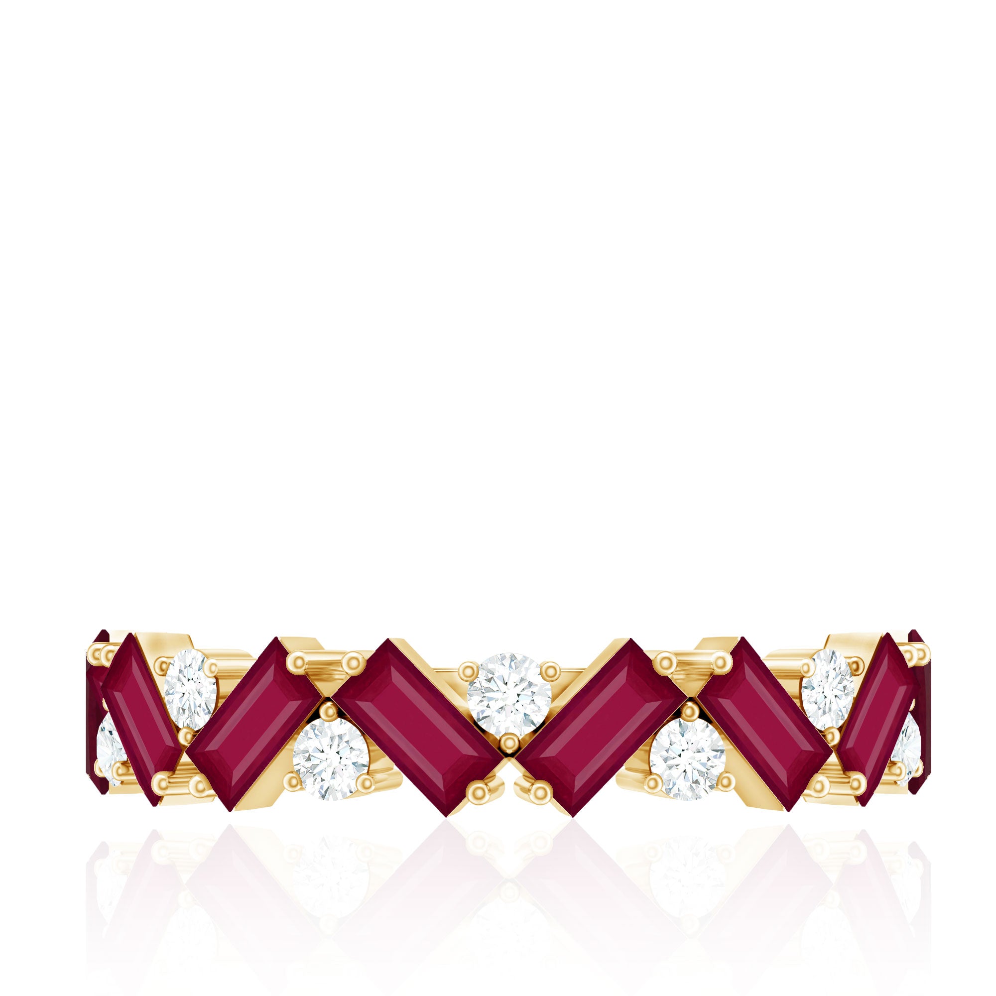 Turn heads while you flaunt this stunning Ruby Eternity Ring in your gorgeous hands. The Half Eternity Ring showcases Baguette Cut Ruby Gemstones and Round Cut Moissanite gemstones set in a zig zag pattern in prong setting. Mesmerizing Solid Gold Build makes this Eternity Ring for Women a perfect gift for surprising your precious one on valentines day.