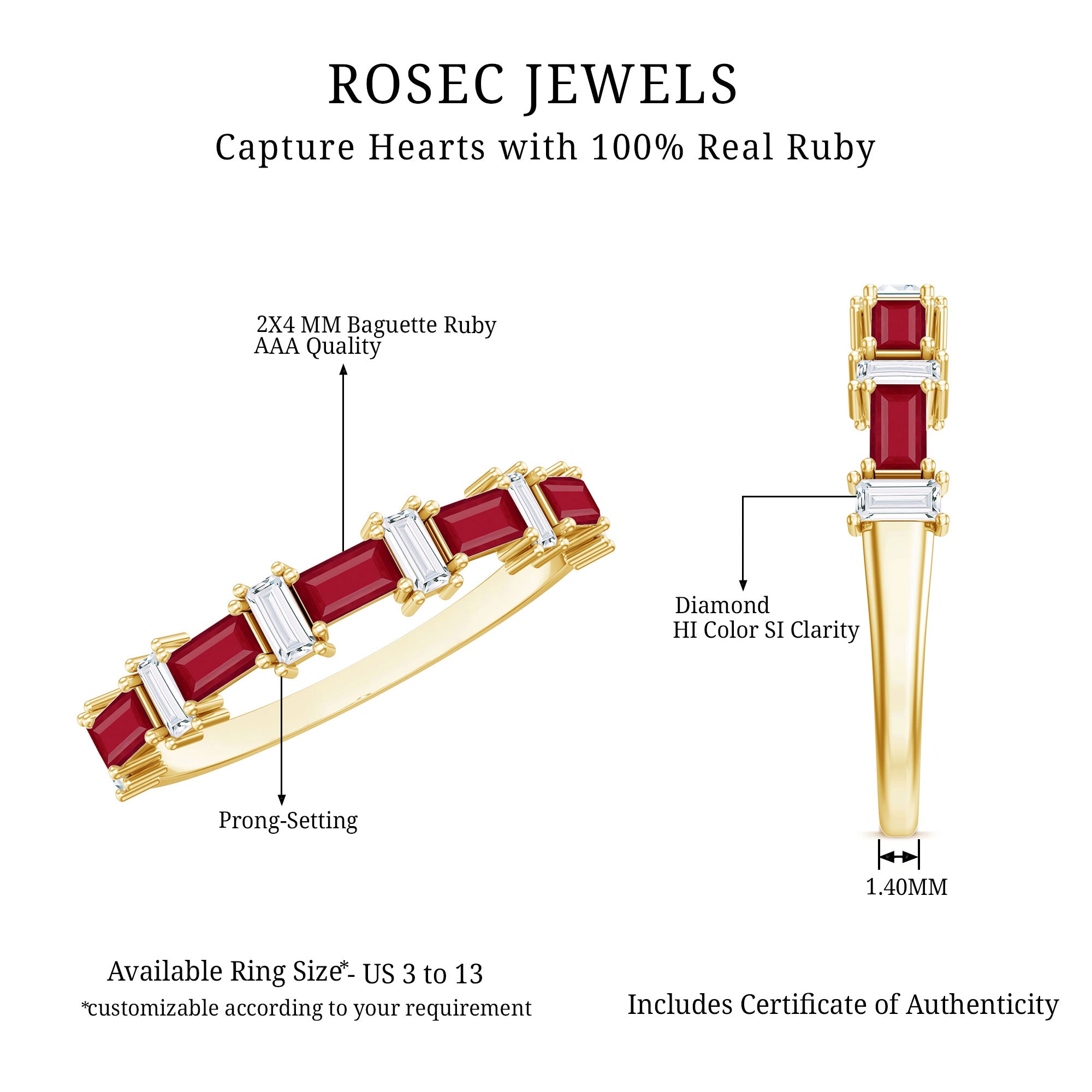 The Half Eternity Ring boasts Baguette Cut Ruby and Diamond Stone in Prong Setting, adding to its allure. The ring is expertly crafted in Gold, accentuating its beauty. This Semi Eternity Ring is an ideal gift for a special woman in your life, such as an anniversary or birthday gift.
