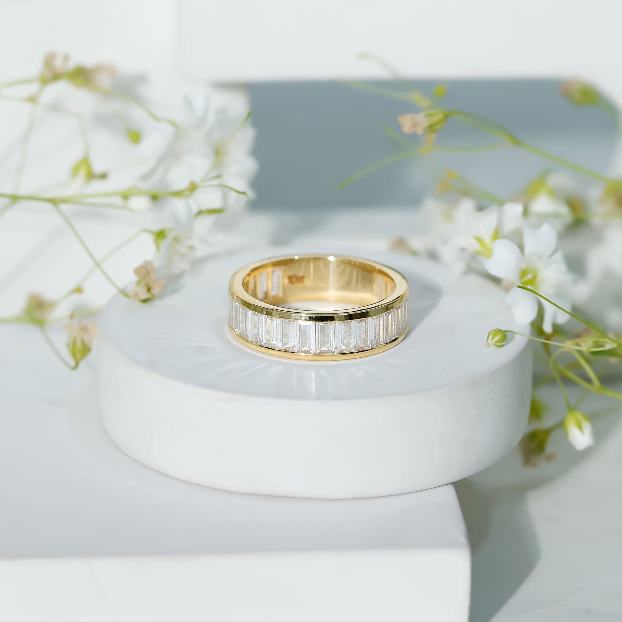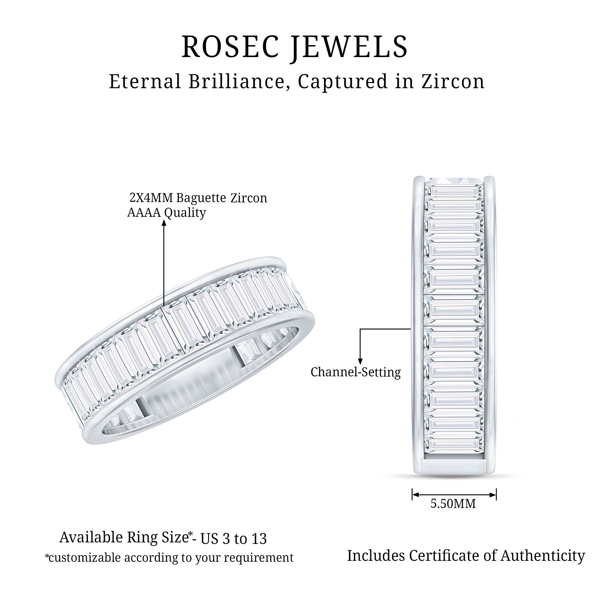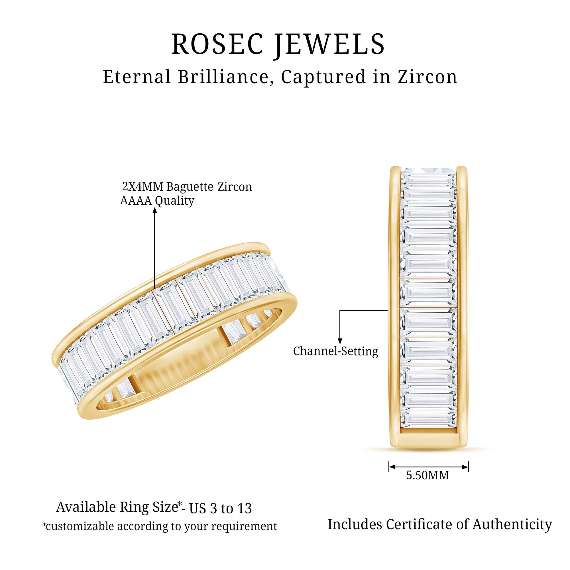 This Wide Band Ring is adorned with Baguette Cut Zircon in Channel Setting making it perfect jewelry for your wedding day.