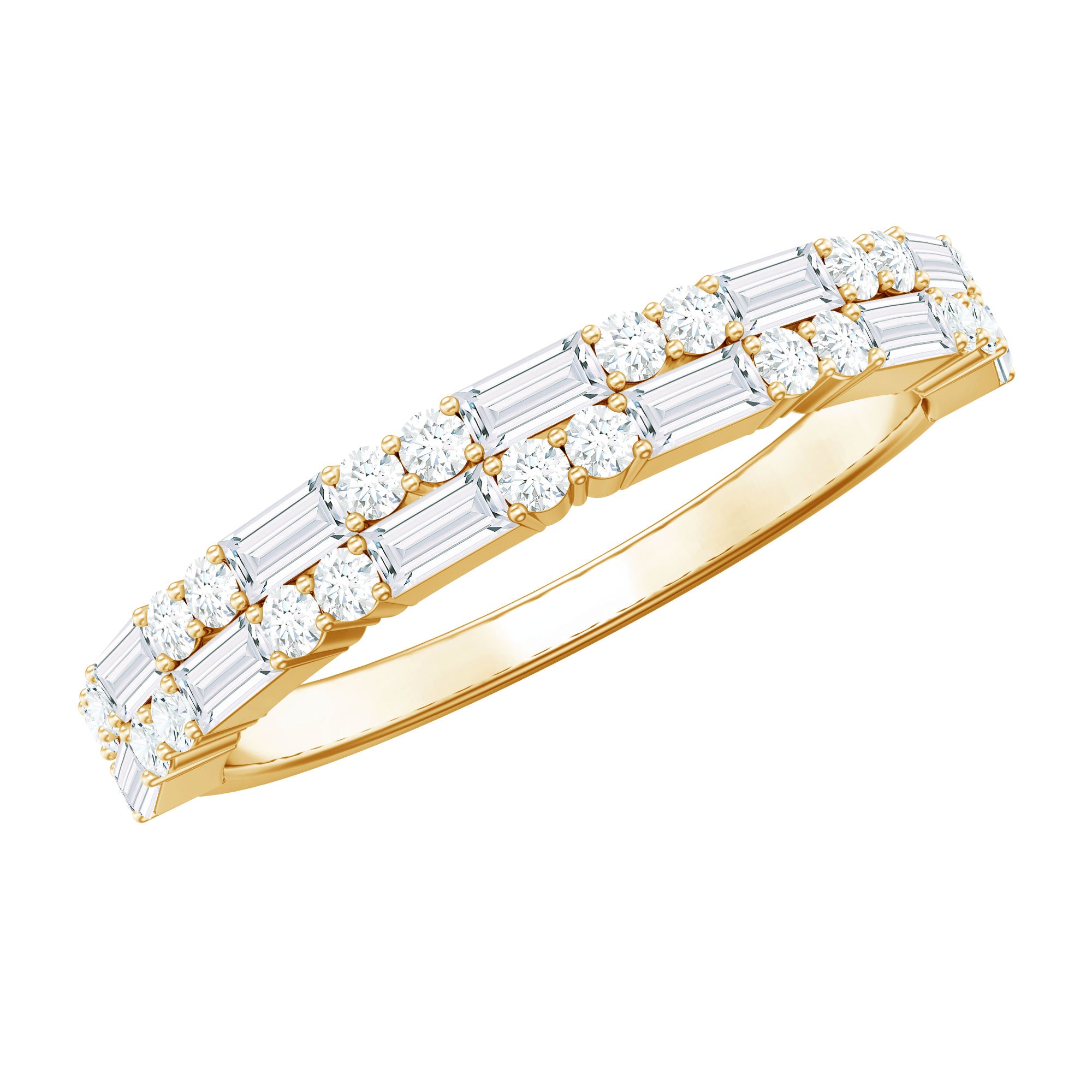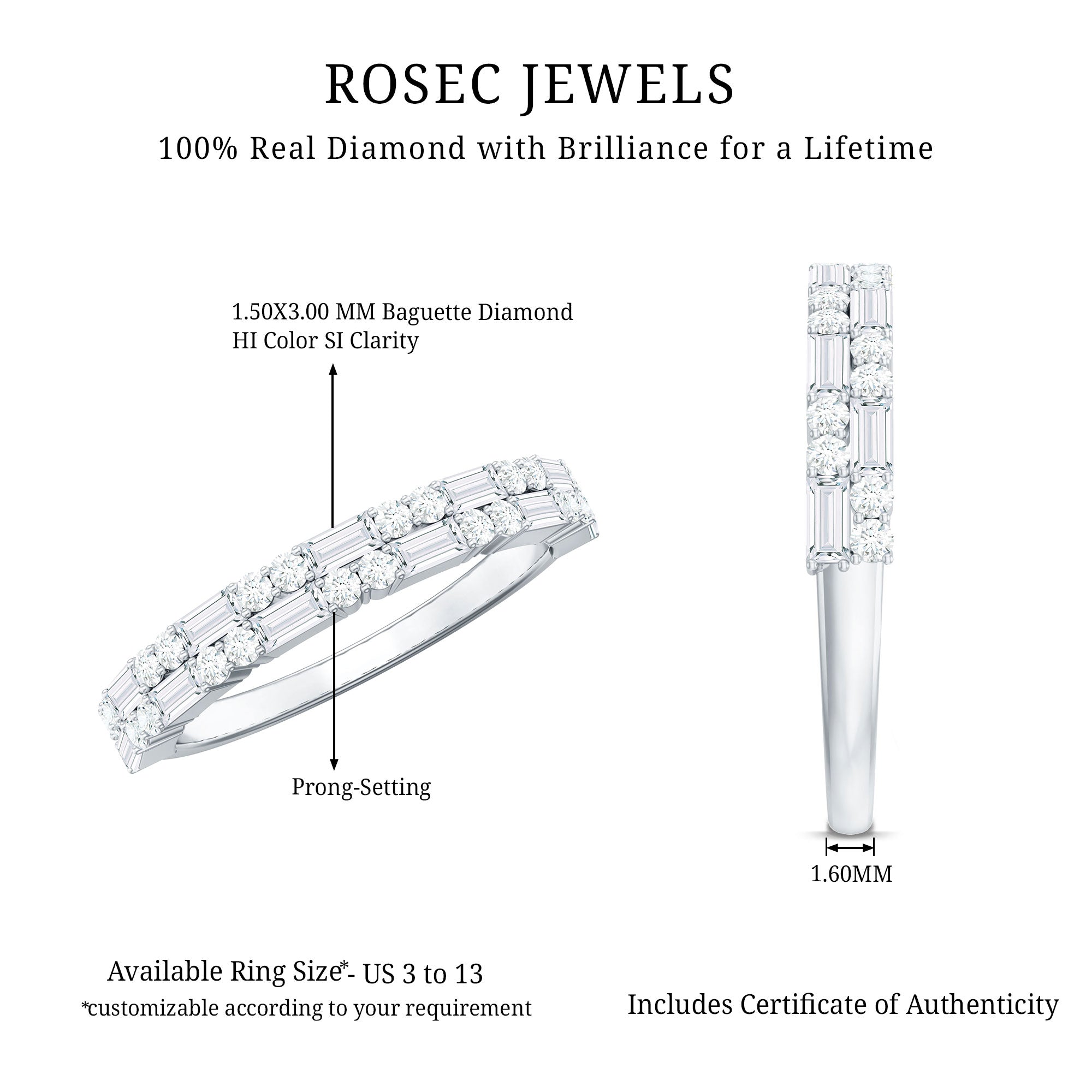 Your love is forever, and this baguette diamond half eternity ring is the perfect way to symbolize it. The ring features small sparkling baguette diamonds arranged in a half eternity band along with round shape shimmering Diamonds, representing your everlasting love. The prong setting ensures the safety and durability of the stones. This ring is sure to get more attention and make a statement, wherever you go.