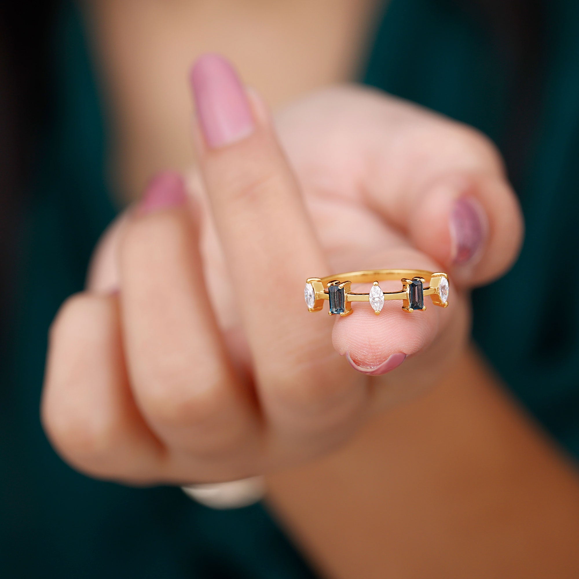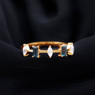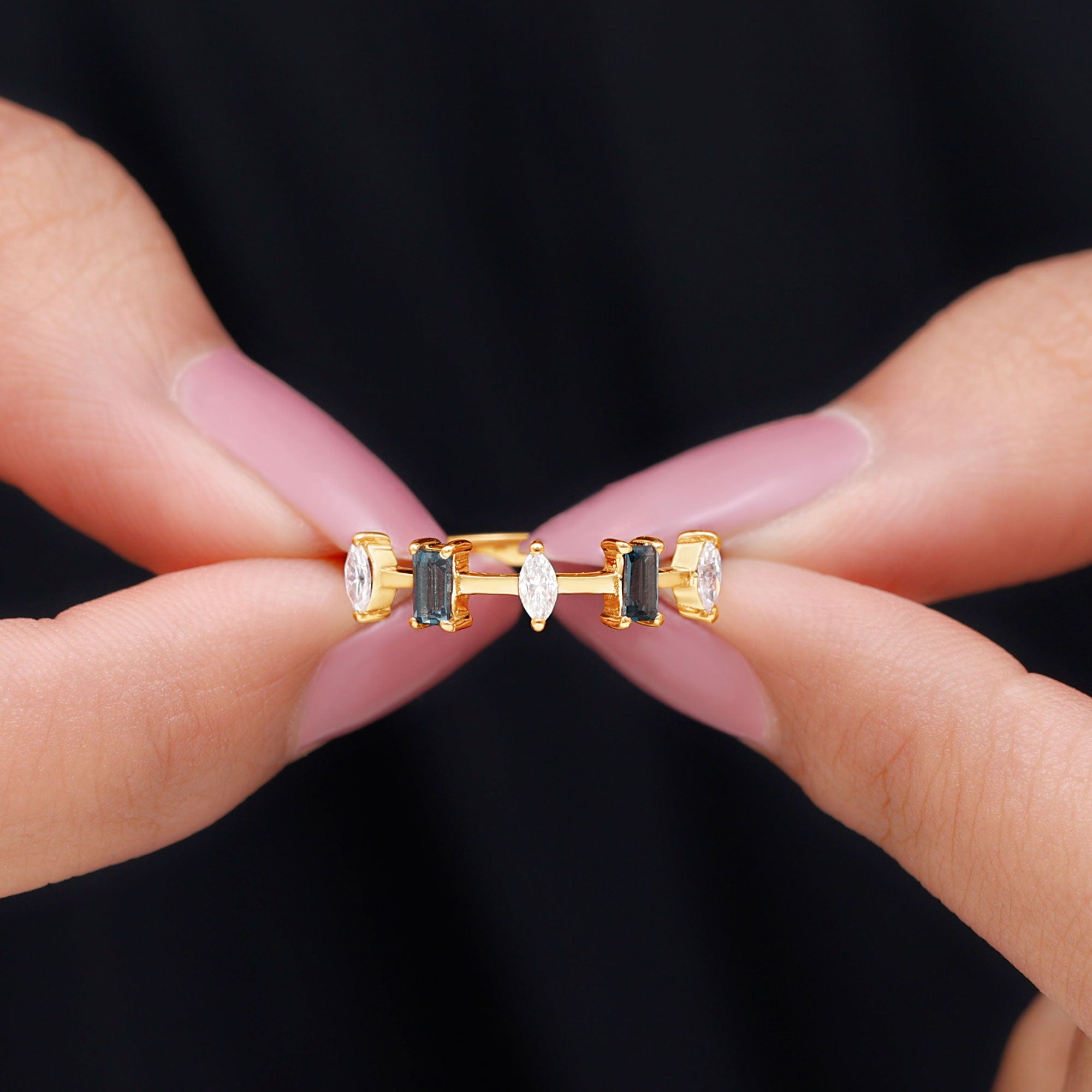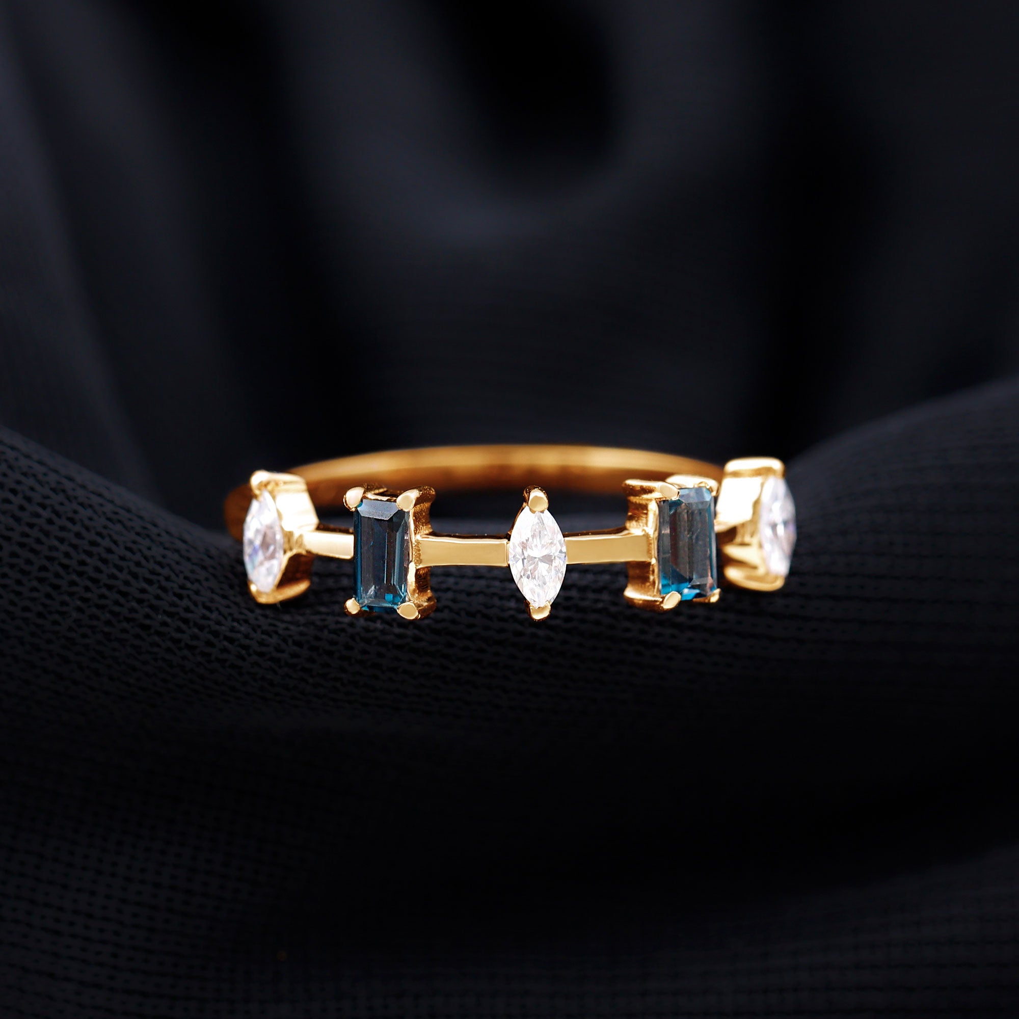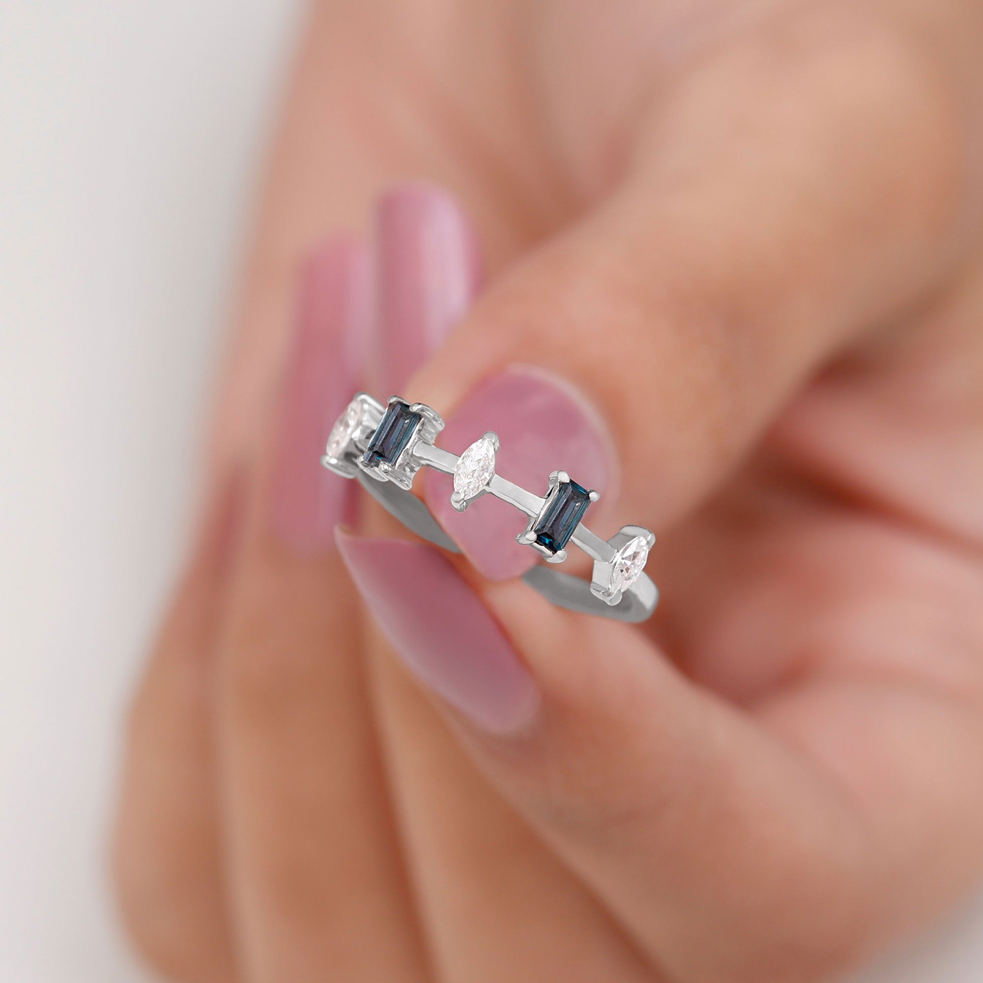 Enhance your appearance with the enchanting allure of this sophisticated Half Eternity Band, features an alternating design of Baguette Cut London Blue Topaz and Marquise Cut Diamonds, resulting in a subtle yet mesmerizing charm. Each London Blue Topaz gemstone boasts AAA quality, recognized for its royal blue hue that imparts a striking yet sophisticated element to the band. This Blue Topaz Wedding Band is crafted to be stackable, allowing for easy pairing with other rings or wearing it solo for a subtle yet impactful statement. Whether you choose it as a wedding band, an anniversary ring, or simply as a unique addition to your collection, its timeless design is appropriate for any occasion. Its captivating blue shade renders it a versatile accessory that enhances numerous outfits and jewelry combinations. This Stackable Eternity Band is ideal for individuals seeking a ring that harmonizes traditional style with contemporary design, while also embodying a personal touch through its potent gemstone. Meticulously crafted with a focus on detail, this Minimal Eternity Band symbolizes enduring elegance and strength. It serves as a meaningful gift for anniversaries, weddings, or any occasion you wish to commemorate with something genuinely special.