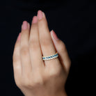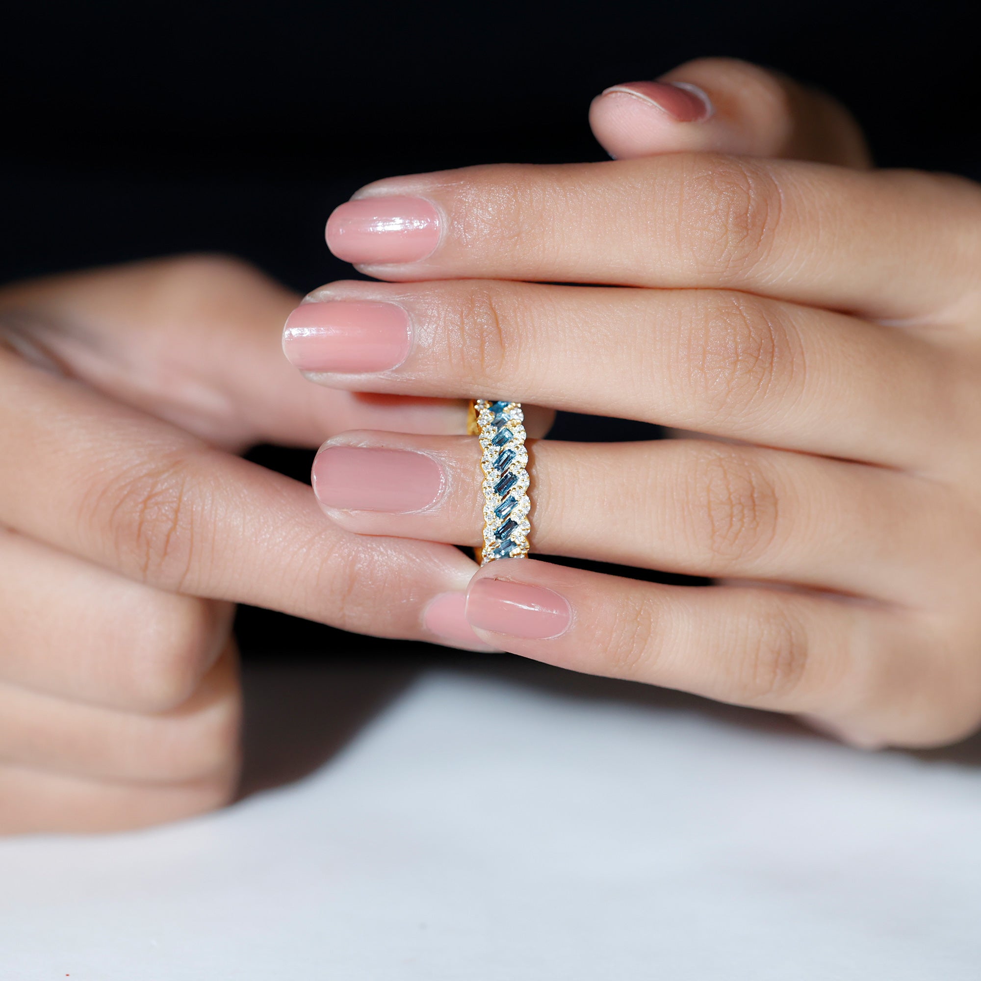 Present this stunning Blue Topaz Eternity Ring to the one you cherish, elegantly expressing your love and devotion. This ring features AAA quality Baguette-cut London Blue Topaz alongside Hi-Si quality round Diamonds, artfully arranged in a design where the Blue Topaz forms the central trail, complemented by a parallel trail of Diamonds. This Full Eternity Ring is an ideal choice for your beloved, as Blue Topaz symbolizes affection, tenderness, loyalty, and righteousness. Our exquisite Topaz and Diamond Eternity Ring is packaged in a box, allowing for safe storage when not being worn. Make a striking yet sophisticated impression with this captivating Topaz Wedding Band. It can be effortlessly worn alone or combined with other rings for a layered appearance. Offered in a range of metal colors, types, and US ring sizes from 3 to 13, this Baguette Wedding Band can be customized to perfectly align with your style and comfort. Timeless in its design and meticulously crafted, this Designer Eternity Band serves as a sparkling symbol of love, strength, and commitment.