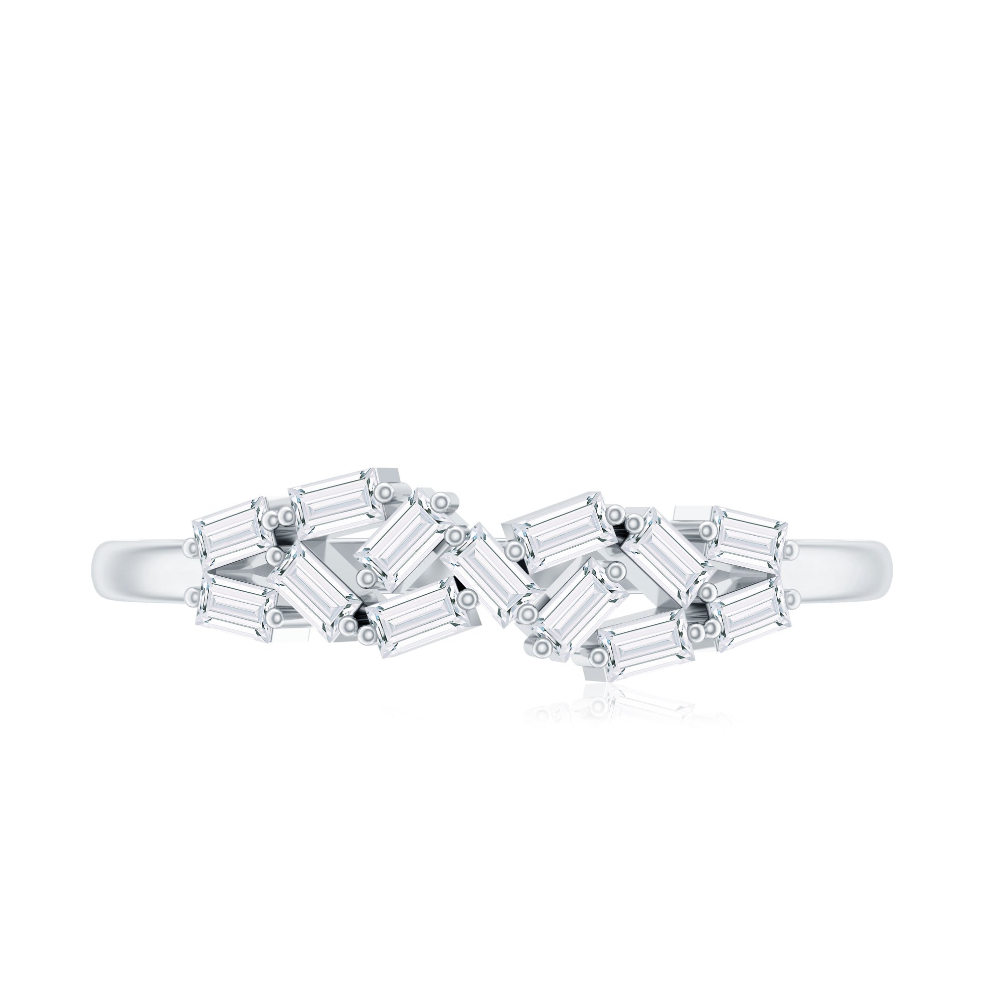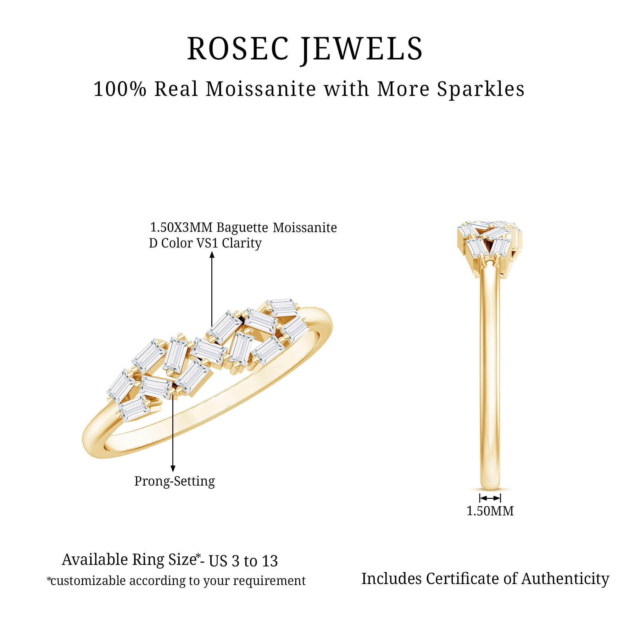 This Moissanite Cluster Ring is a graceful symbol of love, promise, and individuality. Designed with precision and simplicity, it features baguette cut D-VS1 quality Moissanite stones arranged in a distinctive cluster, each securely set in prong setting. The stones form a striking pattern, creating a modern and artistic look while keeping the overall design classy. Perfect for those who love understated elegance, this Baguette Moissanite Ring beautifully blends minimalism with meaning. Whether given as a promise ring, worn to mark a personal milestone, or chosen as a beautiful gift for her, it offers both style and sentiment. The simple band makes it comfortable for daily wear, while the clustered arrangement adds character to this minimal piece. Thoughtfully crafted to mark a commitment, this Moissanite Promise Ring for Her stands out through its simplicity.