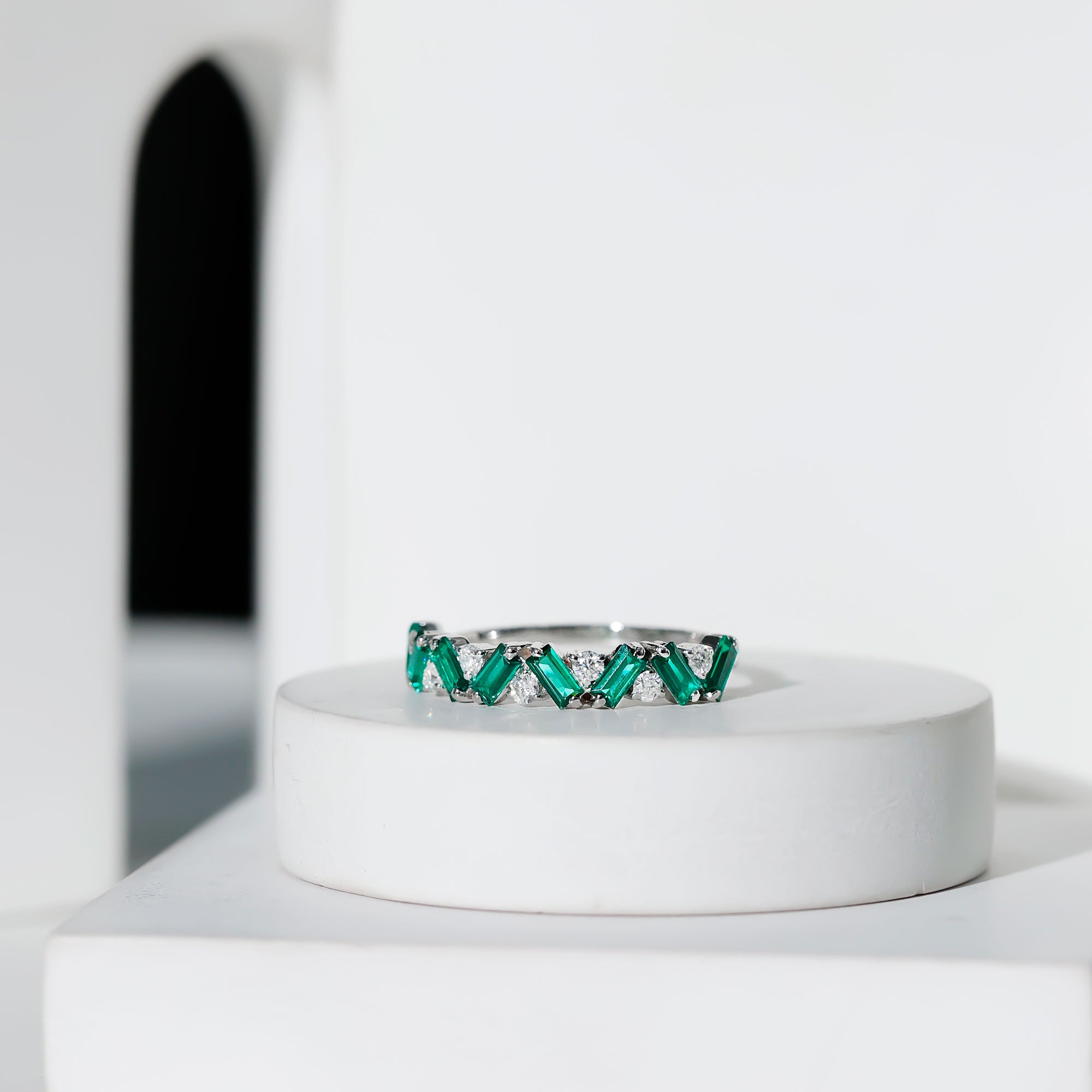 Baguette Shape Lab Grown Emerald Half Eternity Ring with Moissanite