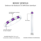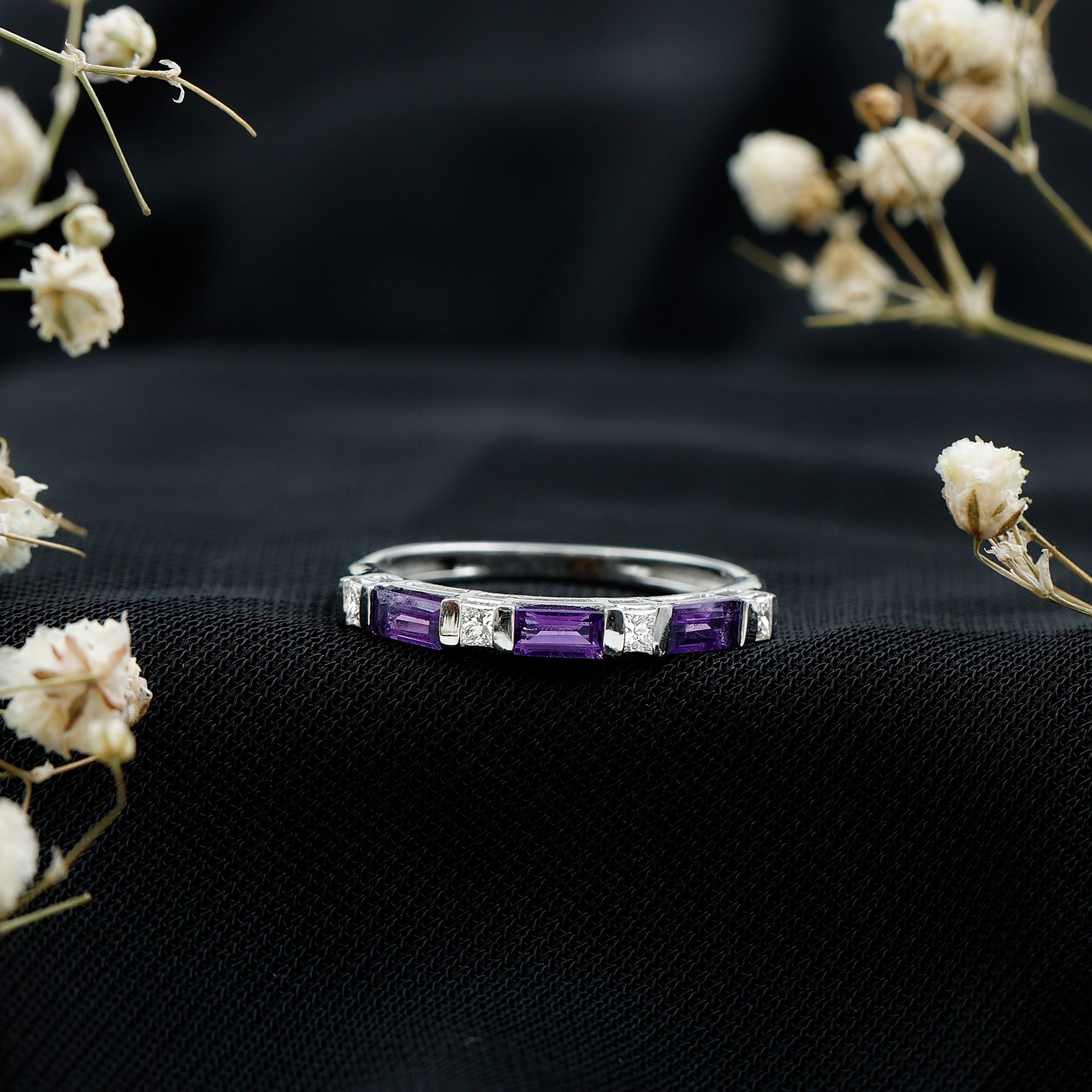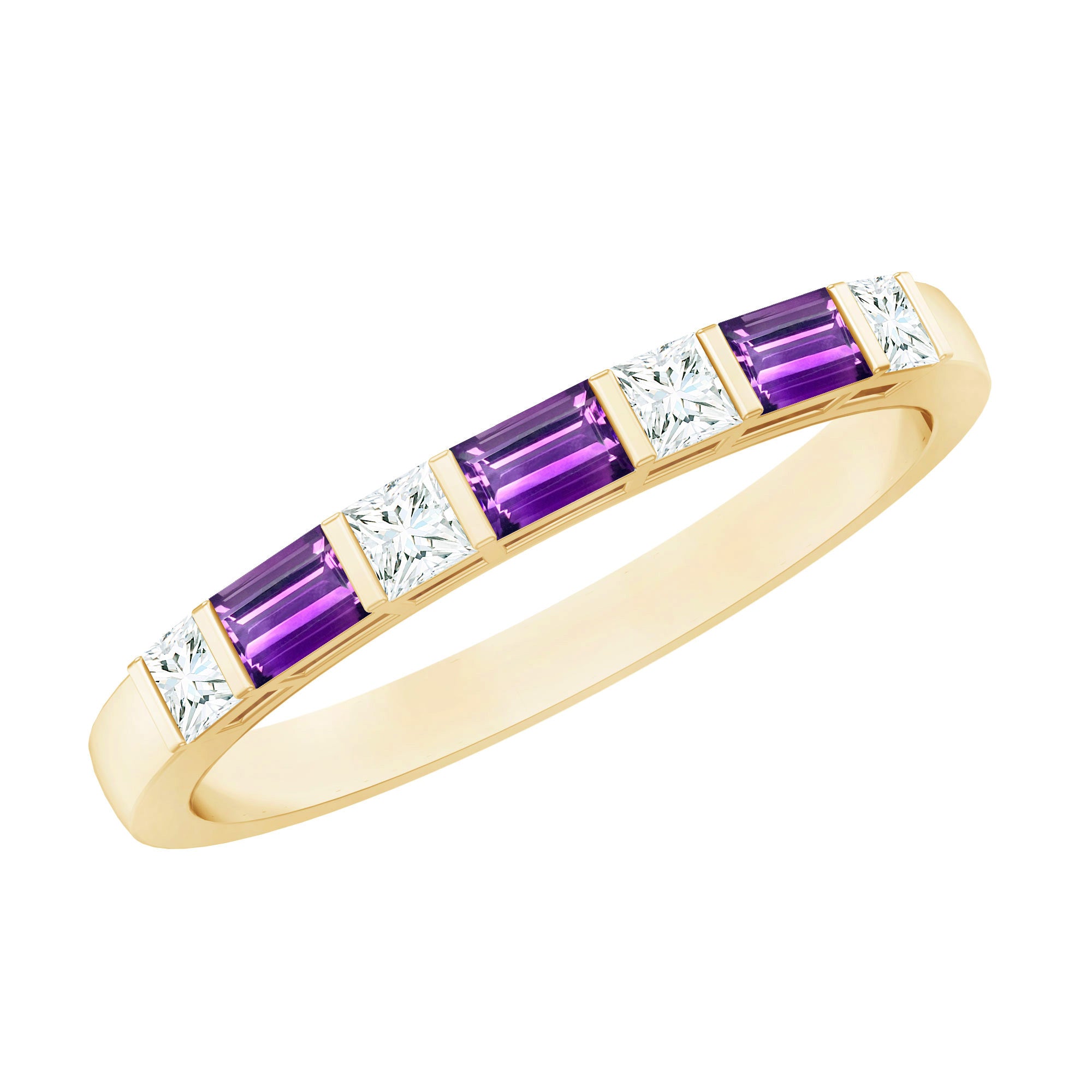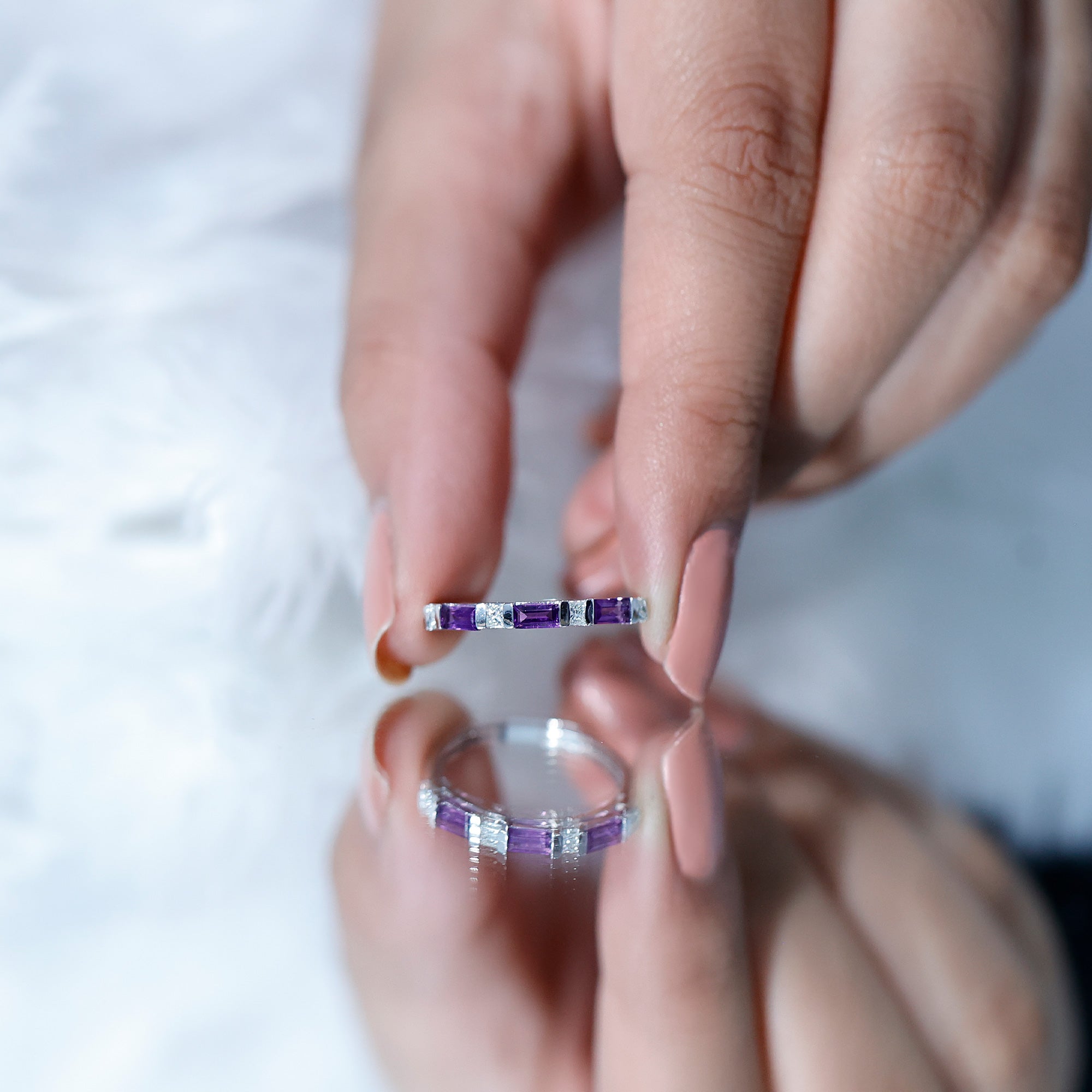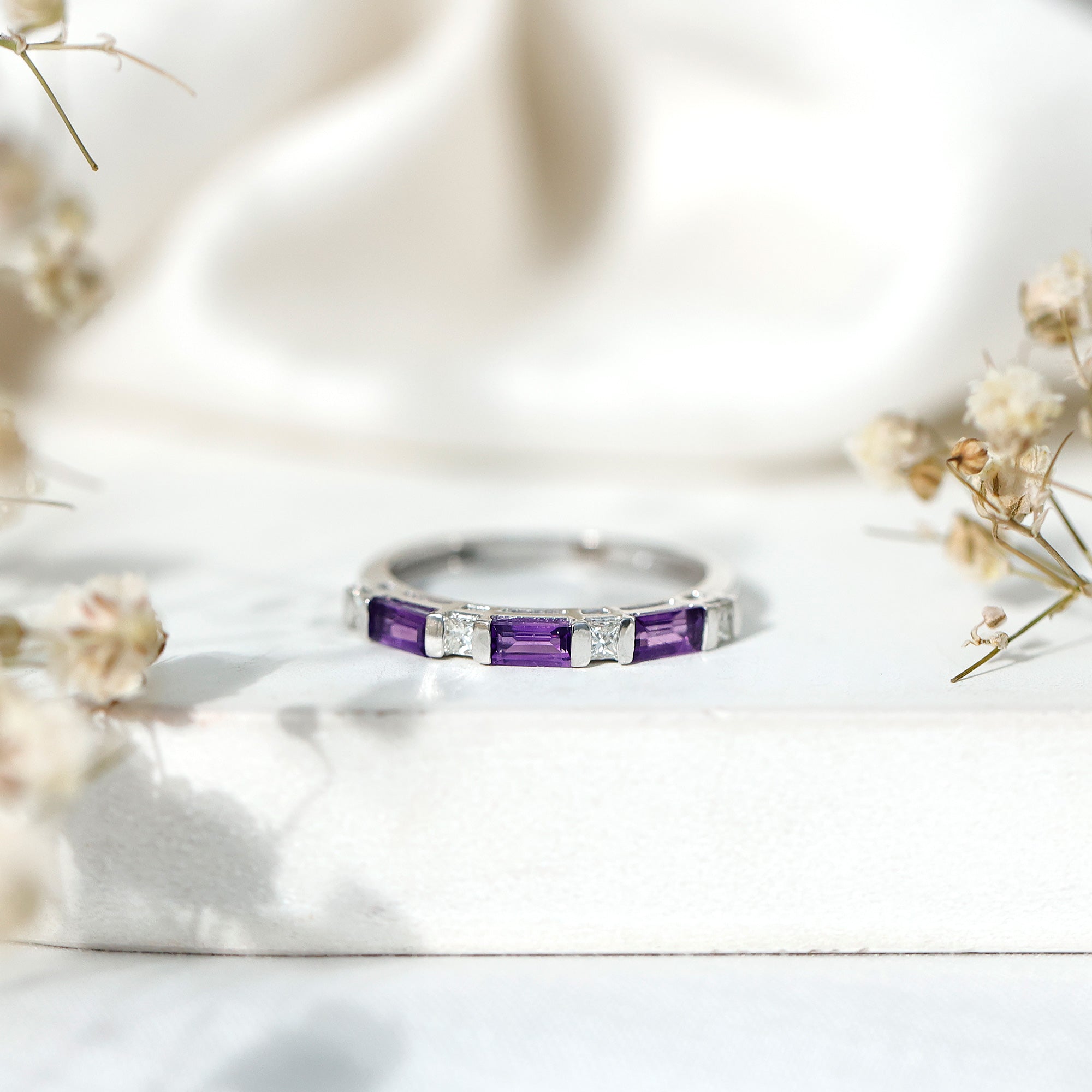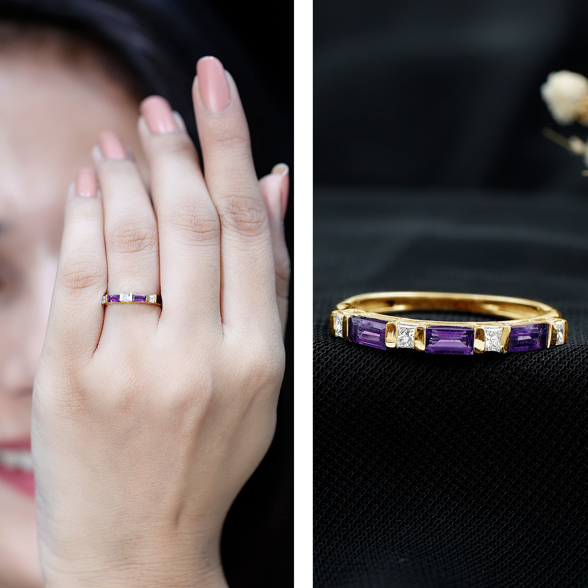 Mark your special moments with quiet elegance and timeless charm. This Wedding Anniversary Band is designed for those who love meaningful details. Featuring a unique pattern of baguette cut amethyst stones and princess cut lab grown diamonds, the Half Eternity Band combines color and sparkle in a beautifully balanced way. Each stone is carefully placed in secure bar setting, offering both style and durability. The alternating design over half of the band brings just the right amount of brilliance while keeping the look simple and refined. The simple band ensures a comfortable fit, making it ideal for everyday wear or stacking with other rings for a layered look. Whether you are celebrating an anniversary, a milestone, or simply want a meaningful gift, this Amethyst Band Ring offers a modern twist on classic elegance. Its subtle design makes it easy to wear alone or pair with your engagement or wedding ring. This Amethyst and Diamond Ring is a reminder of love, growth, and shared memories. Simple and full of meaning, it is a piece you will cherish for years to come.