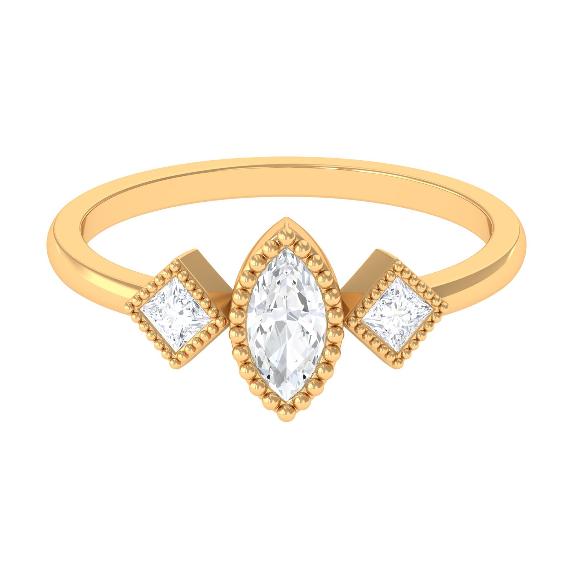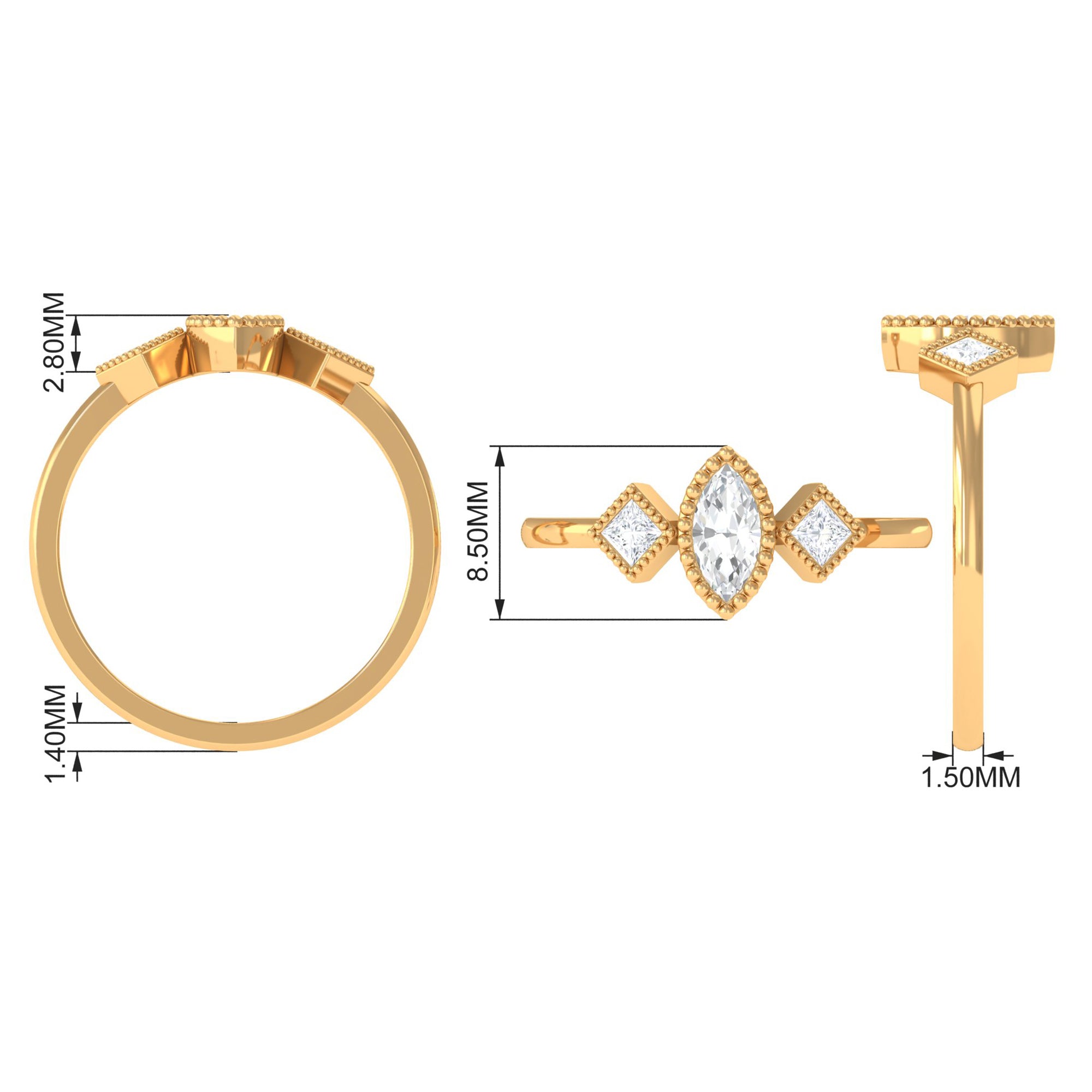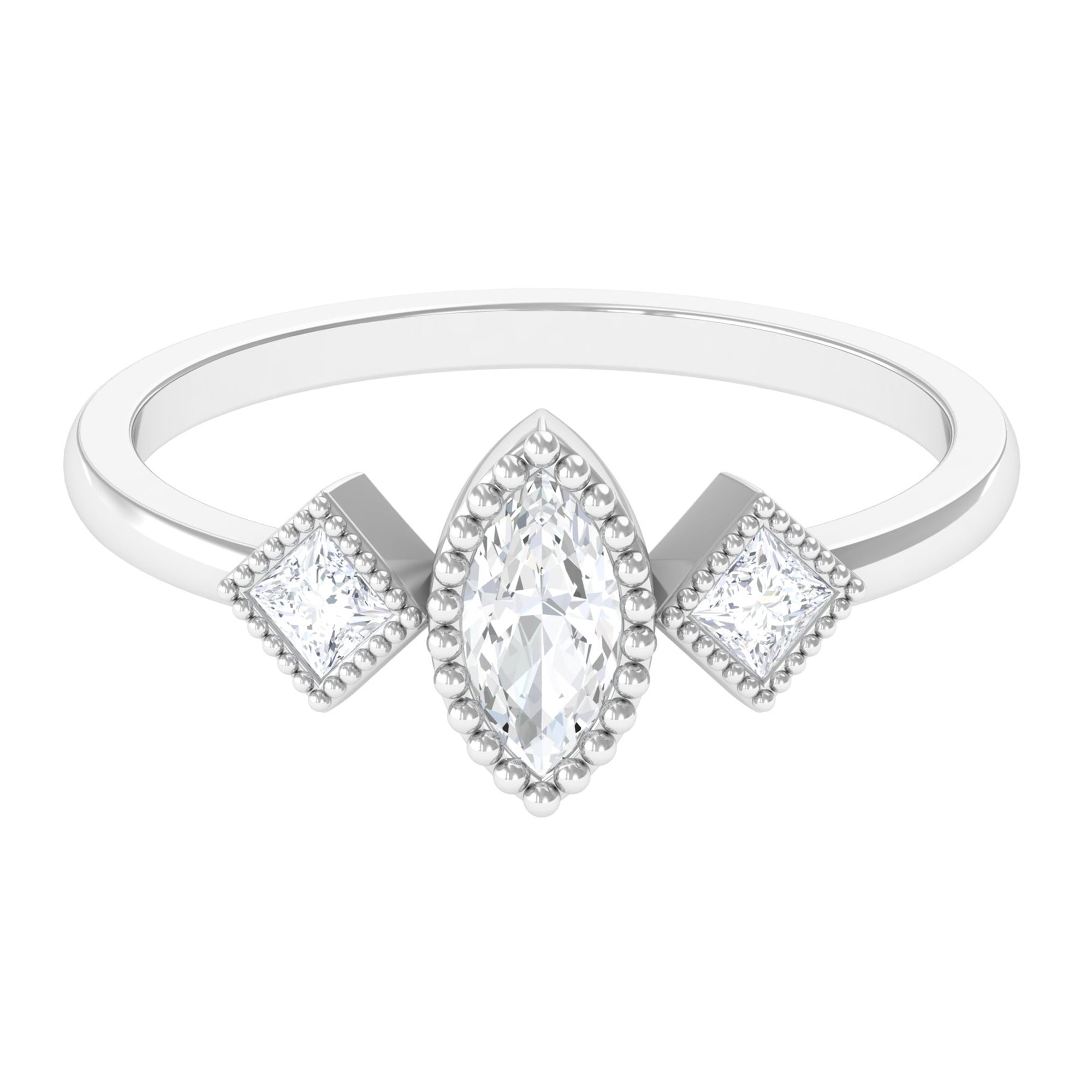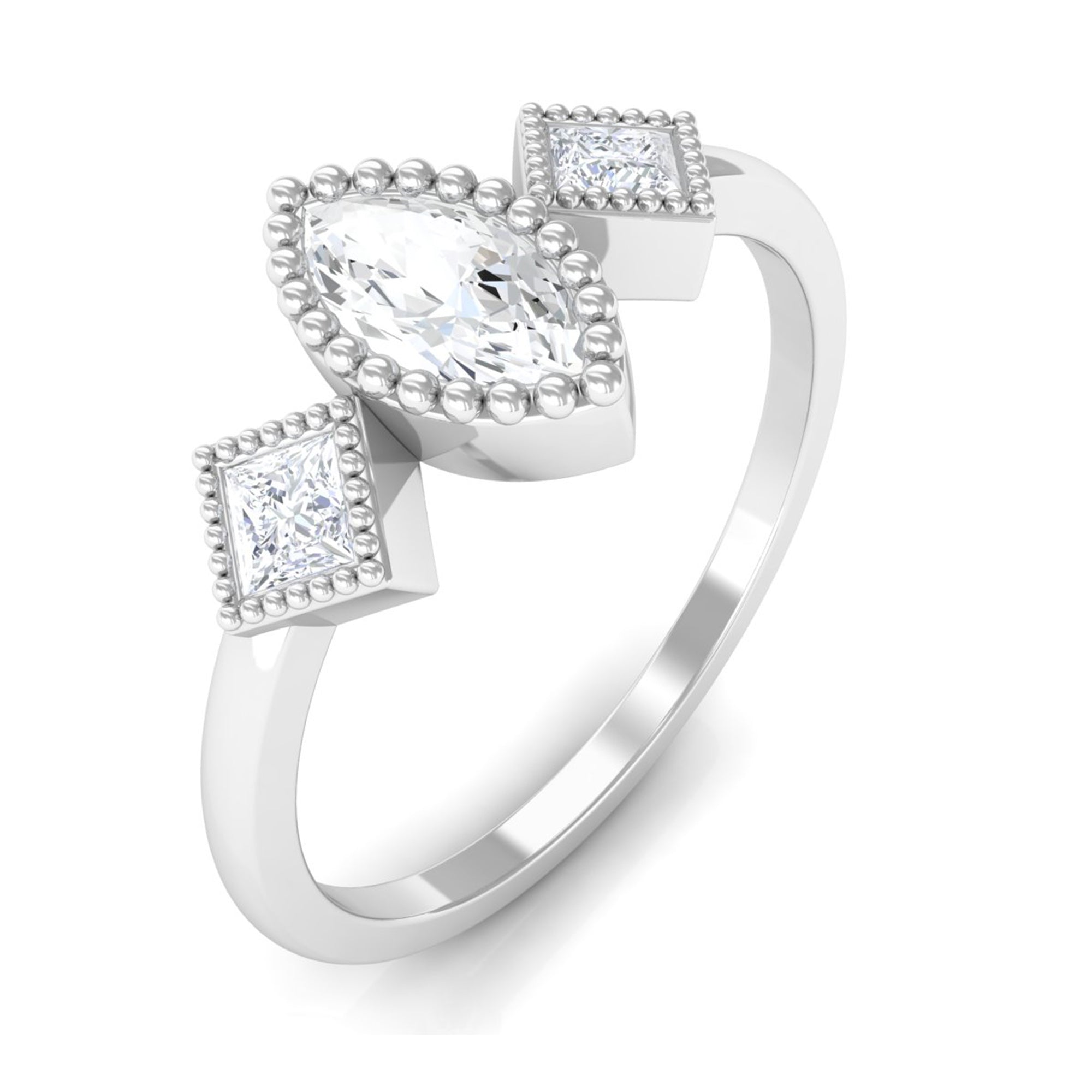 Our Three Stone Engagement Ring features exquisite marquise and princess cut cubic zirconia set in beaded bezel setting, telling the past, present and future tale of your relationship. Adorn her hand with this beautiful CZ Engagement Ring and lets your story shine. Wear this elegant and glamorous Simple Engagement Ring to make an unforgettable impression.