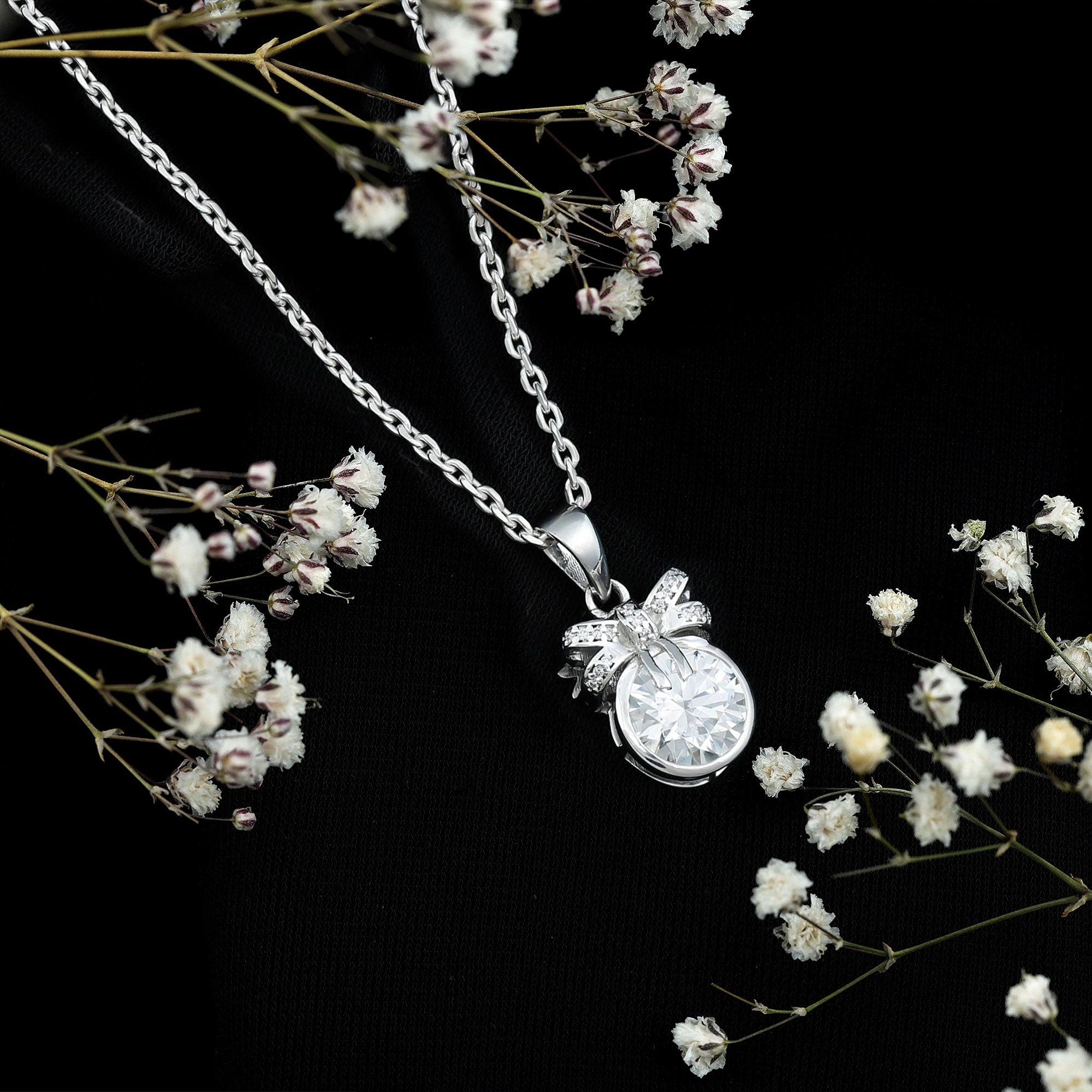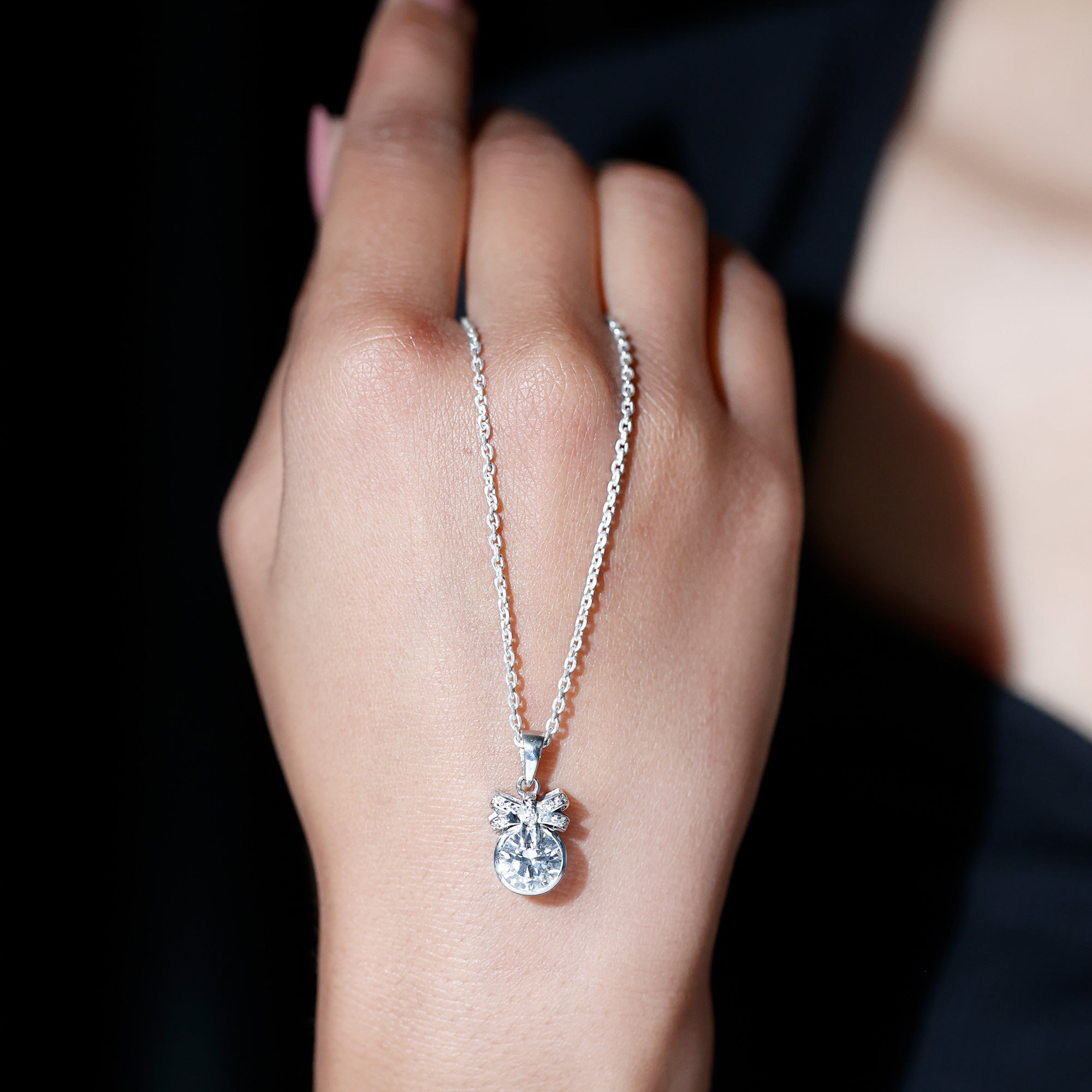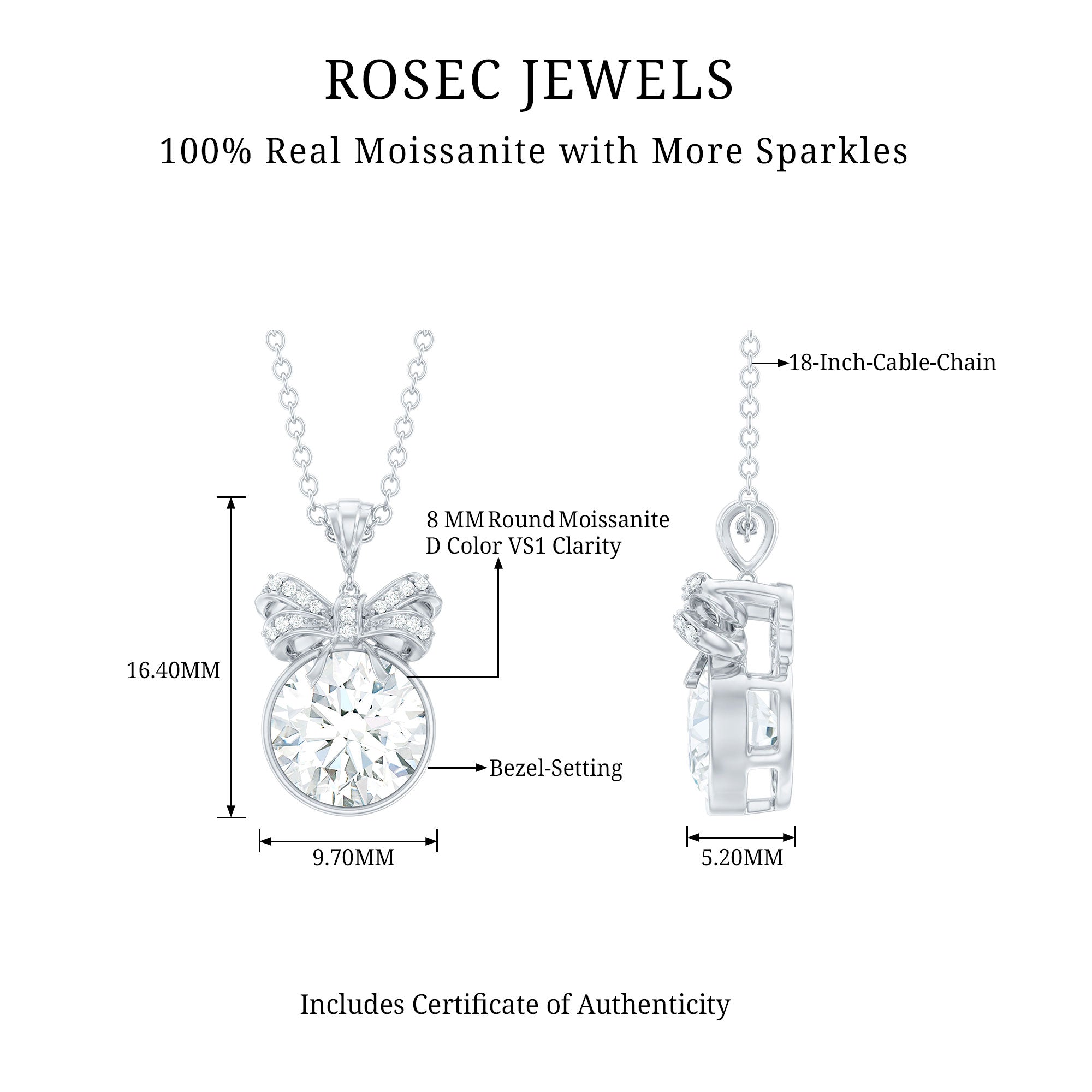 Adorn your neckline with this Moissanite Pendant Necklace, crafted with 14K White Gold Plated Silver. The pendant features an 8 MM Round Shape Moissanite securely placed in Bezel Setting and topped with a bow motif studded with smaller Moissanite. This Round Pendant beholds the classic shine of D-VS1 Quality Moissanite that is perfect to complete the look for the special day. This Chain and Pendant can be presented to your beloved on a special occasion, such as an anniversary or birthday.