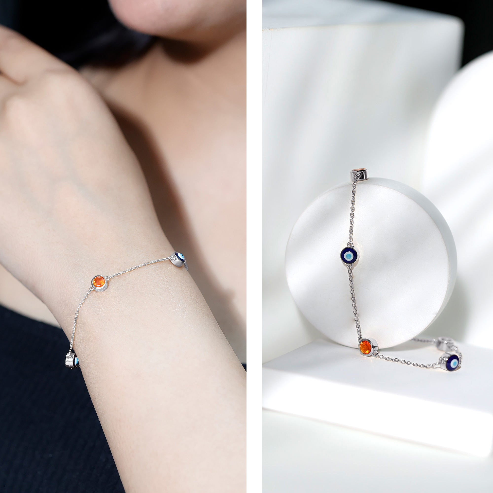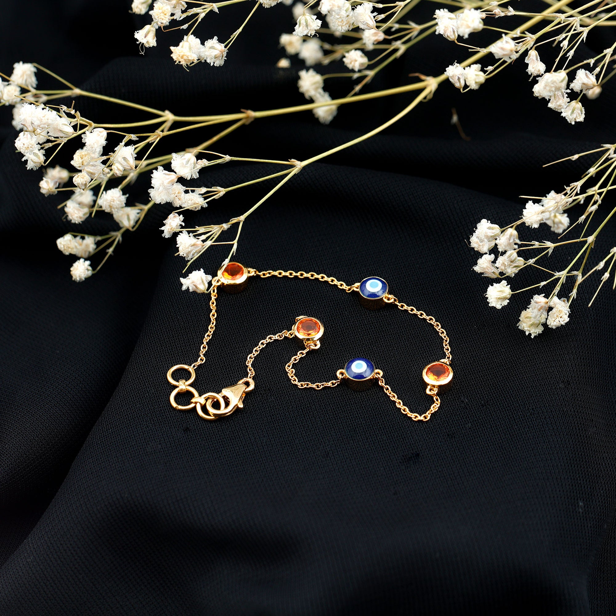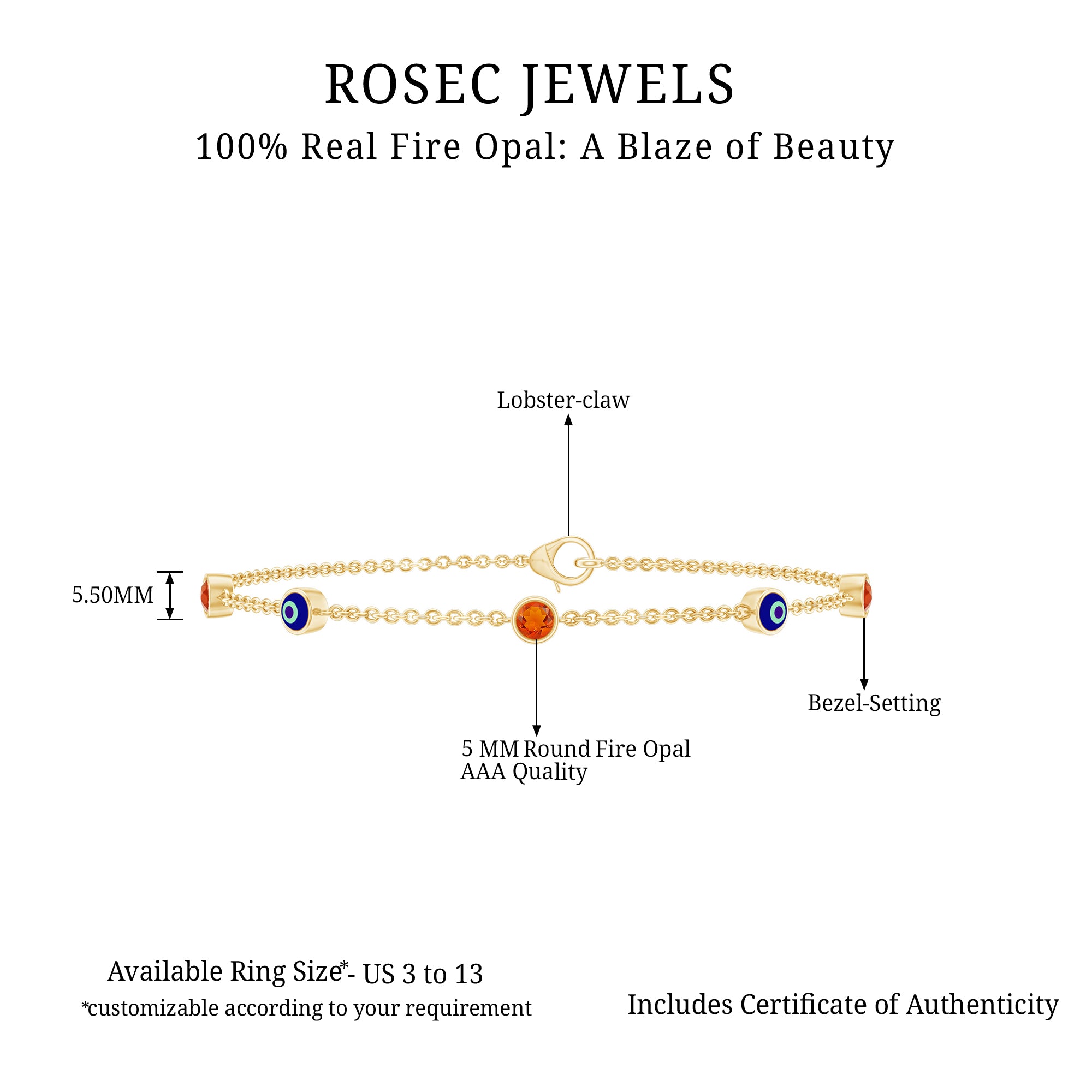 Make her feel special by gifting this protection Evil Eye Bracelet embellished with Round Shape Fire Opal Gemstones set in Bezel Setting and Evil Eye motifs in an alternating pattern. This October Birthstone Bracelet is the perfect combination of elegance and charm that embraces the sense of illumination. This delicate Chain bracelet sprinkles magic into day-to-day life with the classic shine of AAA quality Fire Opal. The secured Lobster Clasp is there so that you remain stress free while carrying it. This beautiful Evil Eye Bracelet will be delivered in premium-quality packaging for safe and secured storage.