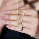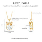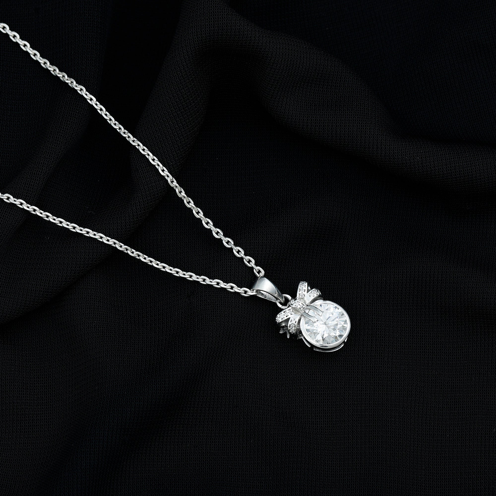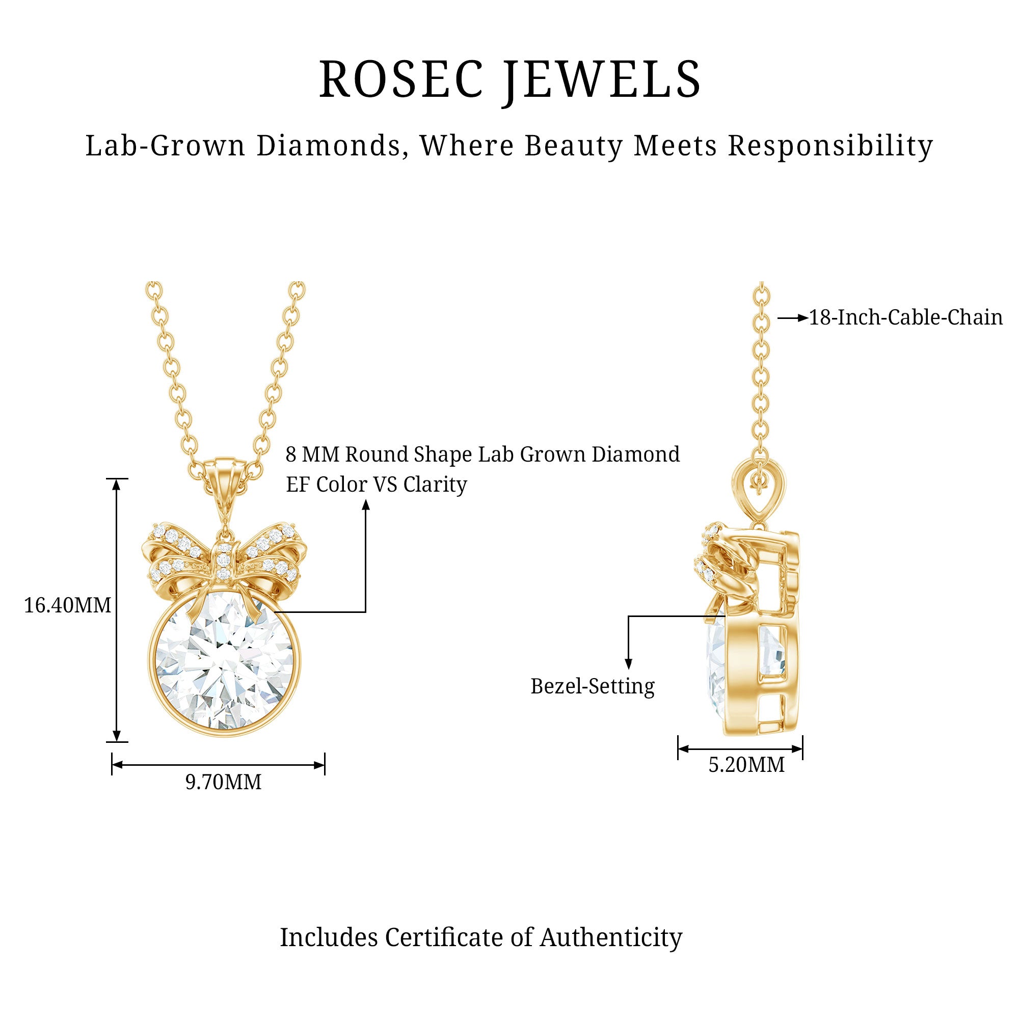 A timeless treasure for the woman who wants to shine brightly on special occasions, this Diamond Bow Necklace is a perfect blend of elegance and sparkle. It features an 8 MM round shaped diamond in the center set in bezel setting, above this centerpiece a dazzling bow motif is placed, encrusted with dainty diamonds, adding a touch of femininity and charm. The gracefully curved ribbons of the bow enhance its luxurious appeal, while the intricate bail makes sure that this Solitaire Pendant rests on your neckline seamlessly. Designed for versatility, this 2 CT Diamond Necklace is an ideal choice for bridal wear, remarkable celebrations, or even as a refined statement piece for elegant evenings. Plus, it is curated with lab grown diamonds so it offers not only brilliance but also an ethical choice for the modern woman.