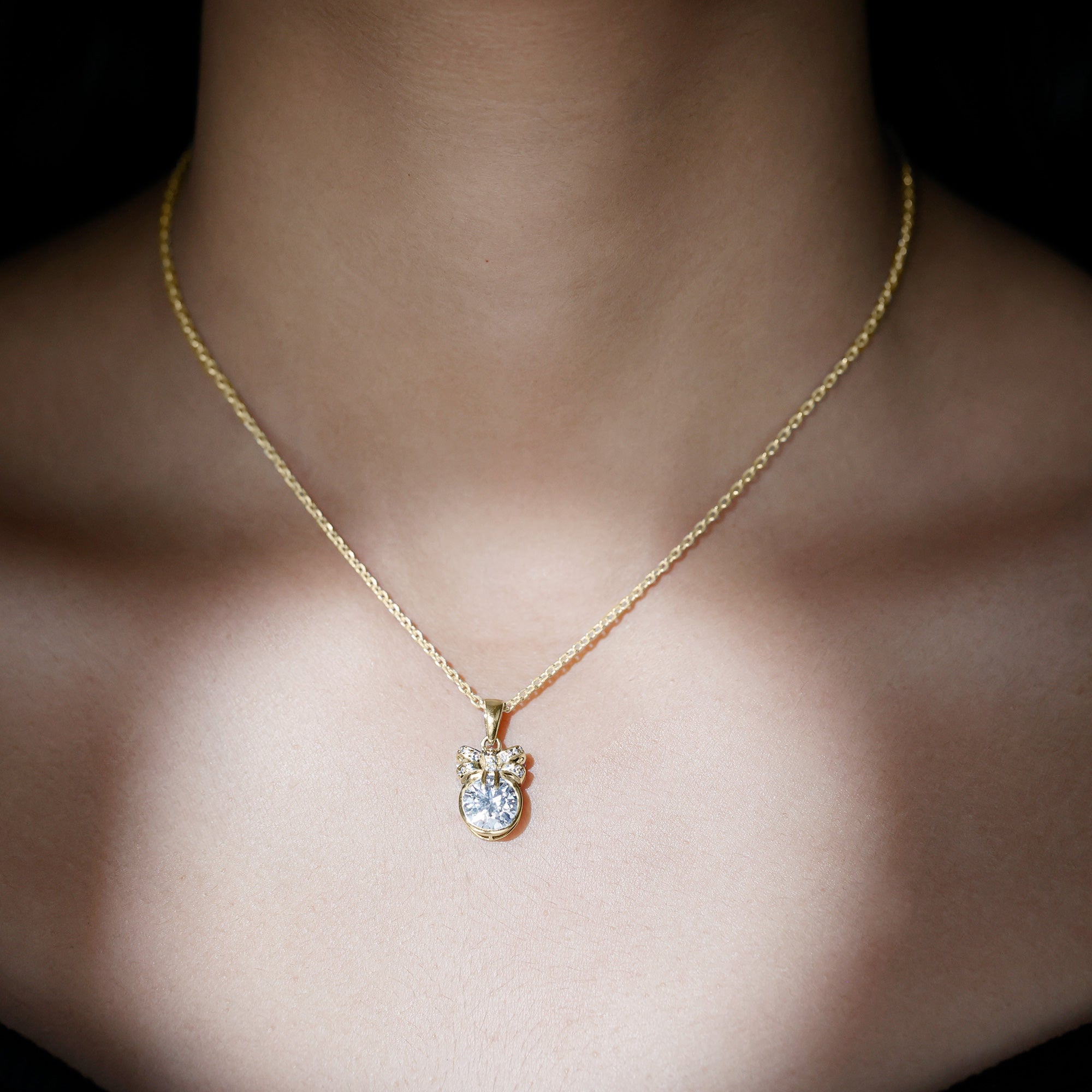 Bezel Set Lab Grown Diamond Solitaire Necklace With Cute Bow