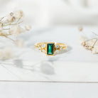 Looking for a ring that is unique, beautiful, and says ‘forever’ without saying a word? You just found it. Mark your love with this uniquely designed Lab Created Emerald Promise Ring, thoughtfully crafted to make every moment feel timeless. Made in 14K yellow gold plated silver, this elegant Commitment Ring for Women brings together modern beauty and ethical craftsmanship in one meaningful piece. At the center of the design sits a striking baguette cut lab created emerald set in bezel setting. Enhancing the emerald are trios of round lab grown diamonds on either side, also secure in bezel setting. These trios represent the past, present, and future of your journey together, making it a truly romantic choice. Each stone in this Emerald and Diamond Ring is ethically lab grown, making it a conscious choice for those who value both beauty and sustainability. The slim, polished band provides a subtle contrast to the bold geometry of the centerpiece, ensuring that the overall design remains elegant, wearable, and timeless. Whether it is a promise, a proposal, or a personal milestone, this Pre Engagement Ring tells a story of commitment and style.