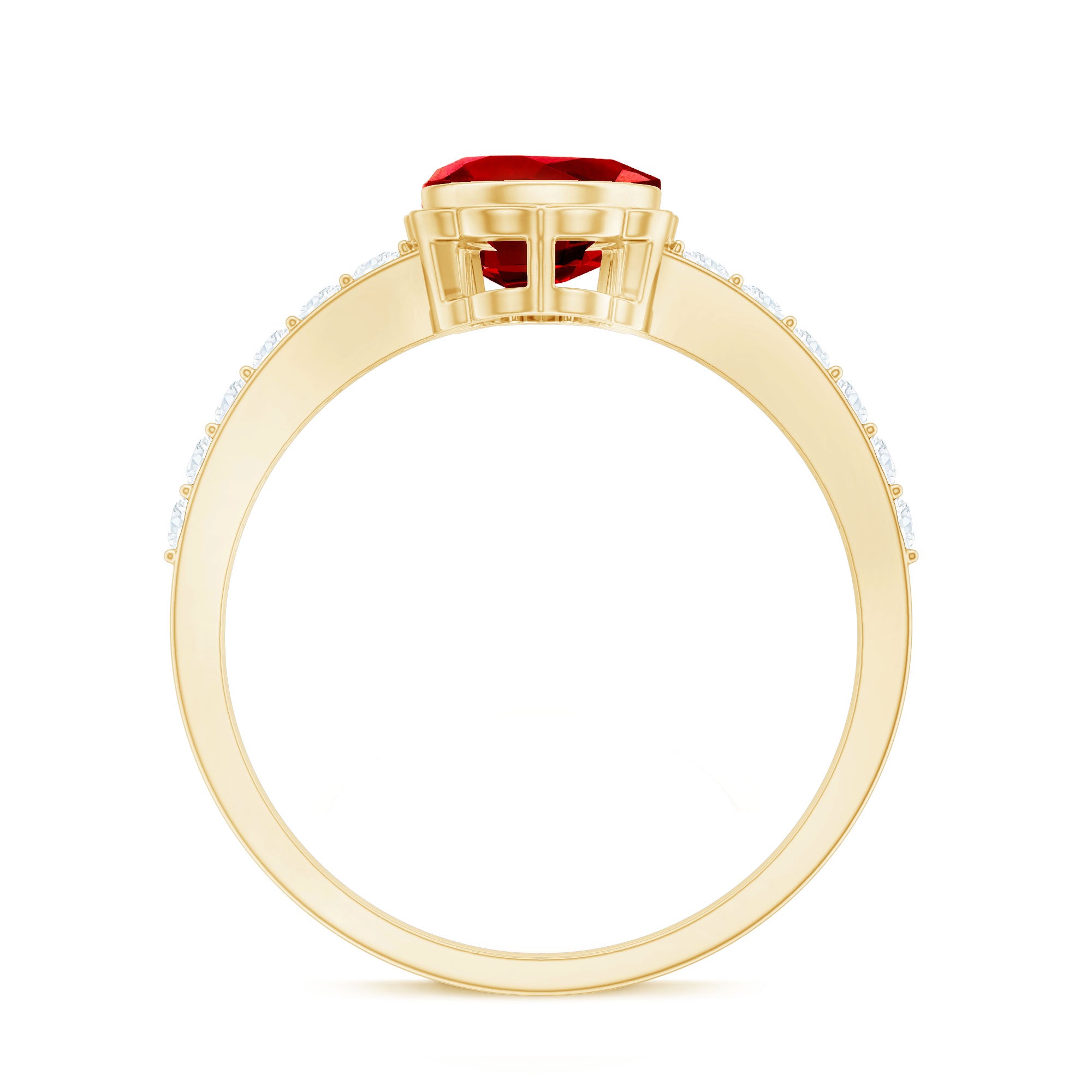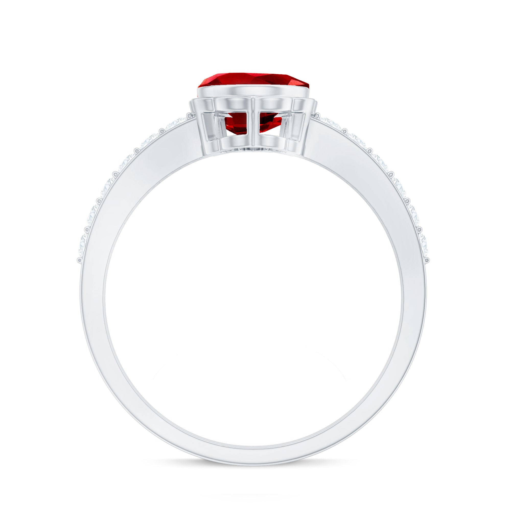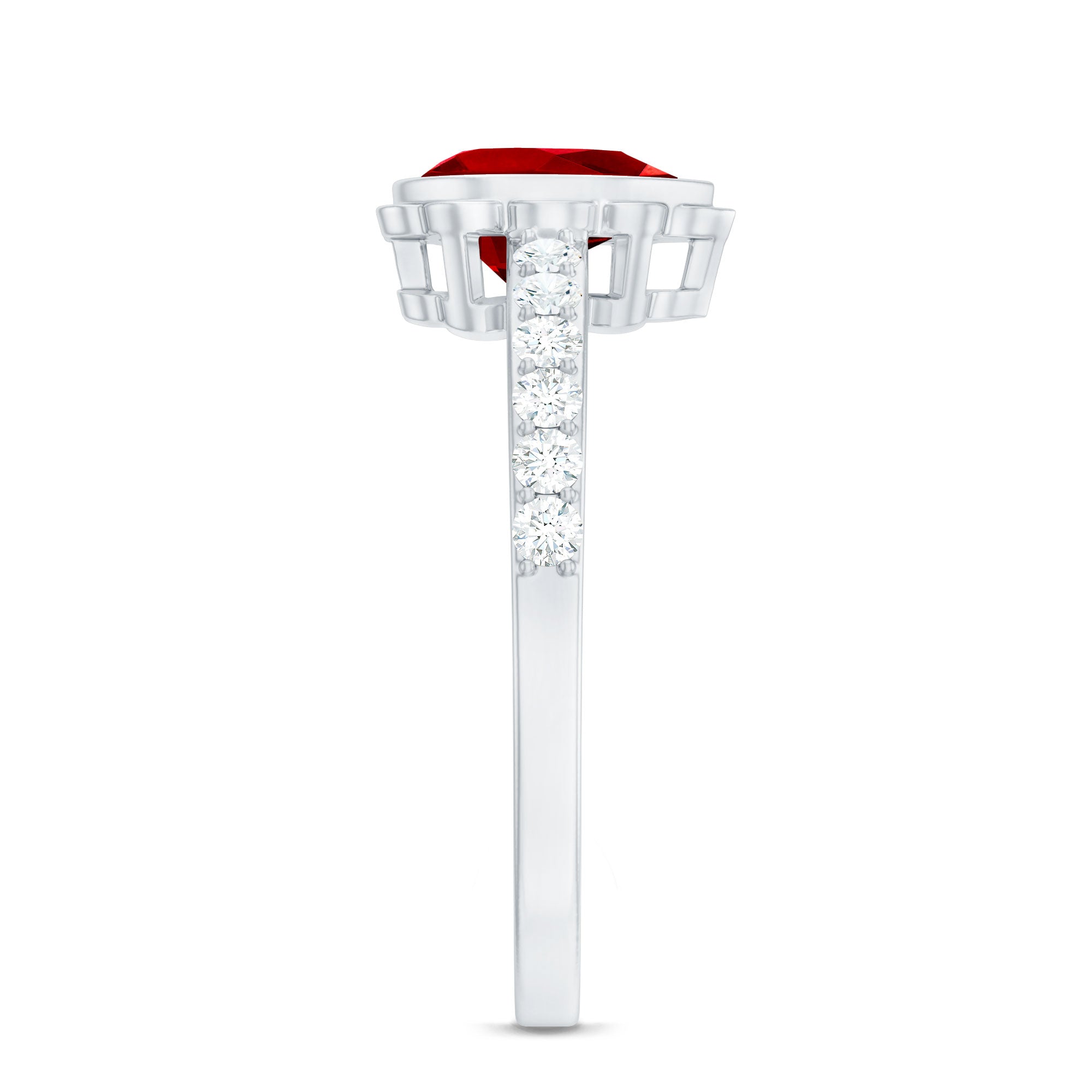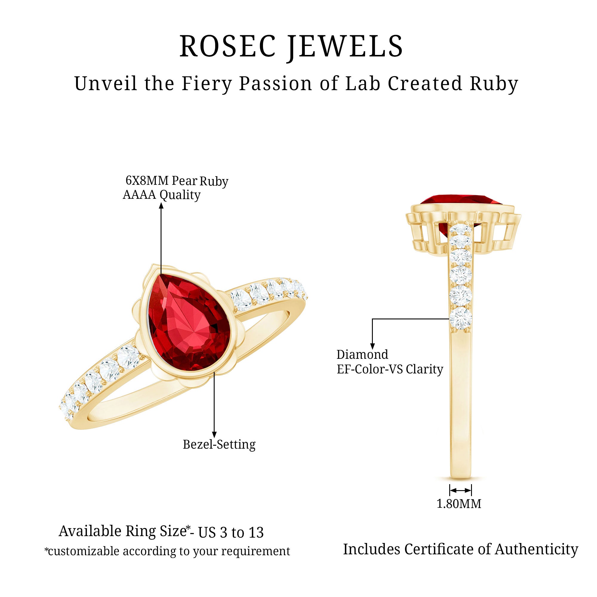 Turn every glance into a moment to remember with this beautiful Lab Created Ruby Engagement Ring. At the center of this elegant design is a 6X8 MM pear shaped ruby, set securely in bezel setting. To add just the right amount of sparkle, the band is decorated with a line of round lab grown diamonds as side stones. Both the stones - AAAA quality lab created ruby and EF-VS quality lab grown diamonds are chosen for their brilliance and clarity, offering the look of luxury with ethical value. The slim and comfortable band makes it ideal for everyday wear while still standing out for special occasions. This Pear Shaped Ruby Ring is designed for someone who loves elegant jewelry with a touch of personality. Crafted with certified lab grown gemstones, it offers both beauty and ethical value. Packed in a premium jewelry box, this Lab Created Ruby and Diamond Engagement Ring is ready to become a lasting reminder of love, commitment, and the beginning of forever. Let this Pear Engagement Ring be the one that starts your journey together.