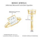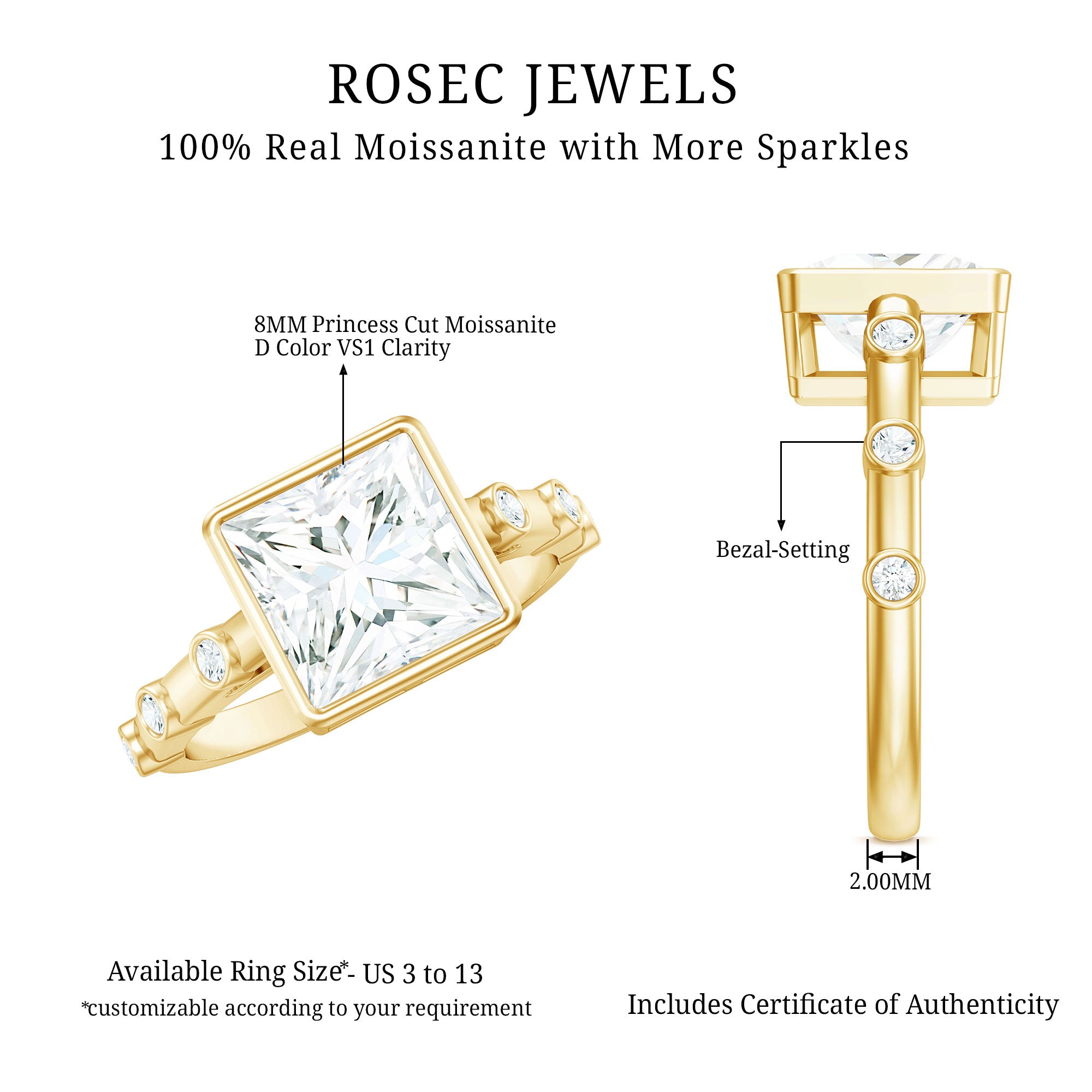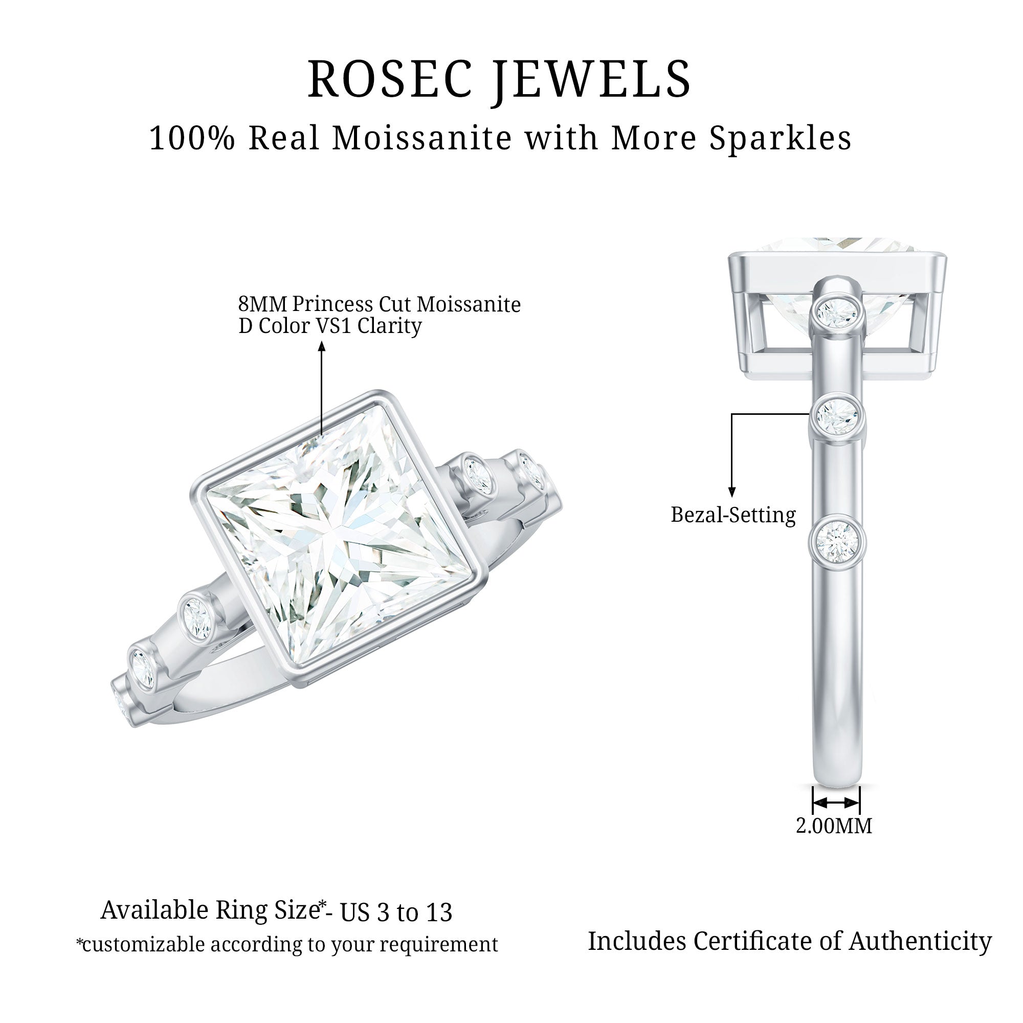 Surprise your special lady with the Solitaire Moissanite Engagement Ring on that unforgettable day. Crafted by Rosec Jewels, this beautiful ring showcases an 8 MM Princess Cut Moissanite securely set in Bezel Setting. The large center stone shines even brighter, enhanced by small Round Shaped Moissanite Spaced Accent along the shank, adding a luxurious touch to her hands. This 3 CT Moissanite Ring design is ideal for modern romance, perfect for those who love a bit of sparkle with personality. This Solitaire Ring represents your forever with its sparkling center stone, designed to feel both timeless and uniquely yours. Let this stunning Square Engagement Ring be the one that makes your heart skip a beat and captivates everyone around you. The Princess Cut Moissanite Ring is a true trendsetter for future brides, blending modernity with elegance, and its availability in various metal colors and purity options makes it a standout, budget-friendly choice. We will deliver this Solitaire Engagement Ring in a Signature Jewelry Box, ensuring you receive a hassle-free, safe, and secure Ready to Gift Ring upon delivery.