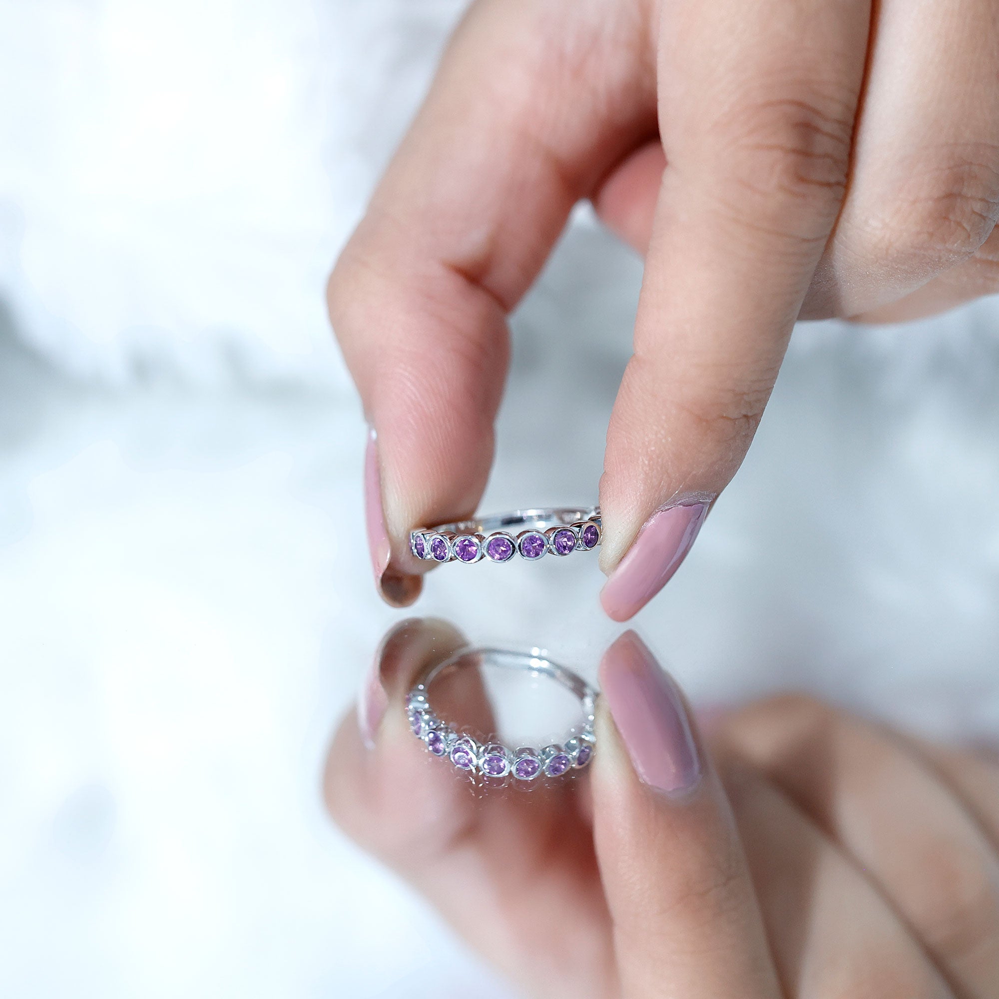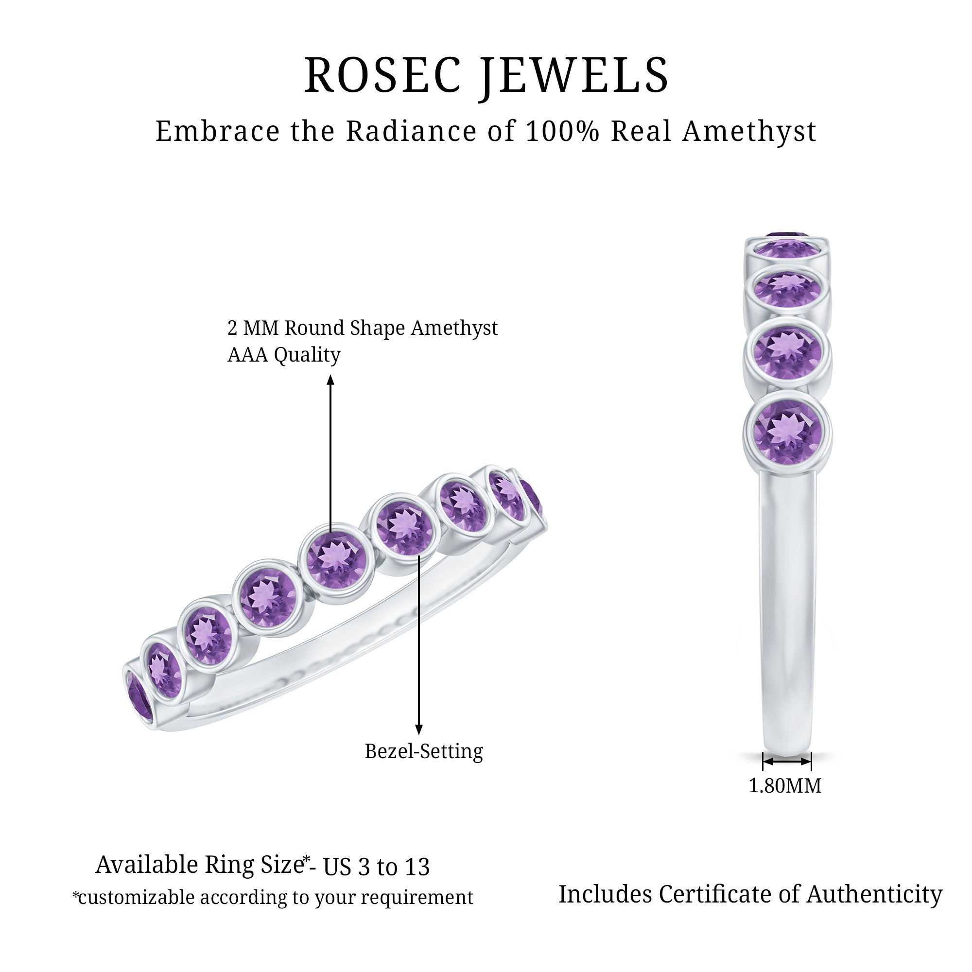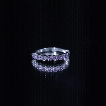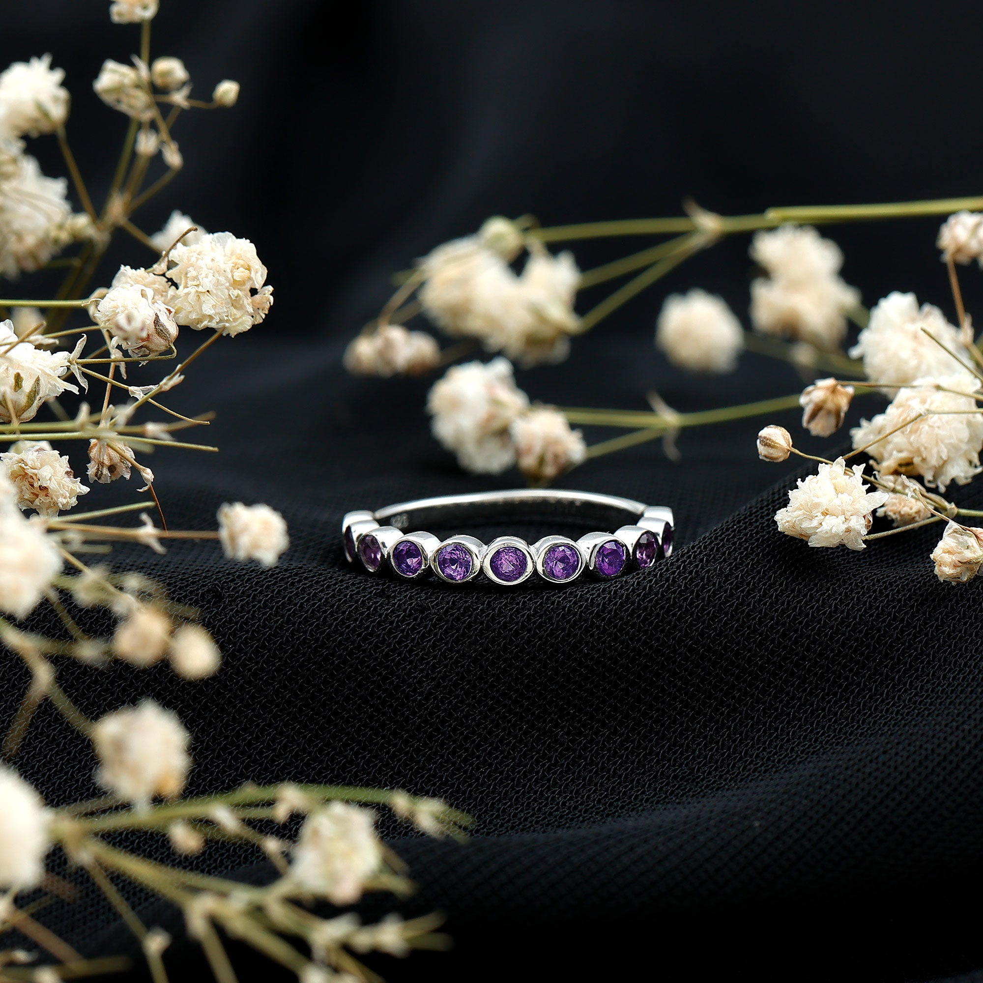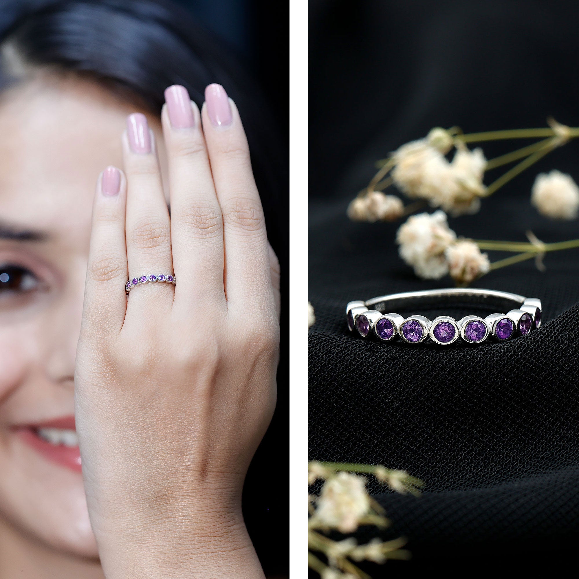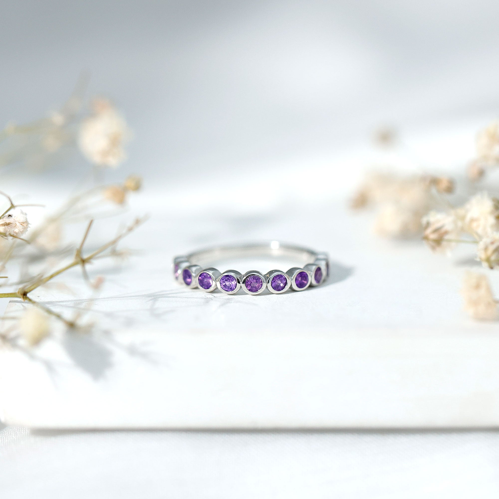 Celebrate the beauty of moments and milestones with this charming Amethyst Eternity Band, thoughtfully designed to reflect your story with elegance and grace. Crafted in 14K white gold plated silver, this Half Eternity Ring features a row of round cut genuine Amethyst gemstones, each securely placed in bezel setting. The smooth metal frame around each stone not only protects it but also gives the design a clean, modern look that is perfect for daily wear. These stones are beautifully arranged in a half eternity pattern, covering the front half of the band in a graceful curve. This layout symbolizes a lasting connection and celebrates love, balance, and clarity, just like the meaning often associated with Amethyst. Whether you are gifting it to someone with a February birthday, marking a special occasion, or simply adding a personal touch to your jewelry stack, this Amethyst Wedding Band Ring offers everyday sophistication with sentimental charm. It also makes a lovely wedding band, anniversary ring, or a unique stackable piece. Minimal in design but full of meaning, this Amethyst Stackable Ring is a celebration of timeless beauty and a little bit of sparkle.