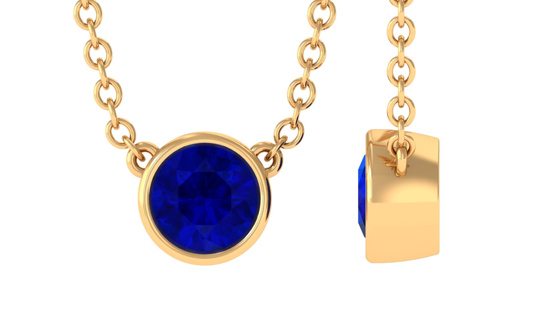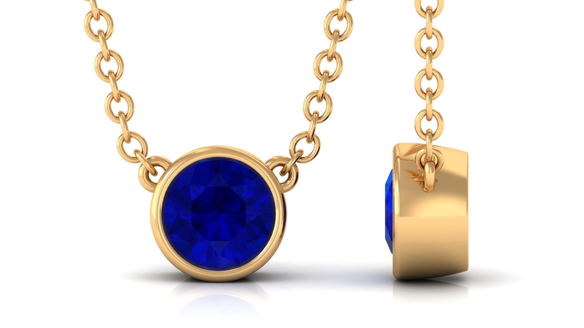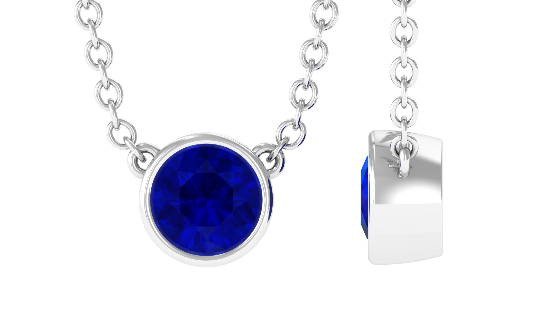 Achieve a perfect balance of elegance and glamour with this Created Blue Sapphire Necklace, an ideal choice to elevate both your work wear and off-duty styles. The Solitaire Necklace features a captivating Round Cut Created Blue Sapphire, exquisitely embellished in a secure Bezel Setting.