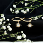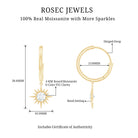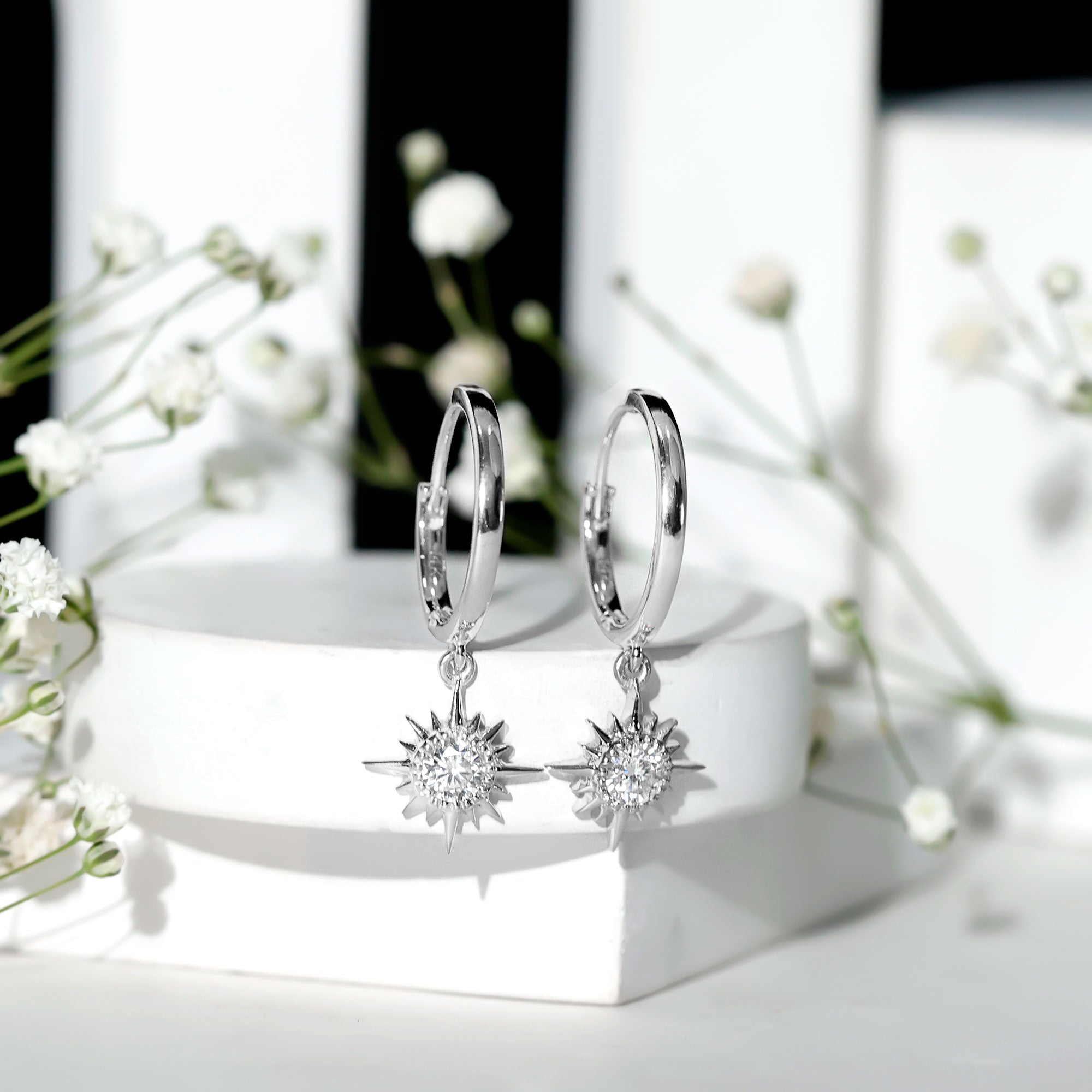 Experience the celestial allure of these hoop drop earrings, where a radiant bezel-set moissanite steals the spotlight, mirroring the mesmerizing beauty of galaxies. The luminous metal embellishments gracefully enhance these sunburst earrings, elevating their stunning appeal. Intricate detailing surrounds the center stone, infusing the design with an exquisite touch. For utmost comfort, these earrings are delicately attached to hinged hoop findings. Prepare to be enchanted by their celestial-inspired charm and revel in the elegance they exude.