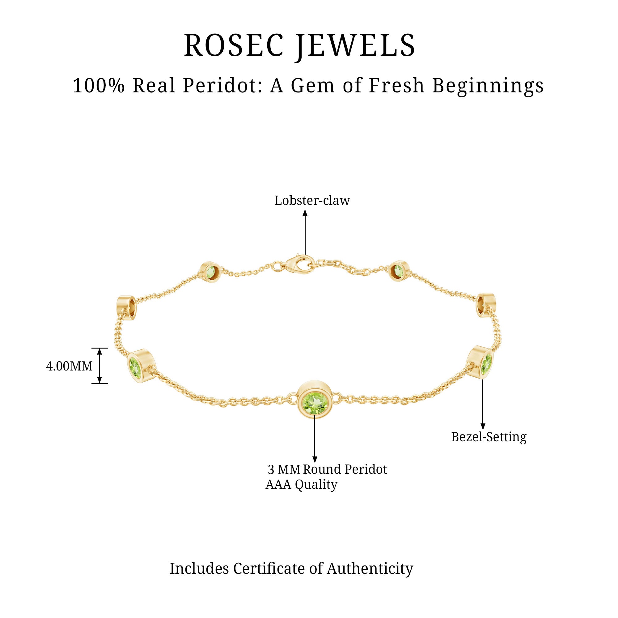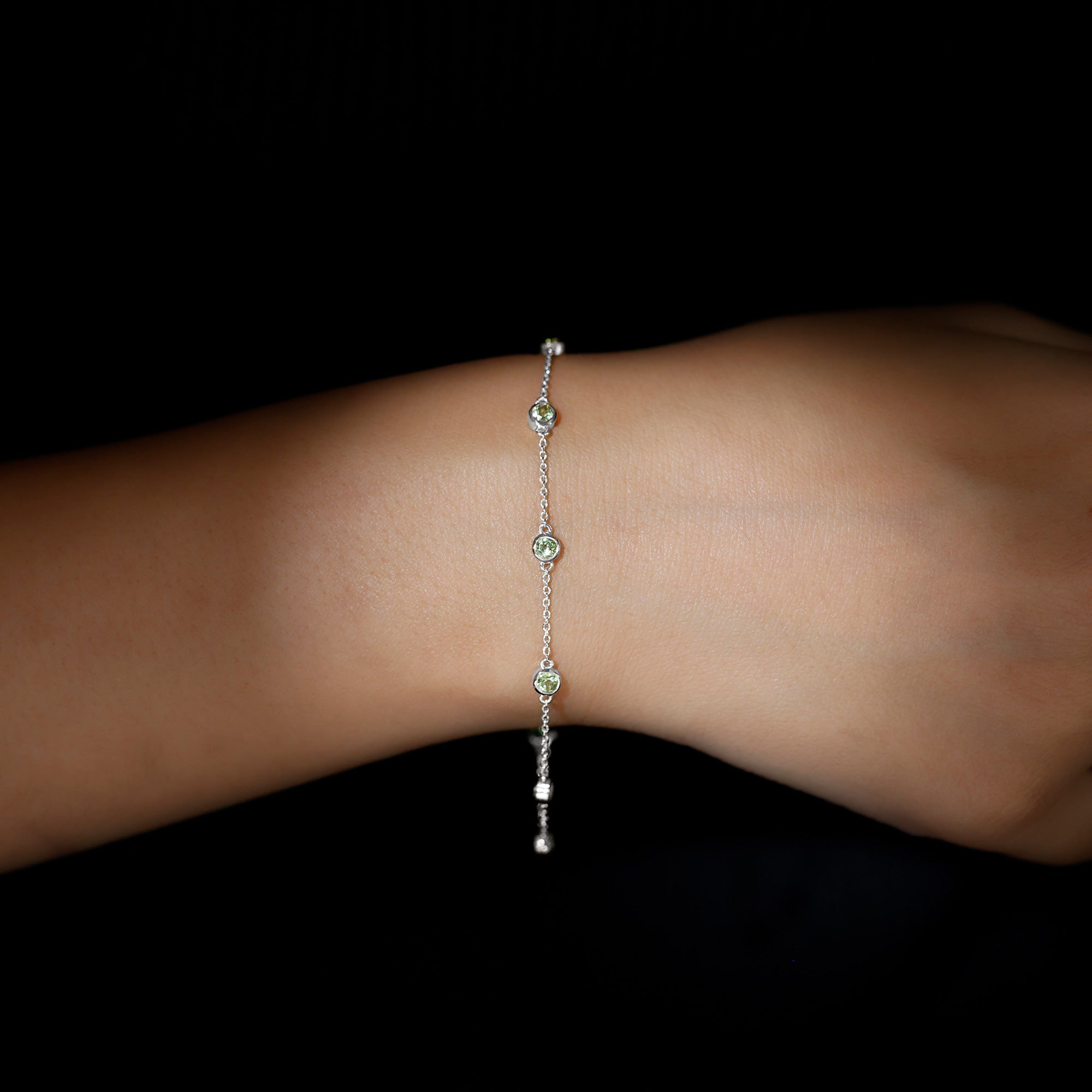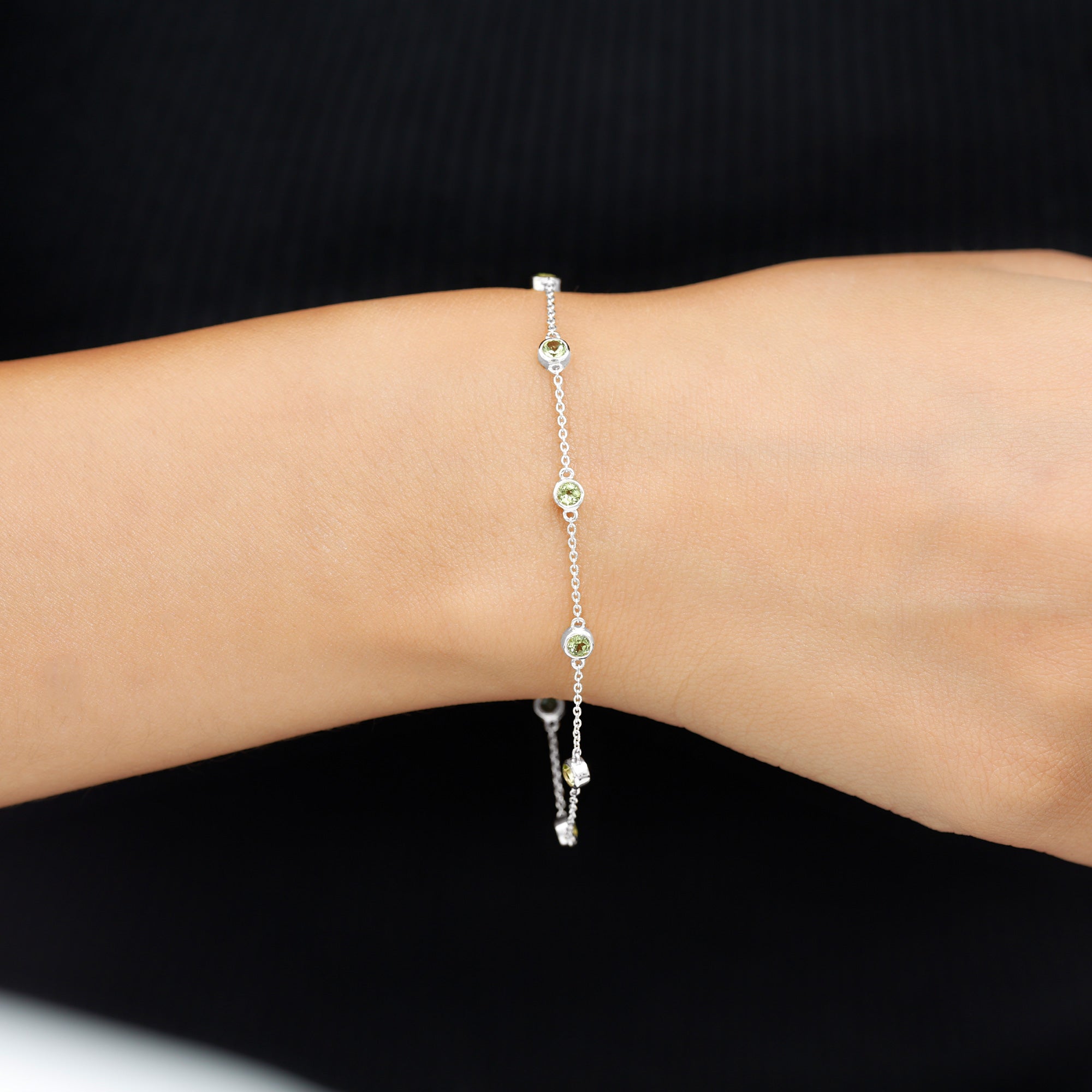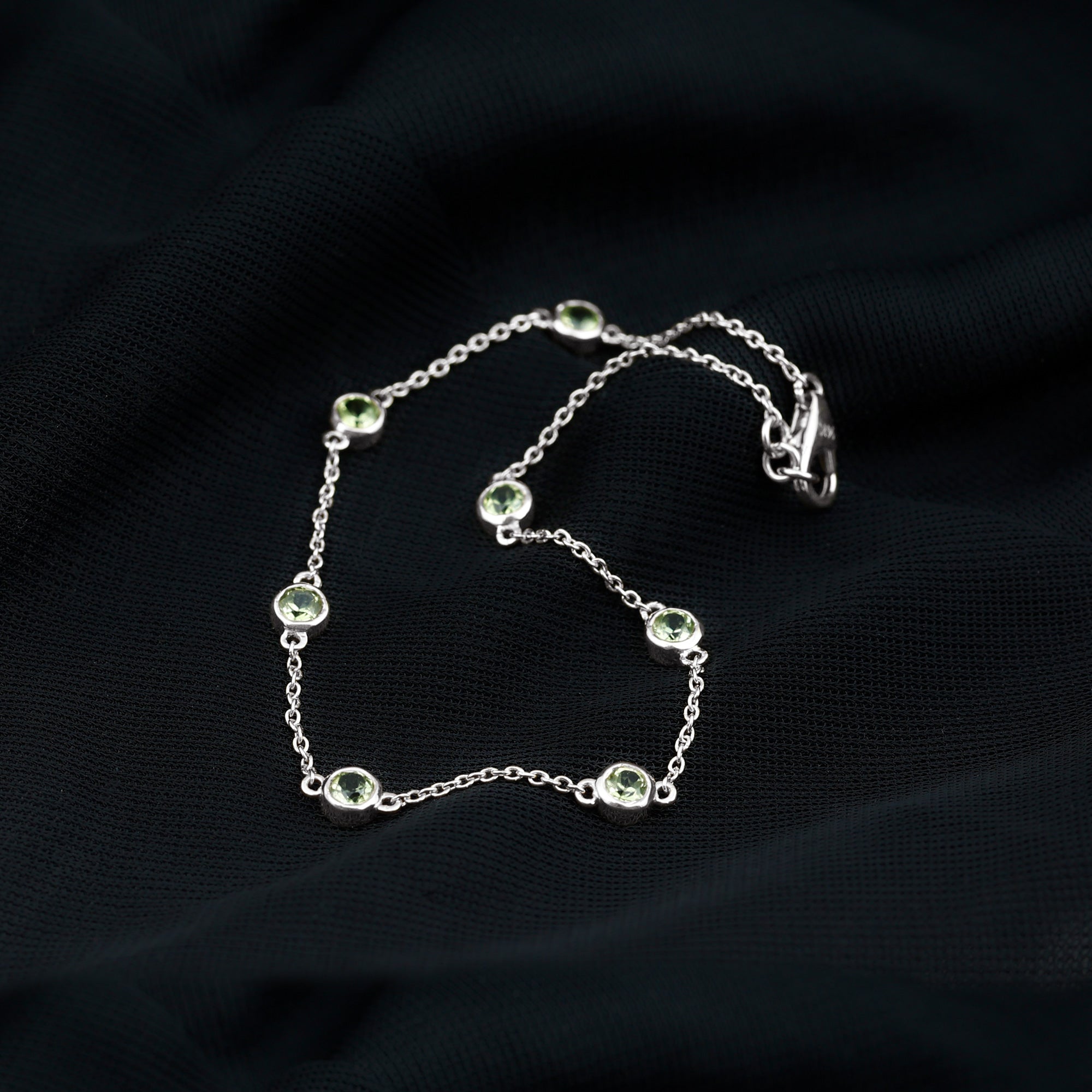 This Peridot Chain bracelet is charming and perfect to present to your special one. It features seven Round Shape Peridot stones securely placed in Bezel Setting with a Lobster Claw. This Station Chain Bracelet shines with the AAA quality Peridot and the secured Lobster Clasp is there to adjust the chain length according to the wrist size. This 7 Stone Bracelet is perfect to present as a gift to the August-born ladies. This Delicate bracelet is precisely crafted for your special moments and will be delivered to you with a classic jewelry box for further storage.
