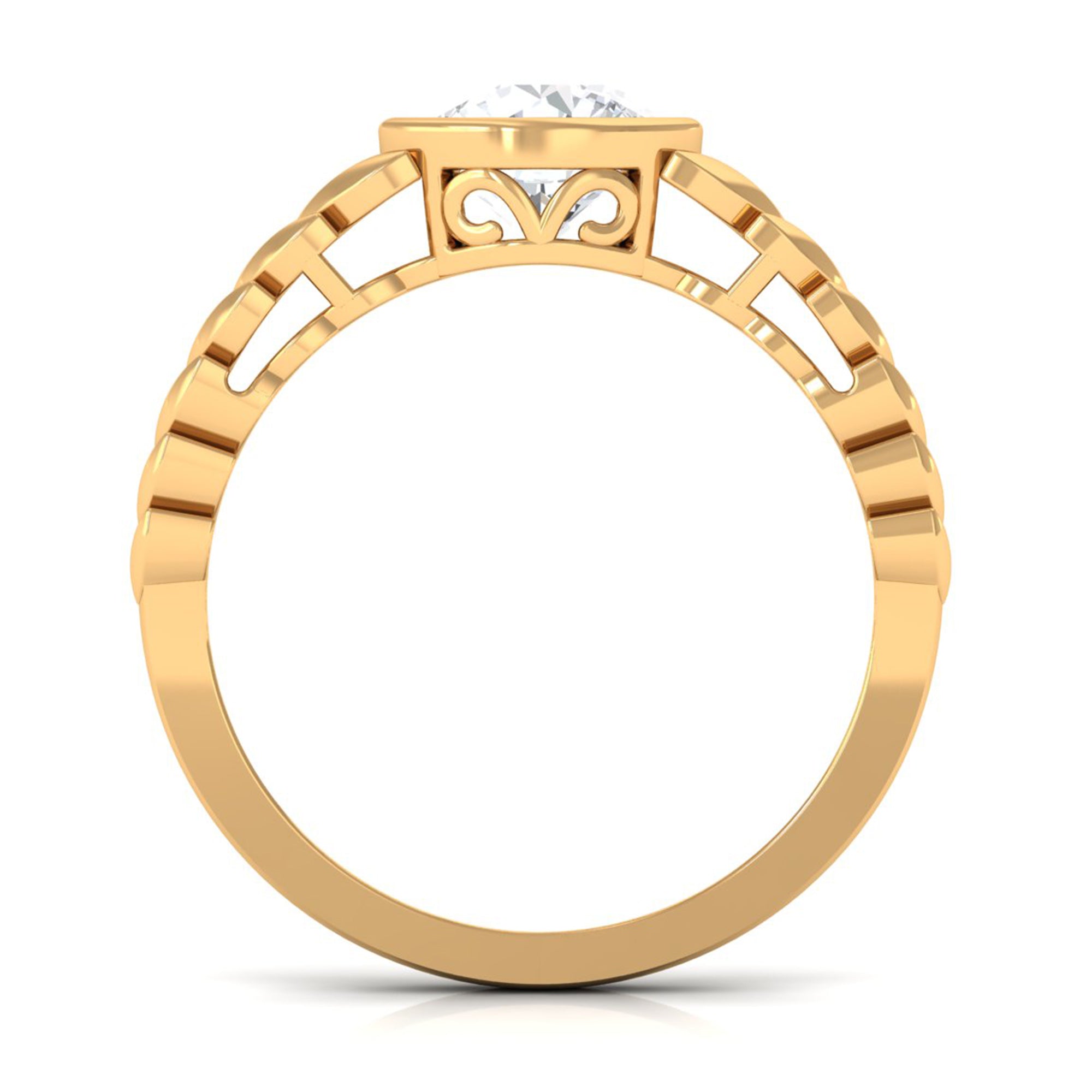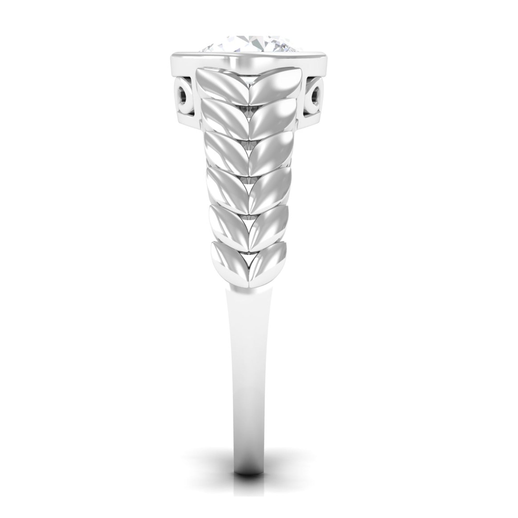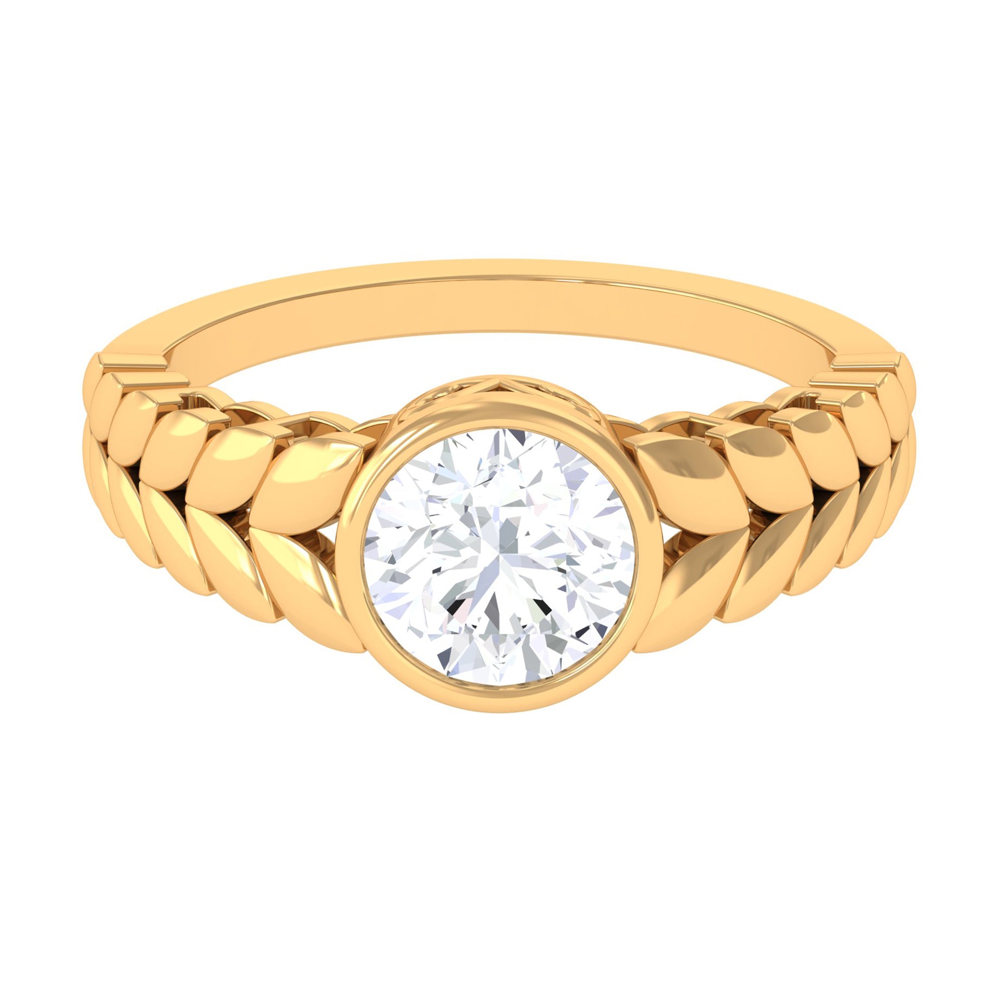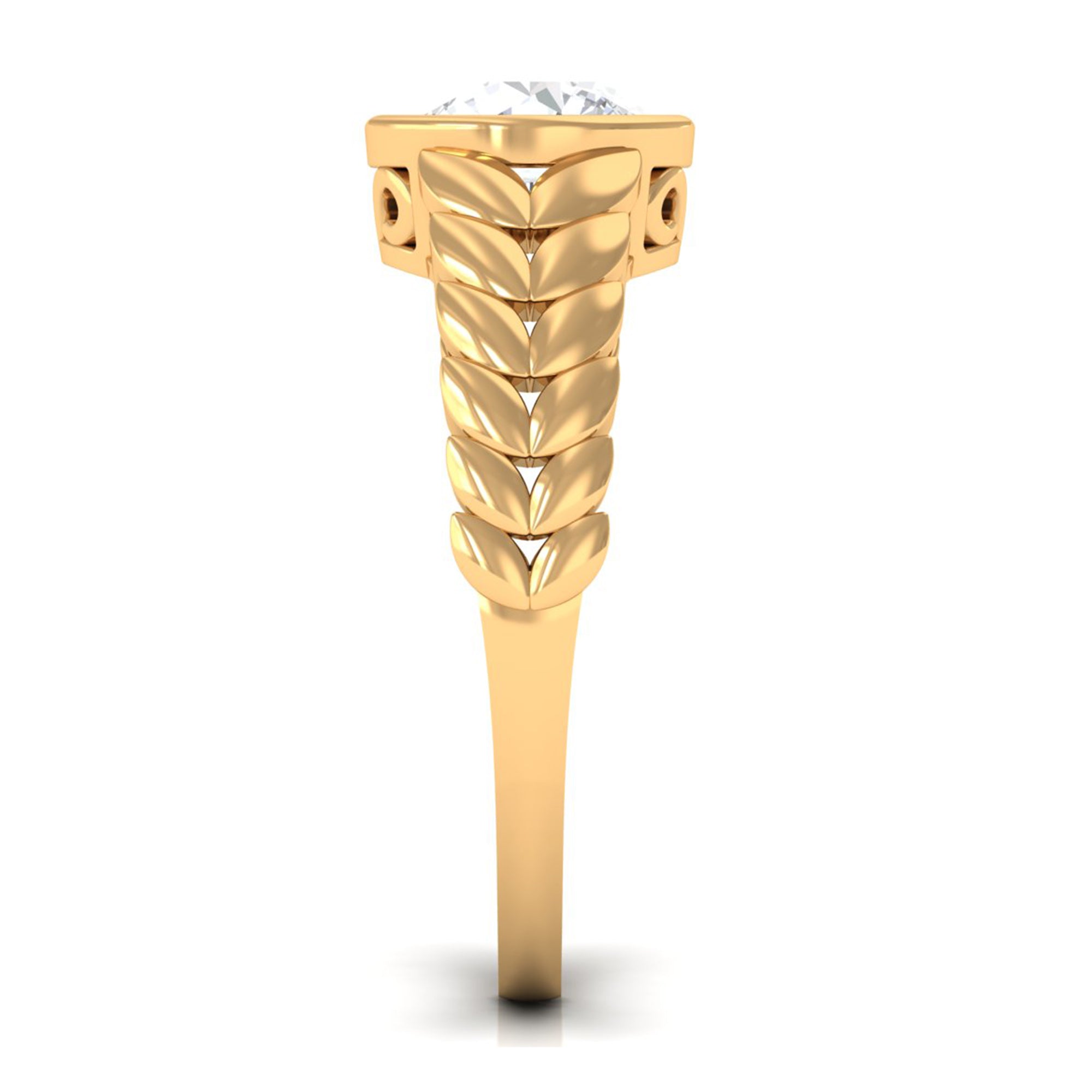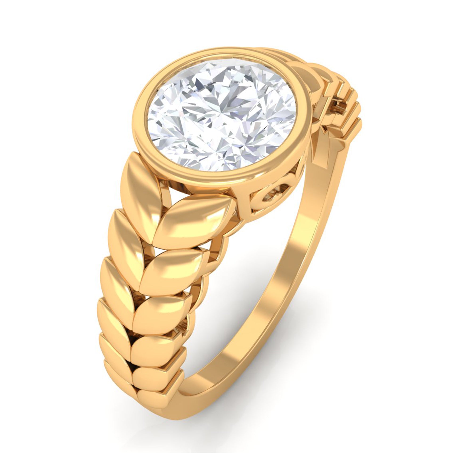 Delicately presenting a breathtaking Round Cut Cubic Zirconia embedded in the center in Bezel Setting, this Cubic Zirconia Engagement Ring features a gold leaf pattern being created at the shank. There is no style more lovely, sophisticated and classic than a Solitaire Engagement Ring.