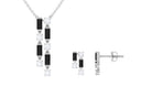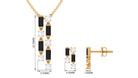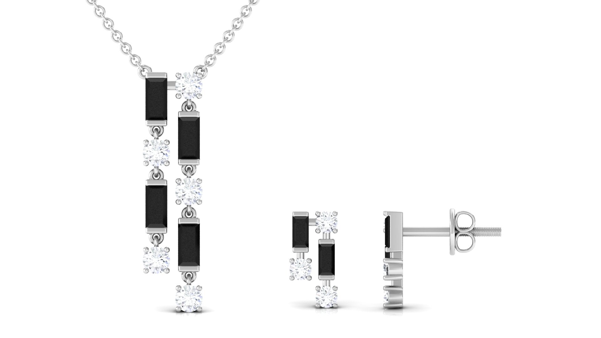 Make a statement with this beautiful Dangle Necklace and Earrings Set, featuring Baguette Cut Black Onyx in a bar setting and round Diamond stones. The intricate design and exquisite craftsmanship of this jewelry set create a stunning contrast, making it a standout piece of jewelry. This Black Onyx necklace set is perfect for adding a touch of luxury to any outfit or special occasion.