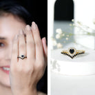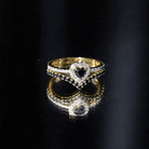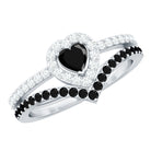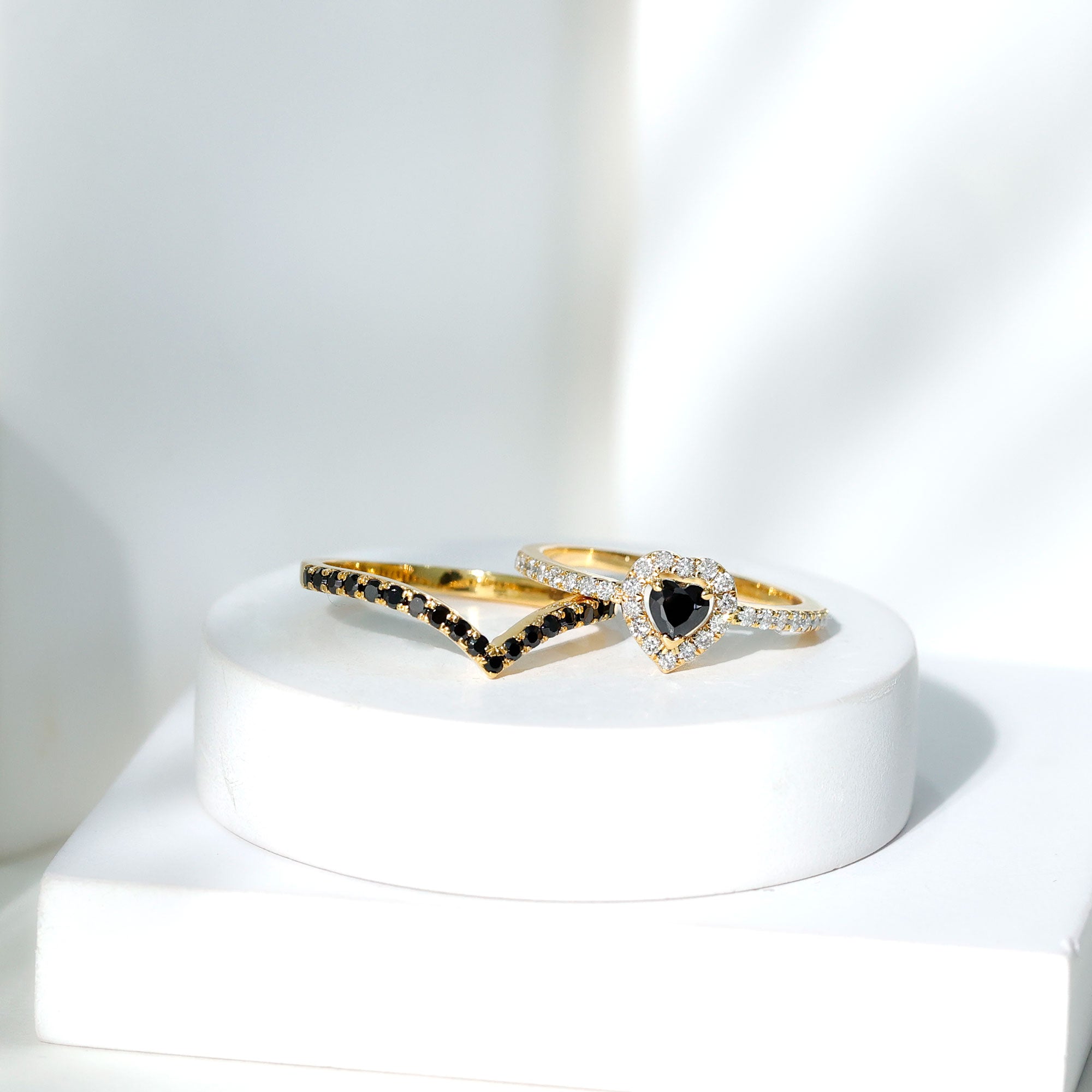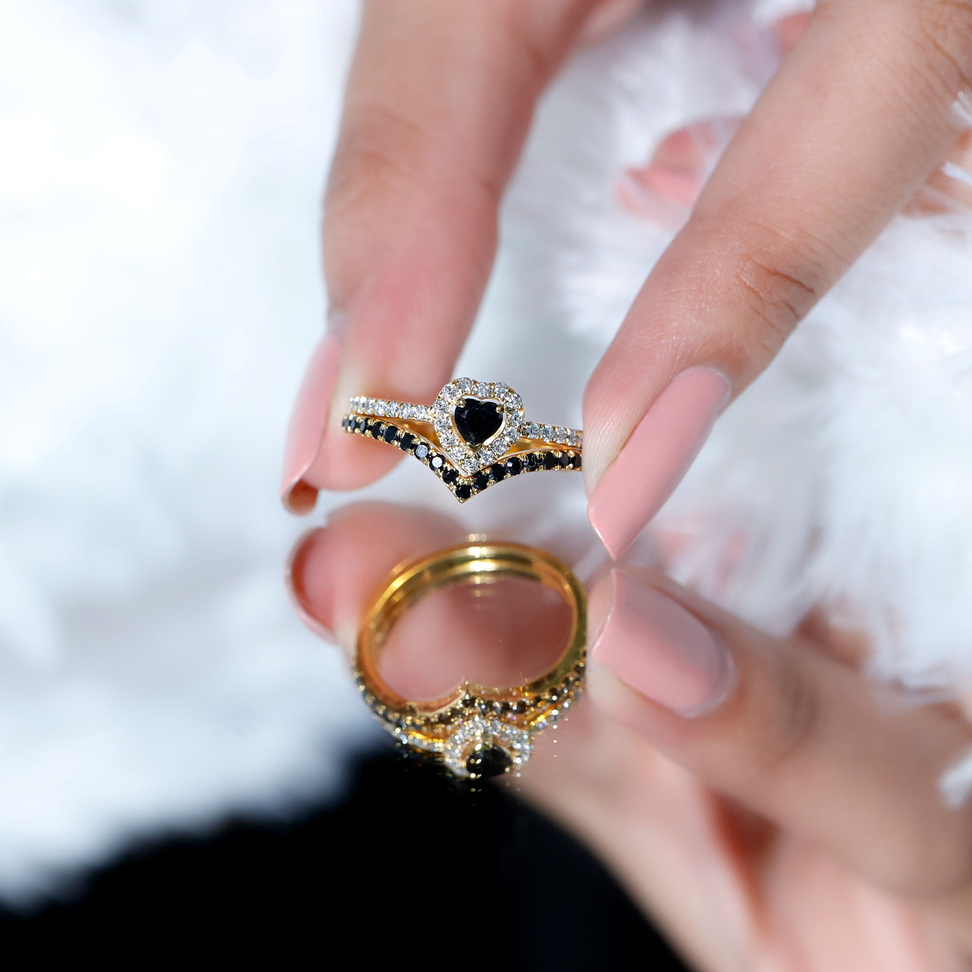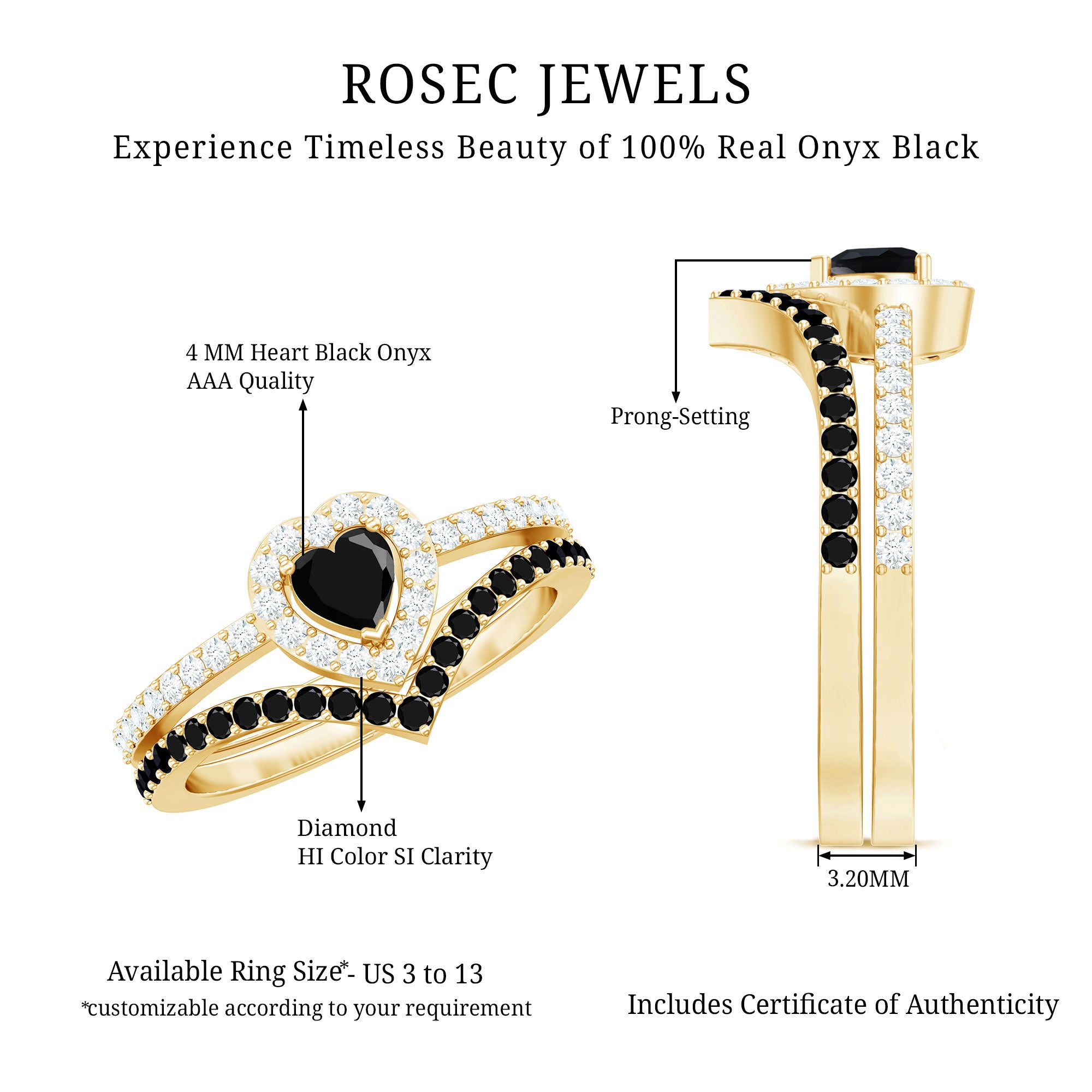 Show your immense love to your special one on the big day with this Black Onyx Wedding Ring Set. It features a heart shape wedding ring and chevron enhancer band ring. The engagement ring is embedded with a 4 mm heart shape black onyx delicately placed in Prong Setting. The center stone is encircled with Petite Diamonds and the band is also adorned with diamonds. The Enhancer Ring is decorated with petite round shape Black Onyx. This ring set is beautiful and depicts intense feelings for your special one. This Wedding Ring Set beholds the shine of AAA Quality Black Onyx and HI-SI Quality diamonds making it a perfect jewel for the big day. Grab this Bridal Ring Set for your special lady and make her feel adored and loved.