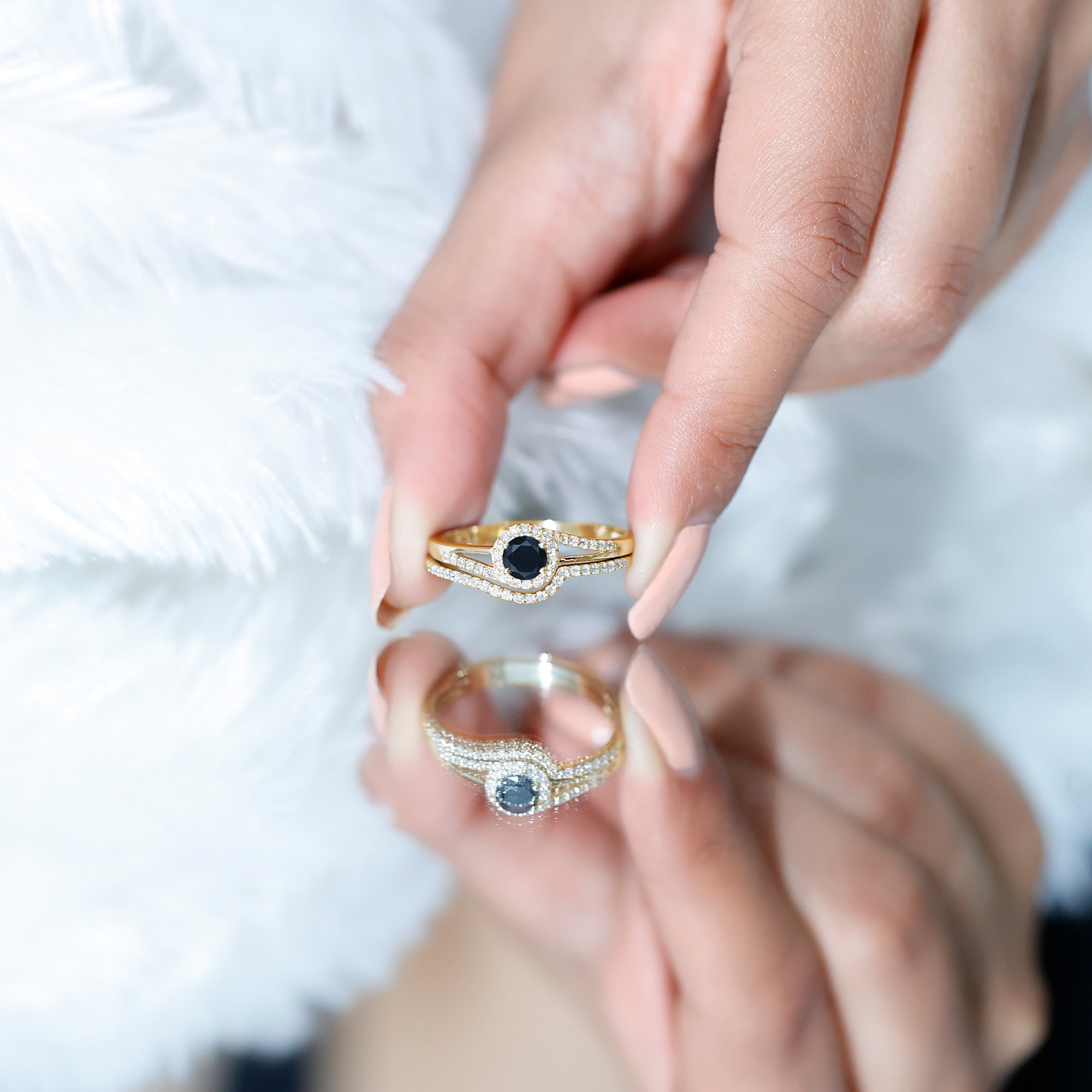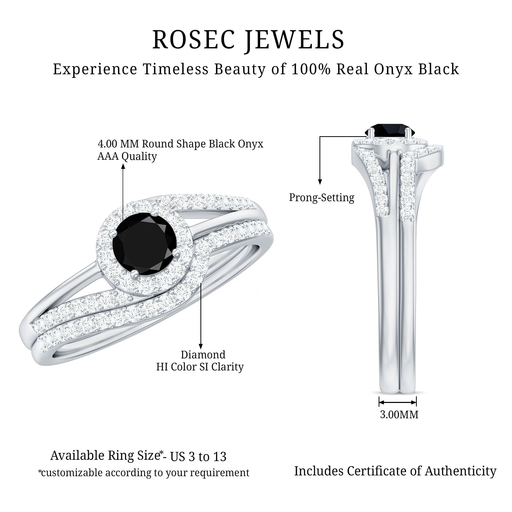 Modern sophistication intertwines with everlasting allure in this exquisitely crafted Onyx Engagement Ring Set. Featuring a striking yet elegant appearance, it is ideal for the bride who appreciates clean lines complemented by a touch of brilliance. At the heart of the set lies a captivating 4 MM round shape black onyx set at the center surrounded by petite round shape Diamonds and more diamonds are set on the bypass style shank on both sides, celebrated for its elongated form and radiant sparkle. Positioned in a prong setting on a band adorned with round diamond stones, the central stone is distinguished by its remarkable fire and clarity, reflecting light from every perspective. The engagement ring is seamlessly complemented by a sleek curved wedding band, designed in a gentle curve that embraces the halo ring with elegance. Enhanced with round cut diamonds, this contemporary band introduces additional brilliance while establishing a harmonious, stylish profile. Collectively, the rings create a distinctive and refined Onyx Wedding Ring Set that embodies both minimalism and significance. Whether intended for a proposal, wedding day, or a special occasion, this Bypass Engagement Ring with Wedding Band is crafted to commemorate the moment with elegance and beauty. Meticulously designed with a focus on every detail, the set offers a modern interpretation of classic design, perfect for the bride who values simplicity yet desires something that truly stands out.