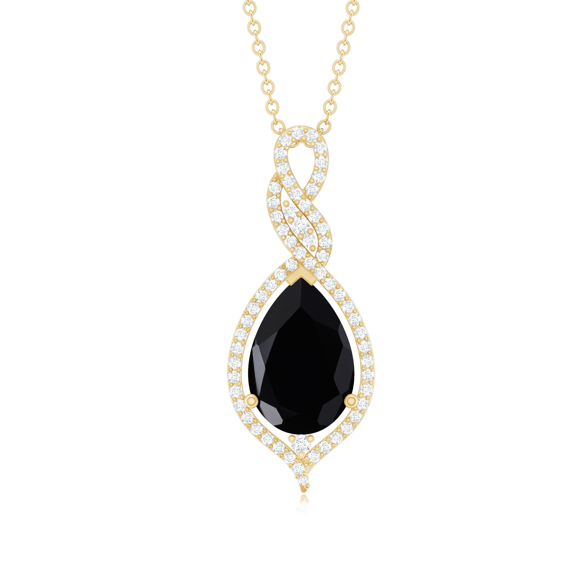 Indulge in the allure of the Teardrop Dangle Pendant, adorned with a captivating pear cut black onyx gemstone. Accentuated with exquisite moissanite stones, this pendant exudes a mesmerizing elegance. Suspended delicately, it becomes a stunning accessory, effortlessly adding a touch of sophistication and glamour to any ensemble.