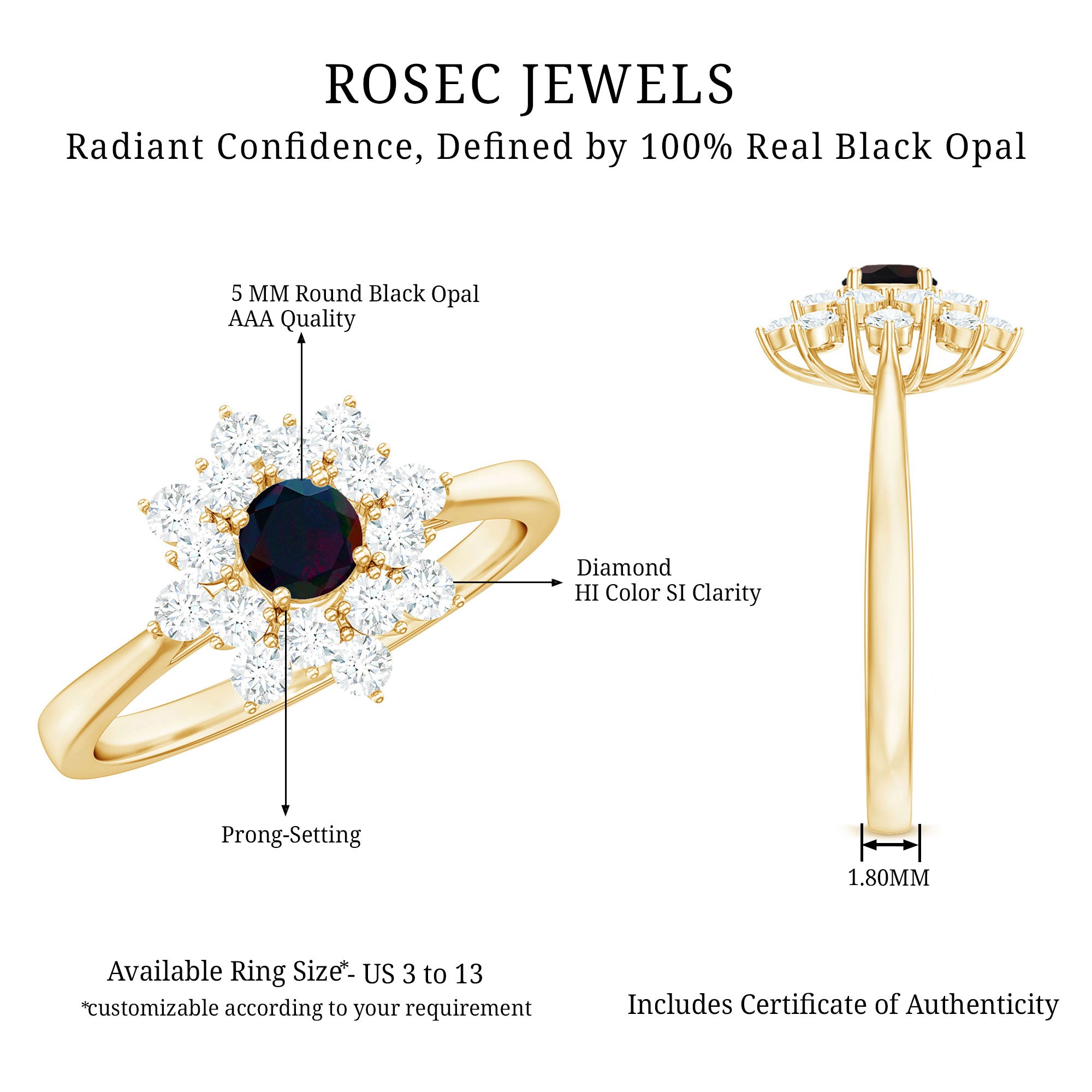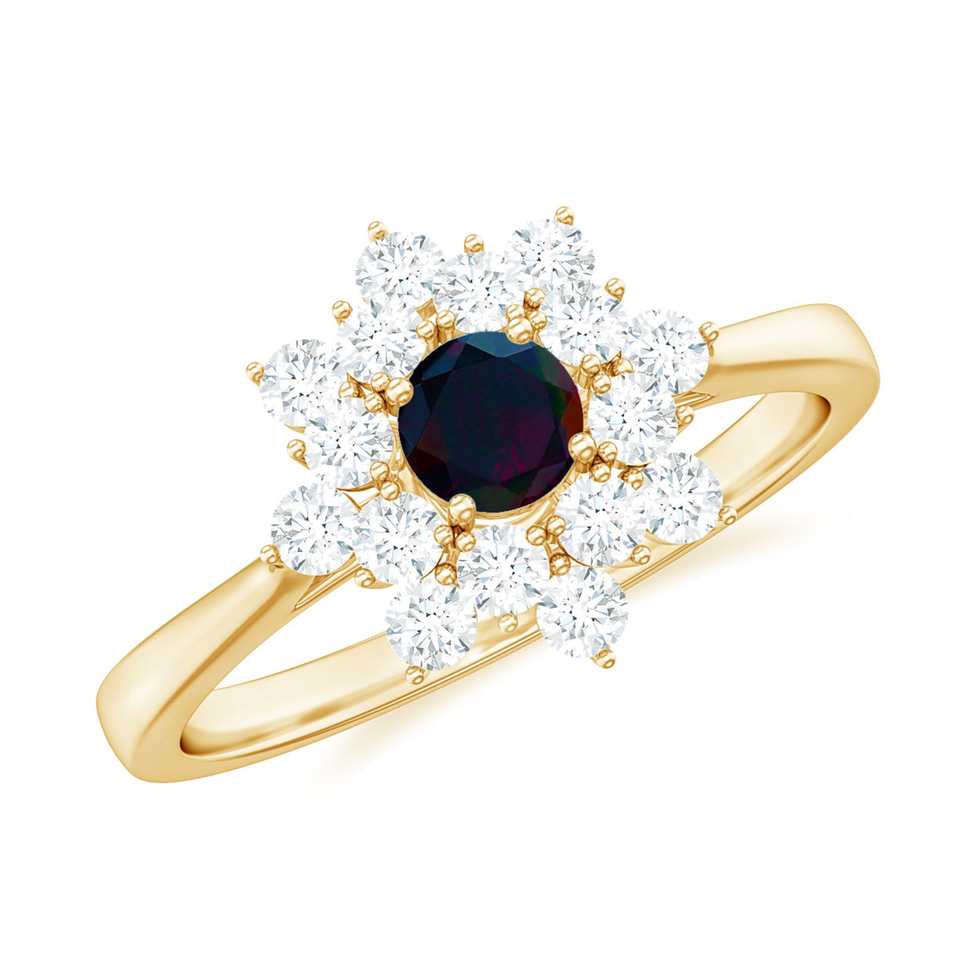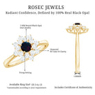 Make heads turn with this mesmerizing Black Opal Engagement Ring, a stunning piece of jewelry for your beloved. Featuring a round-cut Black Opal in a prong setting, surrounded by a halo of Diamond Stones on the engagement ring, this Black Opal Cluster Engagement Ring is crafted from Solid Gold, adding an elegant touch to any outfit.