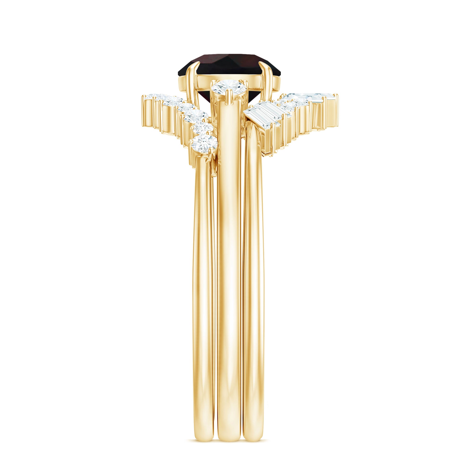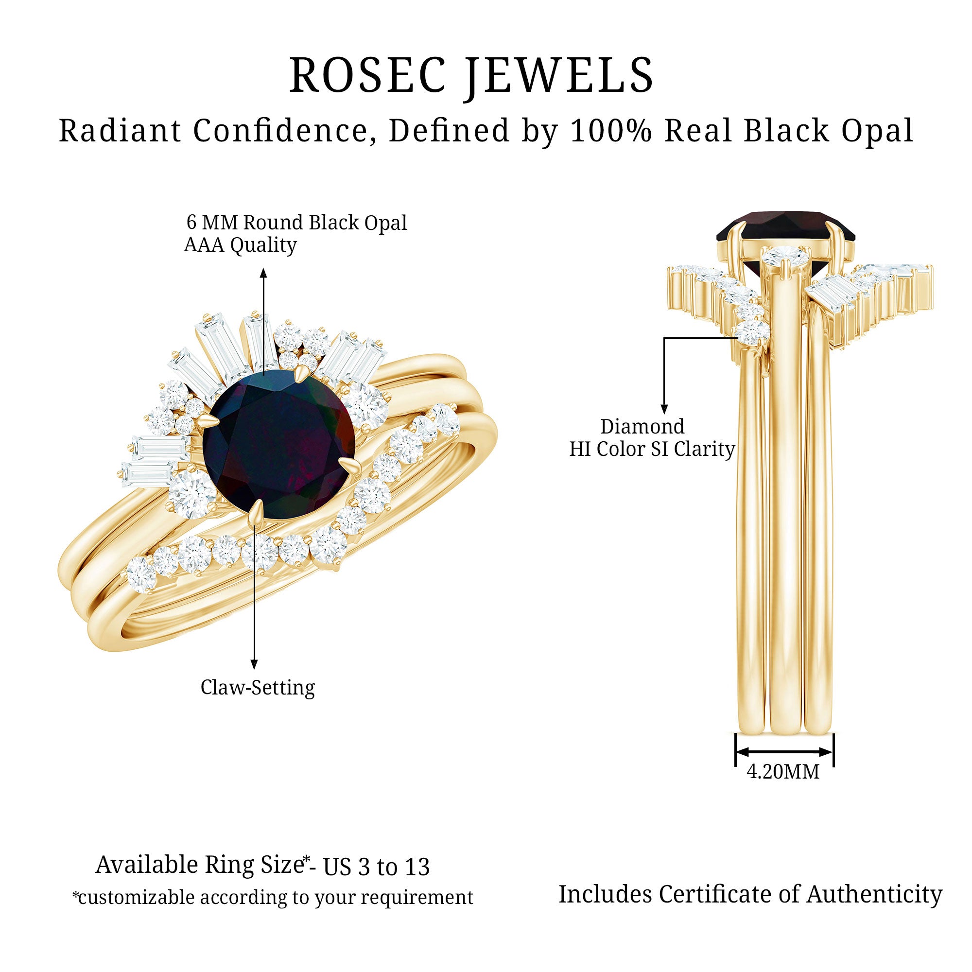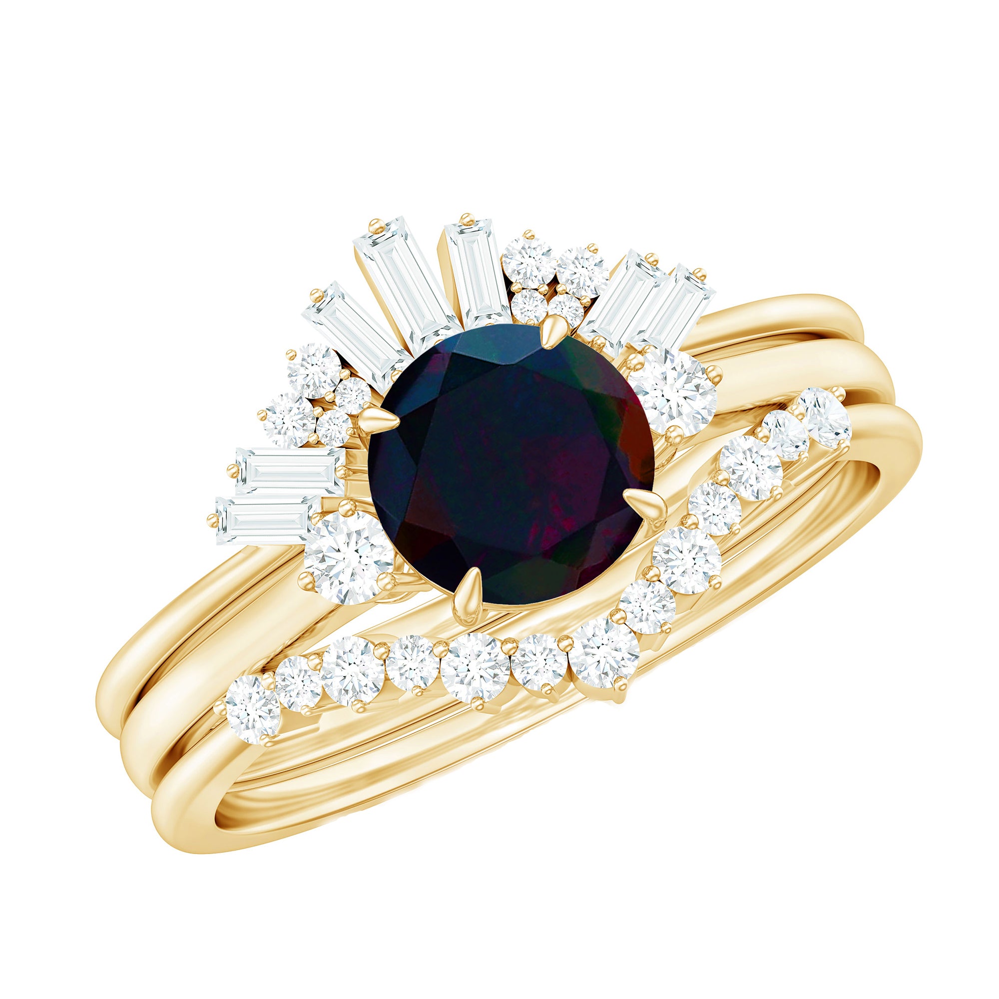 Radiate elegance with this exquisitely beautiful Black Opal Wedding Ring Set. The 6 MM Round Shape Black Opal is adorned with uniquely set Round Shape and Baguette Cut Diamond, making this ring a truly regal piece. This Designer Ring Set has a classic appeal that will take your breath away. Crafted in Solid Gold, this Ring Set will be a perfect choice for your wedding.