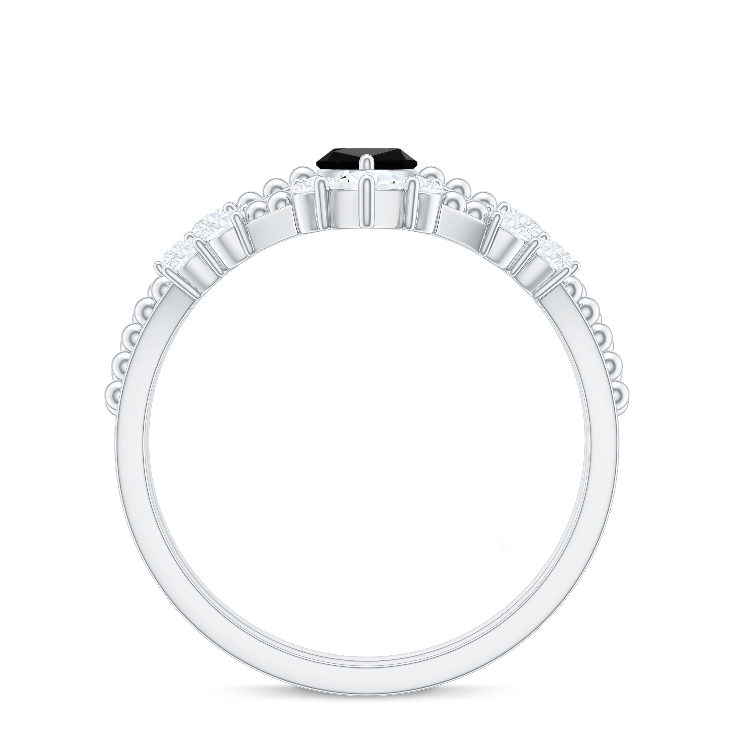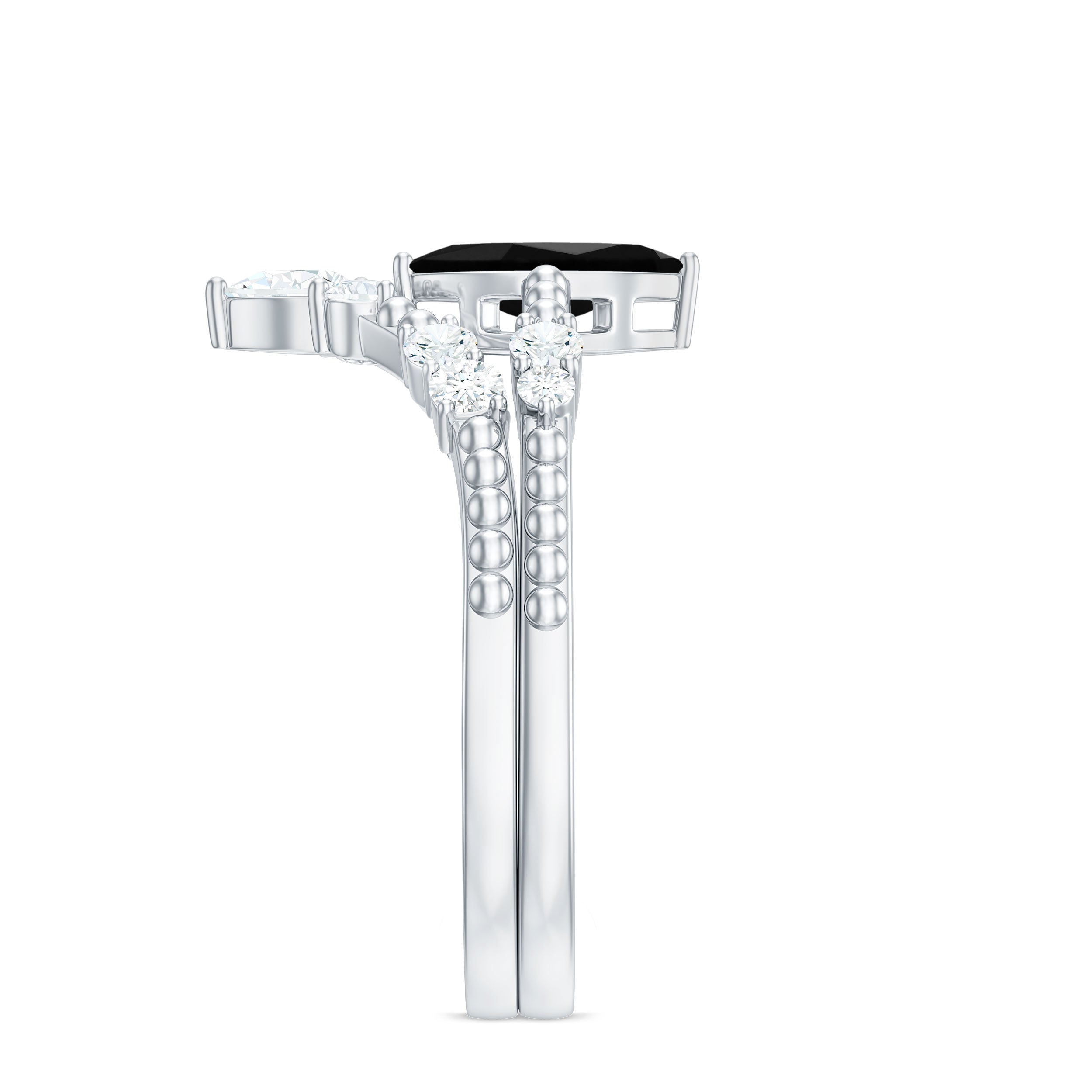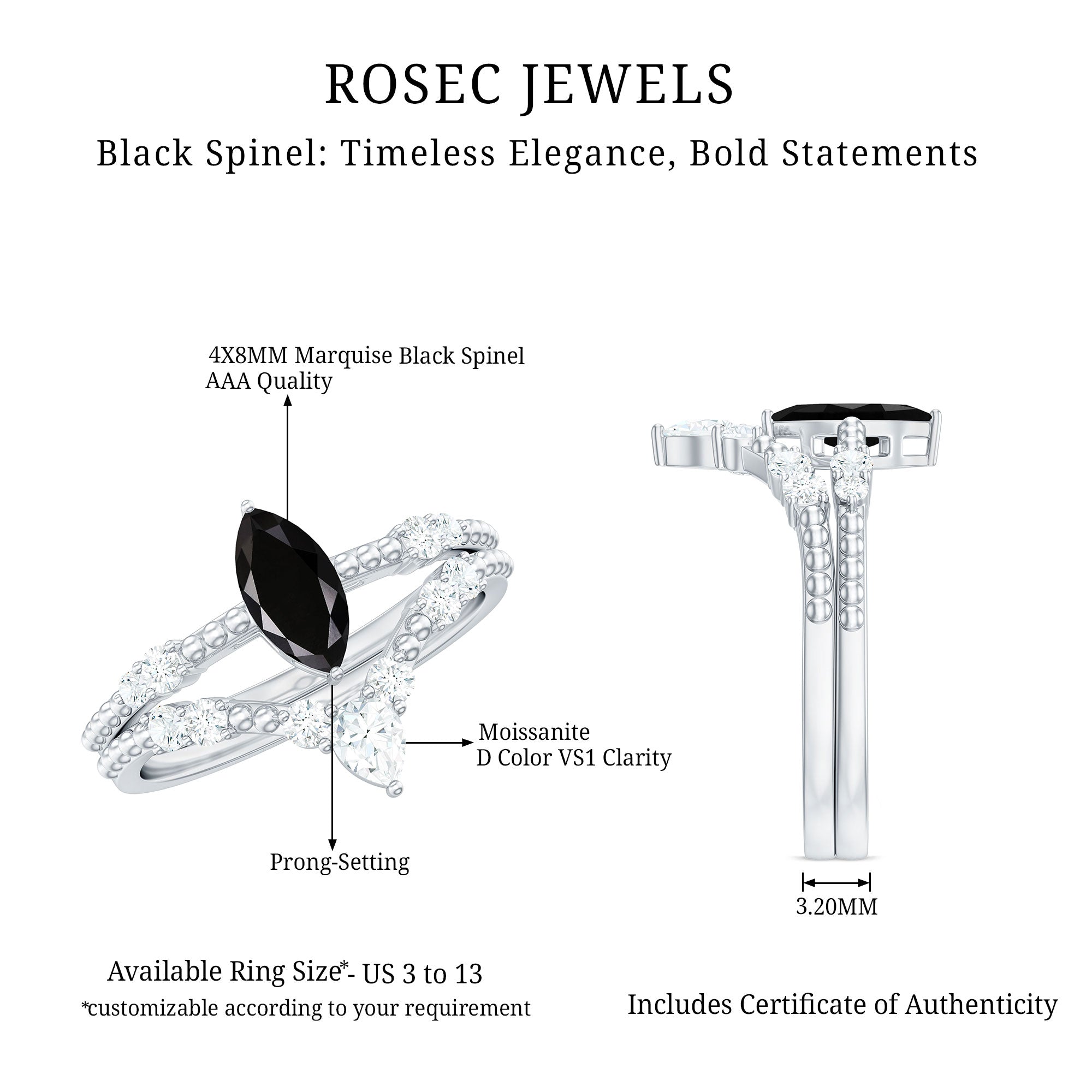 This exquisite Solitaire Ring Set has Marquise Shape Black Spinel in Prong Setting and Moissanite on the V Shape Band is an elegant piece for your D-day.