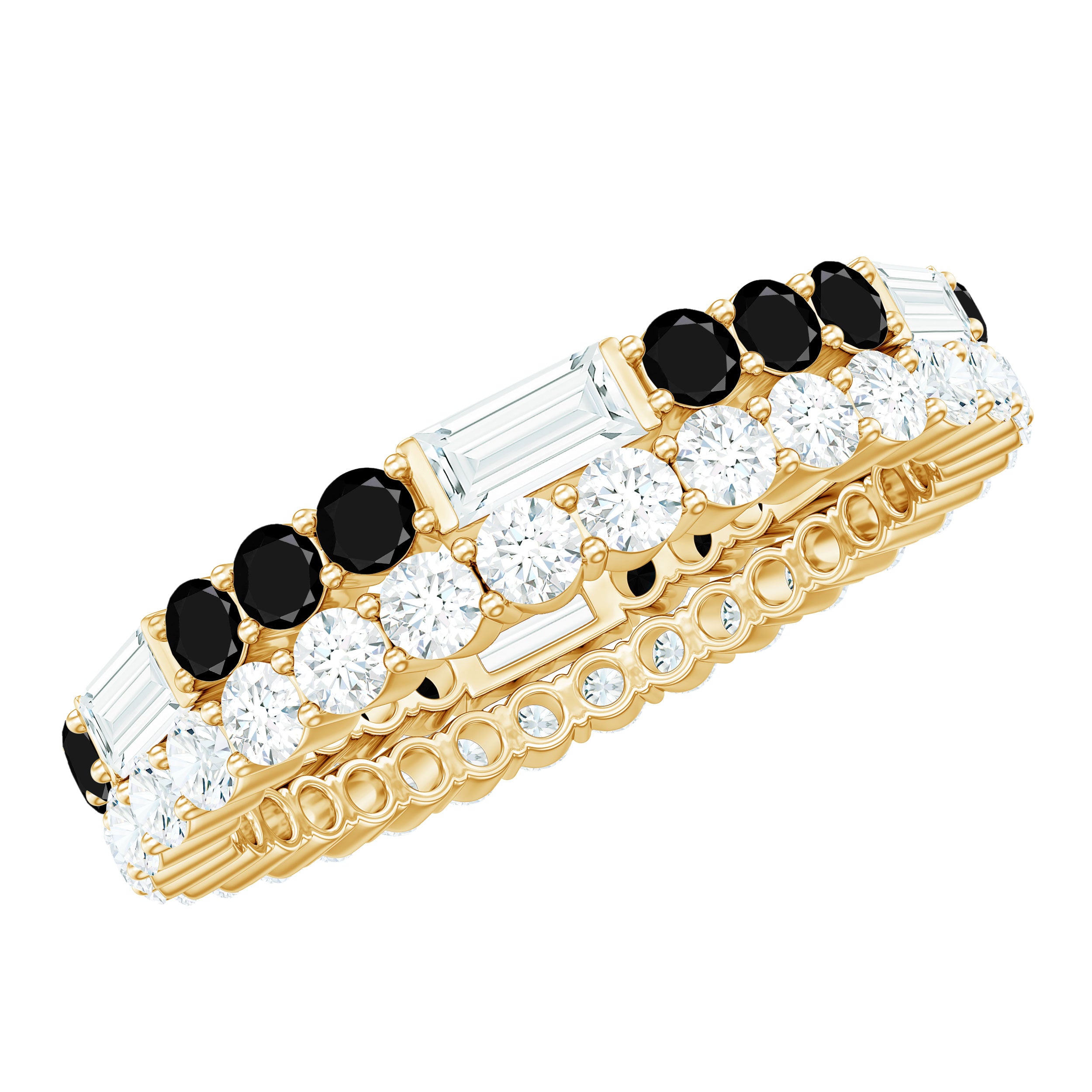 Eye-capturing and eye-captivating this Two Row Eternity Band Ring is adorned with Baguette Cut Black Spinel in Prong Setting and Moissanite.
