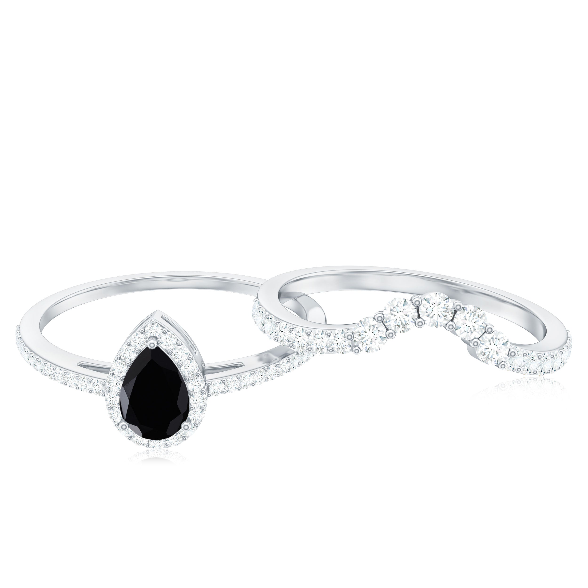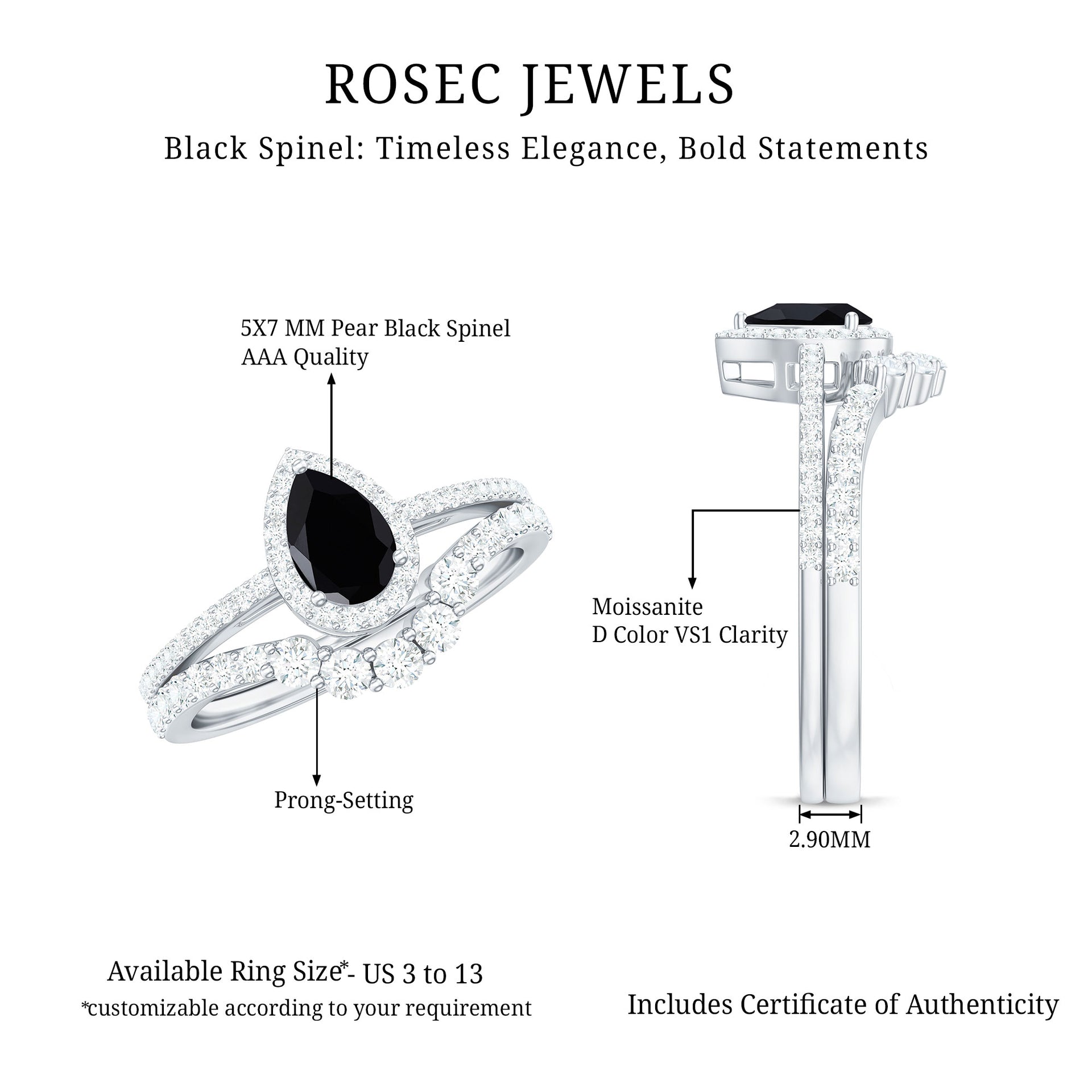 Black Spinel Designer Teardrop Ring Set with Moissanite Halo