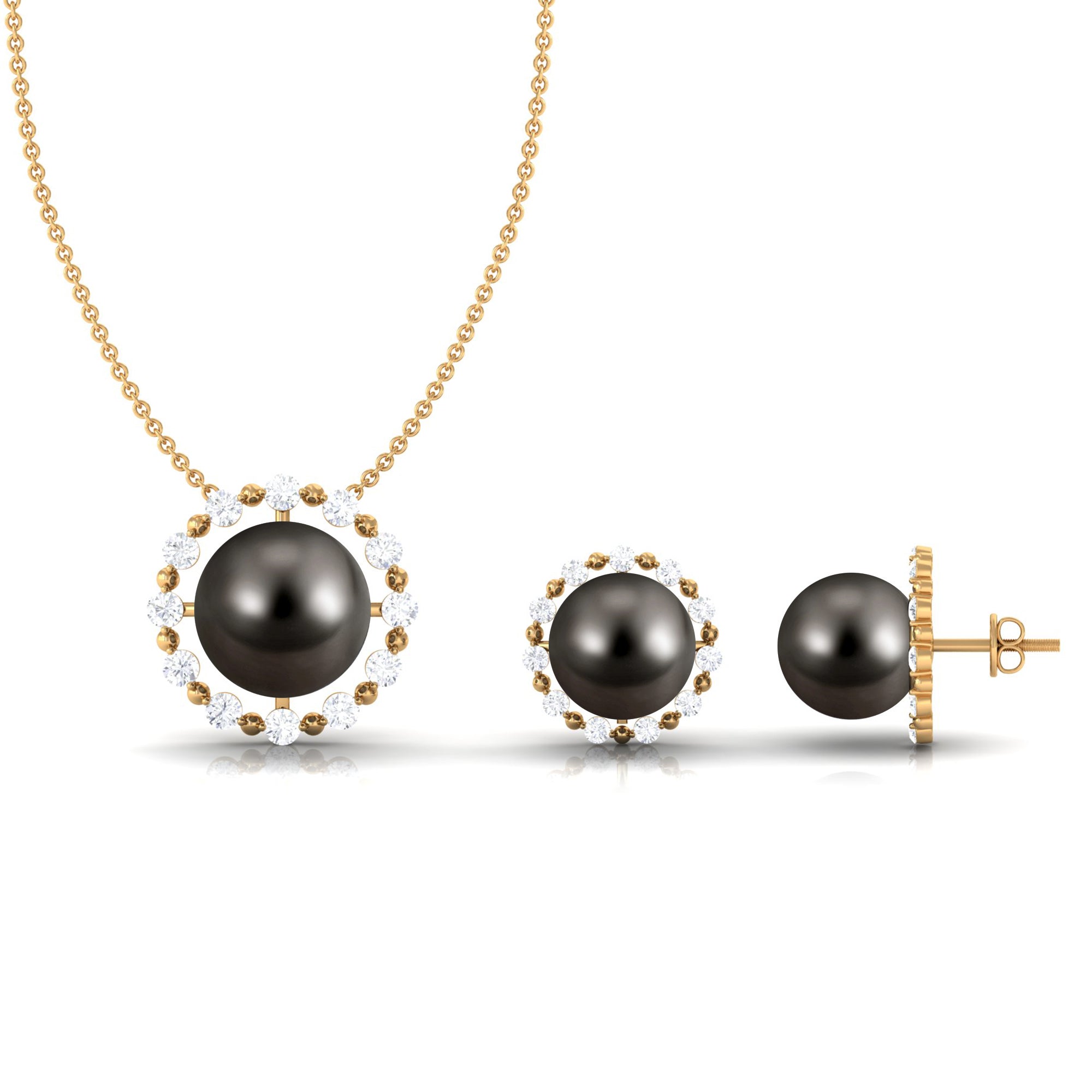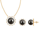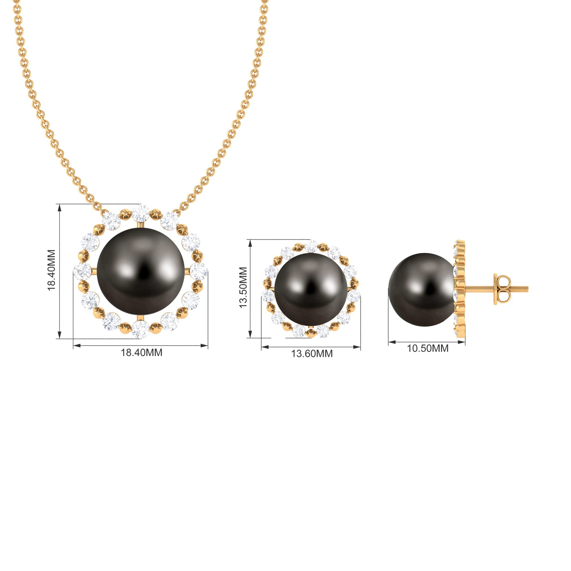 The Real Tahitian pearl and moissanite jewelry set is the perfect way to gift someone and make them feel special. This stunning jewelry set features a 10 mm Tahitian pearl in a necklace surrounded with sparkling moissanite and a 10 mm Tahitian pearl center stone in the stud earring. The center stone in the earring is surrounded by small sparkling moissanites. The pendant and earrings showcase a unique and contemporary design that is both elegant and eye-catching.