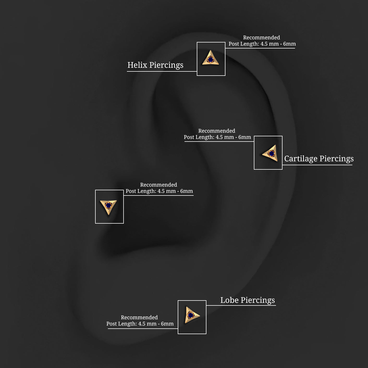 Looking to be remembered? Geometrics is the way to go. This Blue Sapphire Triangle Earring features a Round Shape Blue Sapphire in the center of a triangular design set in 3 Prong Setting. This Sapphire Earring can be styled on your different piercings like Helix, Cartilage, Tragus, Conch, or Upper Lobe Piercing.Pair this Geometric Earring with your other piercing jewelry and make yourself stand out from the crowd. ICYMI, ear stacking has got all the rage! So what are you waiting for, grab this simply stunning Blue Sapphire Earring.