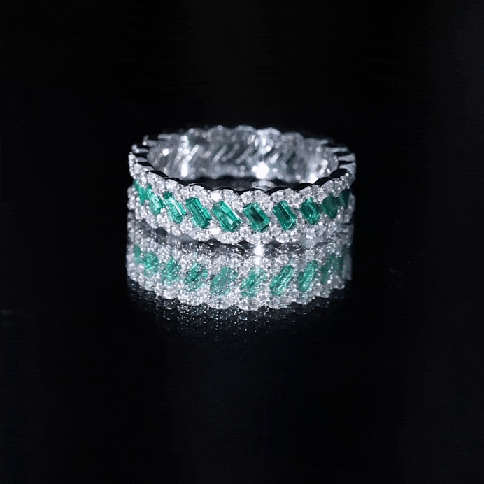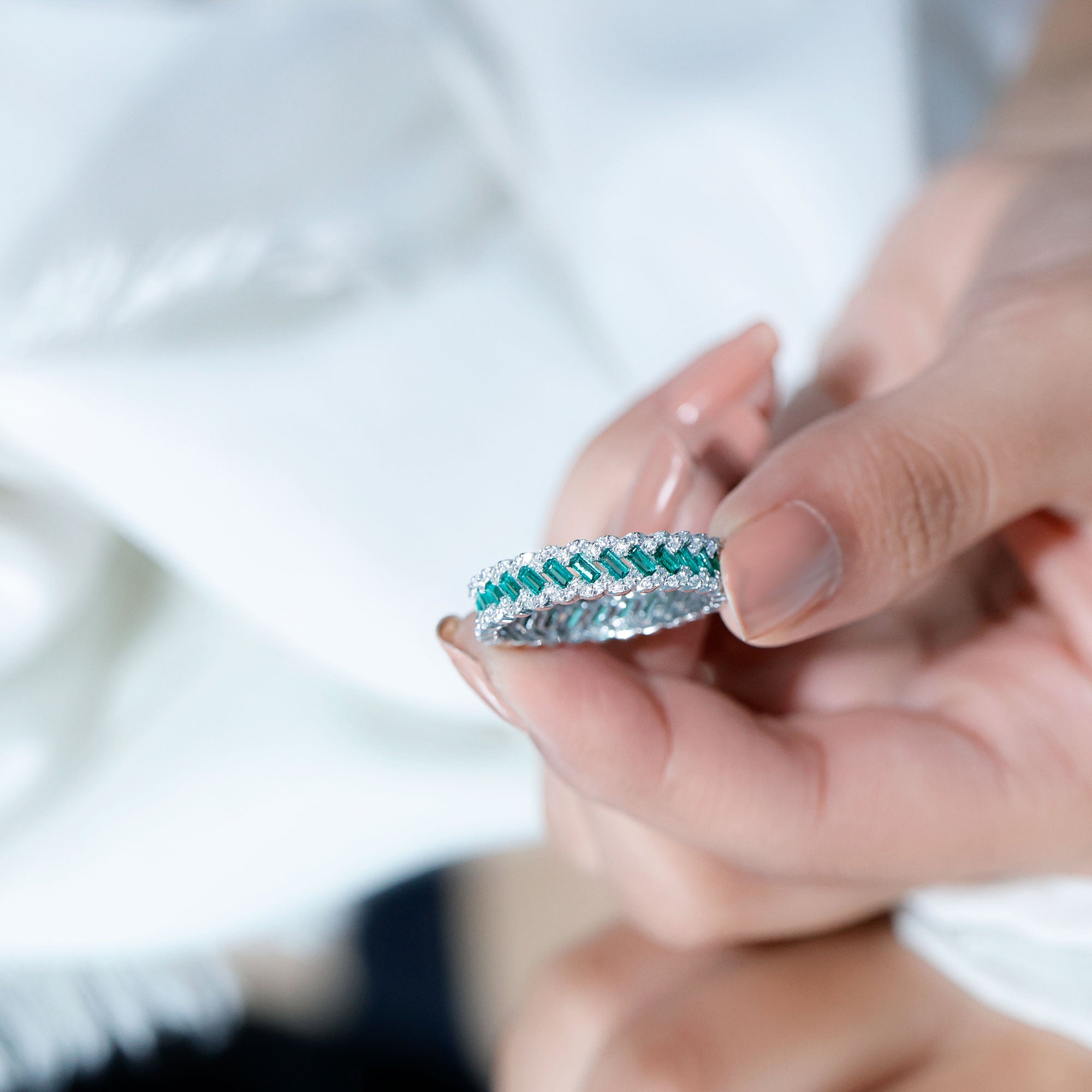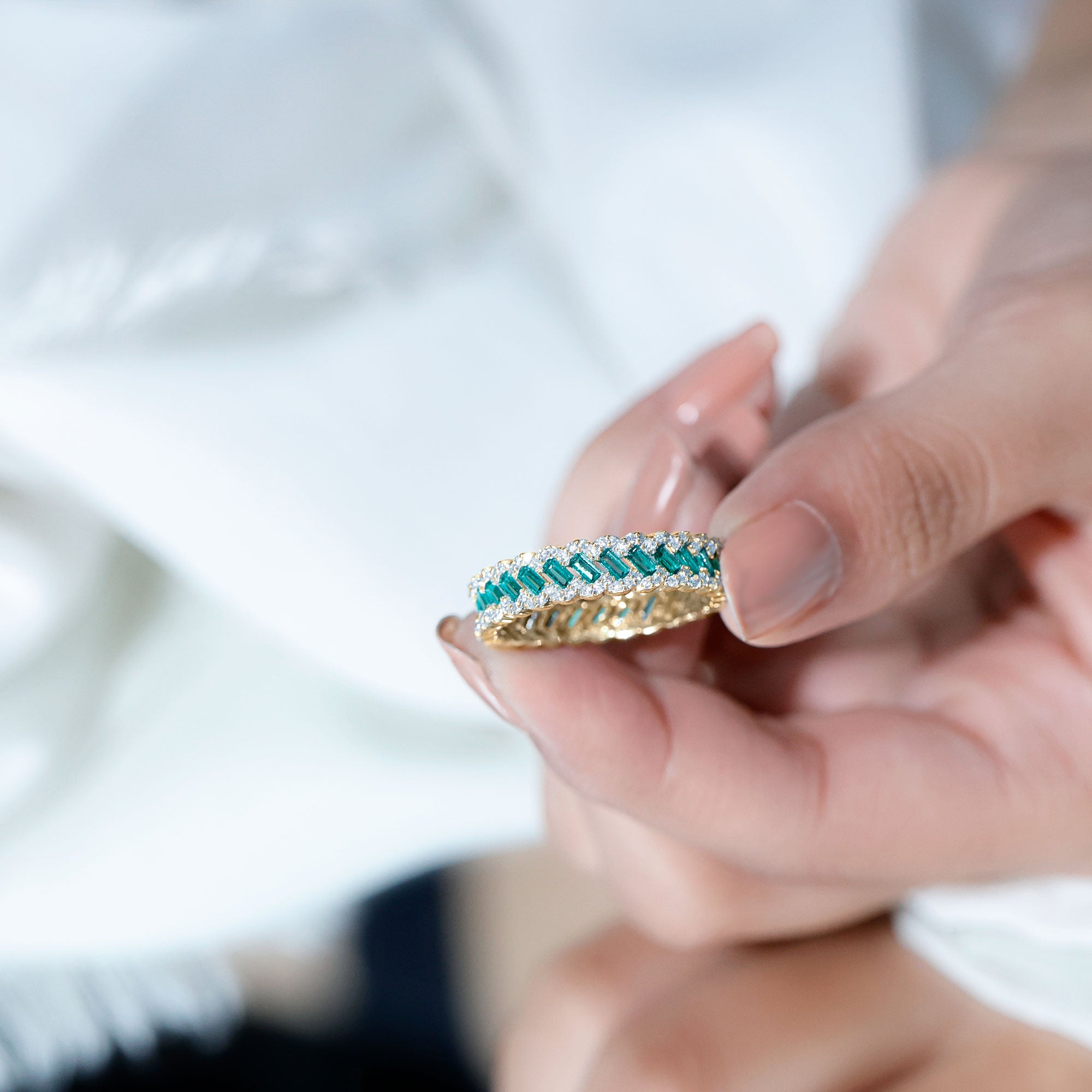 Delight in the enchanting allure of our Anniversary Ring, an irresistible accessory that will captivate your partners heart. This Wedding Anniversary Band showcases Baguette Created Emerald gemstones at its center, and the braided shank is adorned with the brilliance of Round Shape Moissanite, enhancing its beauty. This Eternity Wedding Ring beholds the unmatchable shine of AAAA Quality Lab Grown Emerald and D-VS1 Quality Moissanite which perfectly light up the celebration. The ring will invoke a romantic and timeless charm which makes it an ideal choice to express your love to her. This Emerald Wedding Ring will be a classic choice to start a new chapter of life. The Certified Wedding Ring will be shipped to you in a premium pack ensuring that your feelings attached to this ring are safe and secured.
