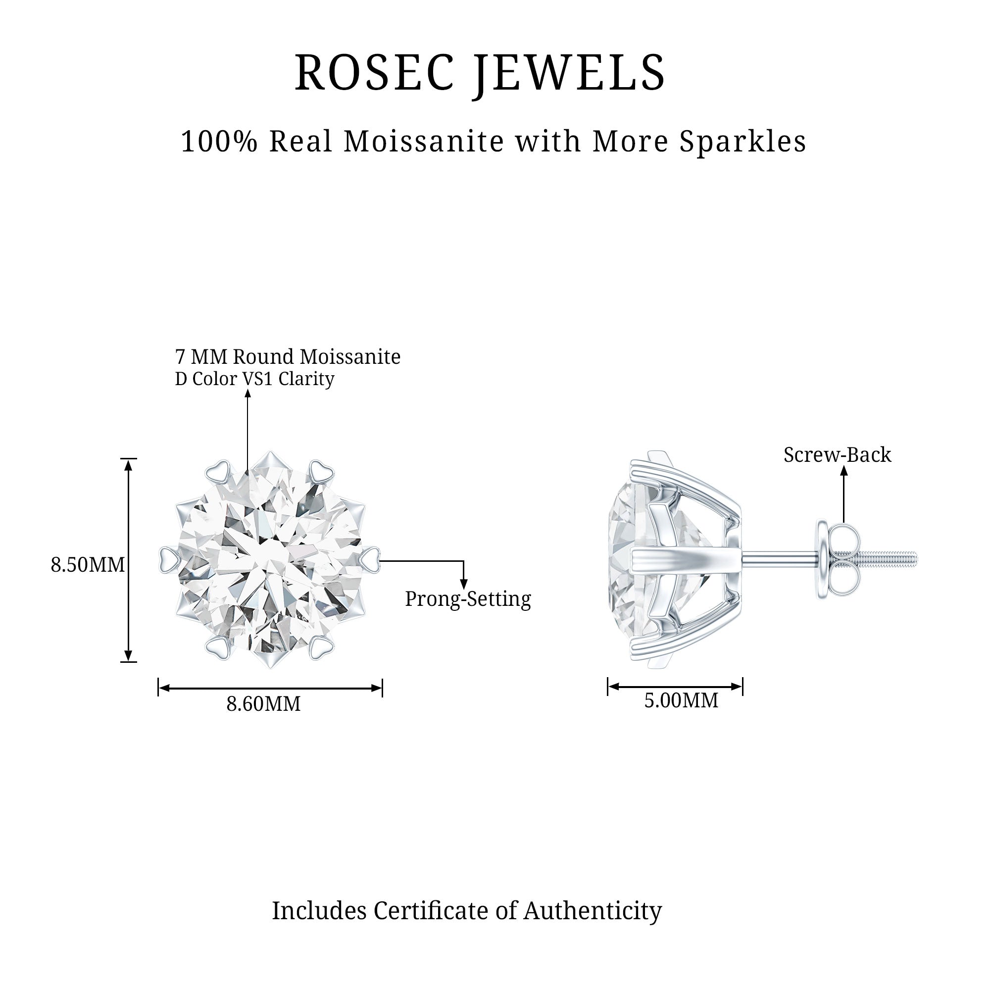 Rosec Jewels Moissanite Stud Earrings shine with incredible brilliance. They feature a 7 MM round moissanite set in prong setting, allowing the stone to catch the light beautifully. With a secure screw-back closure, these solitaire studs stay comfortably in place all day, making them a great choice for everyday wear or special occasions. Simple and elegant, these Solitaire Stud Earrings pair well with any outfit, whether you are heading to work, going out for dinner, or attending a celebration. Their bright sparkle adds just the right touch of style without feeling too bold. Because they are made with D-VS1 quality moissanite, you get the look of luxury with excellent durability and shine. These Moissanite Earrings also make a wonderful gift for birthdays, anniversaries, or any moment when you want to make someone feel special. They come with a certificate of authenticity, giving you confidence in your purchase. Packaged in a beautiful jewelry box, they are ready to gift right away or store safely when not being worn. You can also choose from different metal color options to match your personal style, making these Everyday Earrings a thoughtful and meaningful piece that your loved one will treasure.