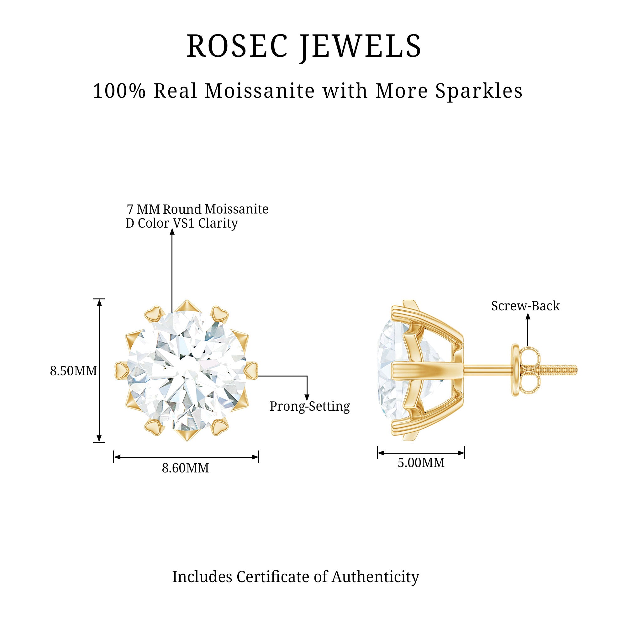 Rosec Jewels Moissanite Stud Earrings shine with incredible brilliance. They feature a 7 MM round moissanite set in prong setting, allowing the stone to catch the light beautifully. With a secure screw-back closure, these solitaire studs stay comfortably in place all day, making them a great choice for everyday wear or special occasions. Simple and elegant, these Solitaire Stud Earrings pair well with any outfit, whether you are heading to work, going out for dinner, or attending a celebration. Their bright sparkle adds just the right touch of style without feeling too bold. Because they are made with D-VS1 quality moissanite, you get the look of luxury with excellent durability and shine. These Moissanite Earrings also make a wonderful gift for birthdays, anniversaries, or any moment when you want to make someone feel special. They come with a certificate of authenticity, giving you confidence in your purchase. Packaged in a beautiful jewelry box, they are ready to gift right away or store safely when not being worn. You can also choose from different metal color options to match your personal style, making these Everyday Earrings a thoughtful and meaningful piece that your loved one will treasure.