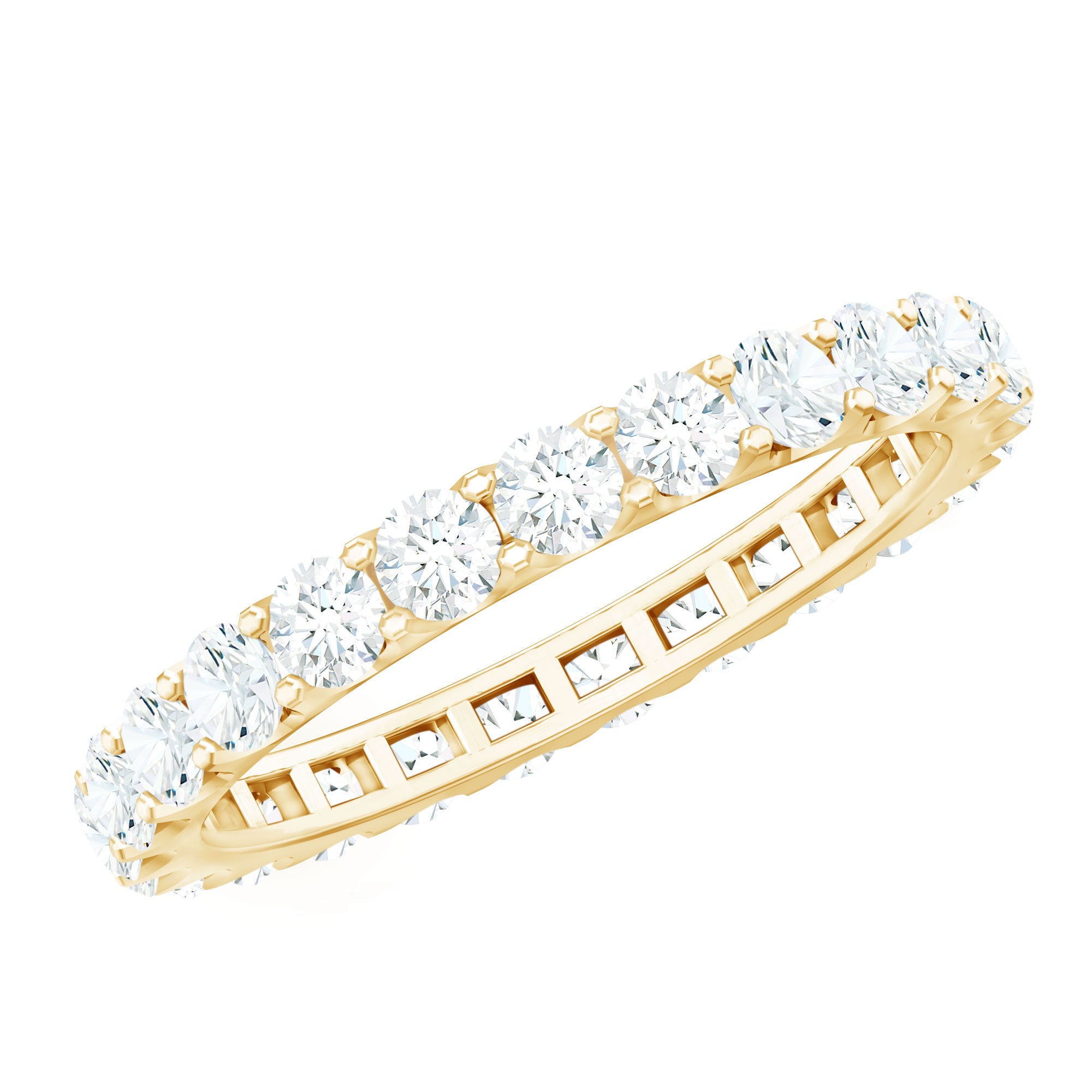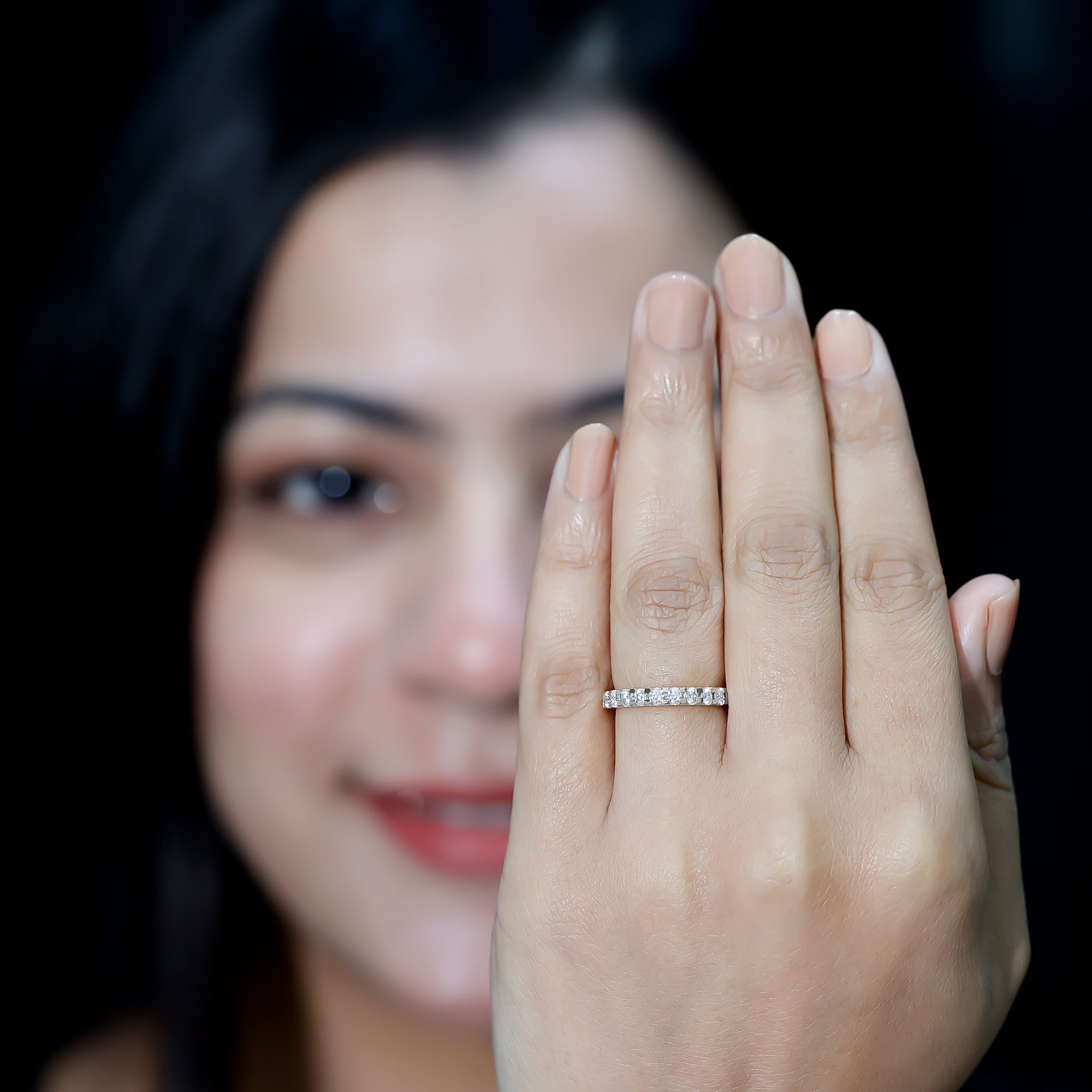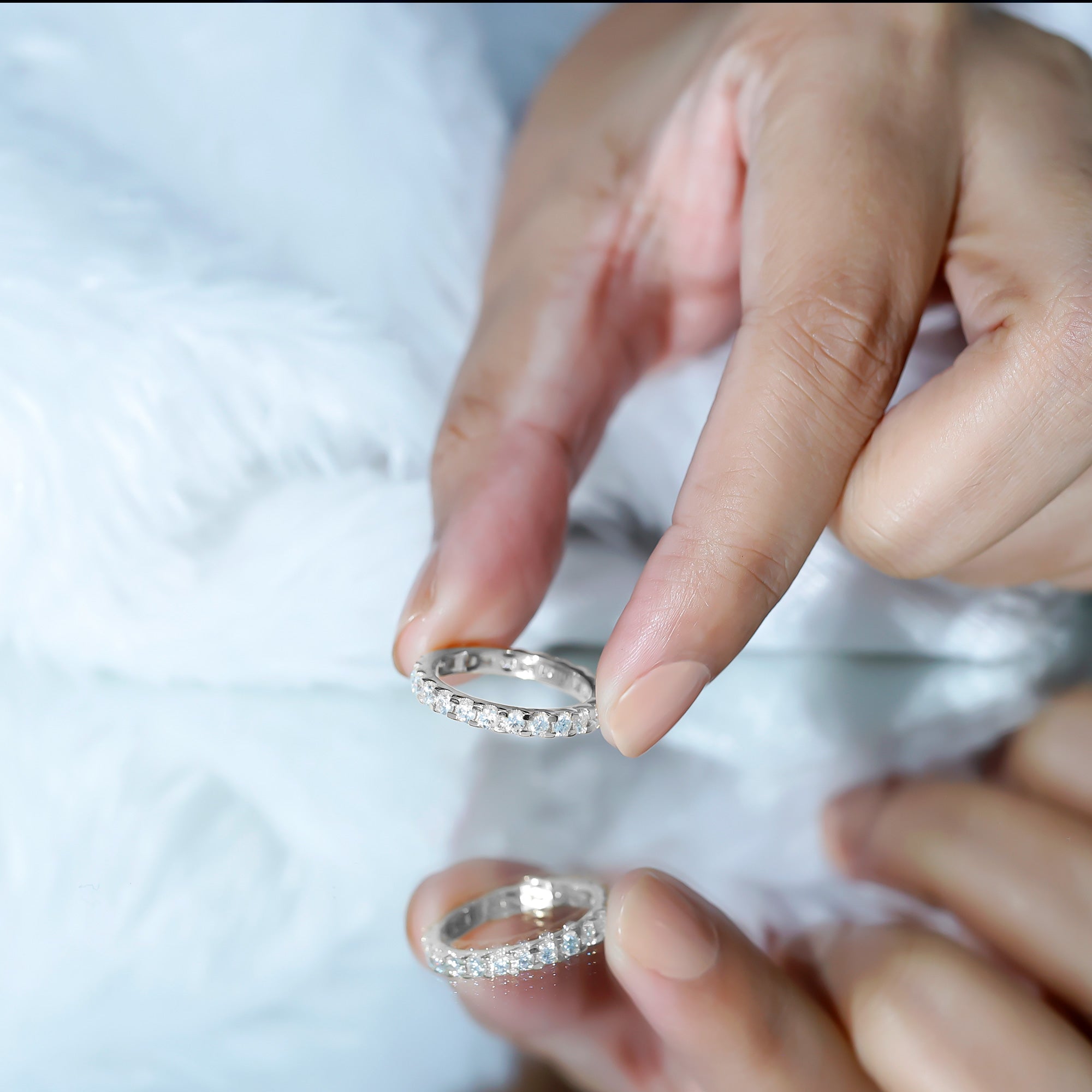 Wrap your finger in brilliance with this stunning Moissanite Wedding Ring - designed to be the perfect sparkle that enhances your natural glow. Featuring round-cut moissanites in shared prong setting, this Stackable Eternity Band creates a seamless flow of light and shimmer, symbolizing never-ending love and commitment. Each stone is of D color and VS1 clarity, offering exceptional fire and brilliance that rivals natural diamonds, at a more accessible price point. With its timeless appeal and elegant craftsmanship, this Moissanite Eternity Ring is ideal as a wedding band, anniversary gift, or meaningful token of love. The continuous circle of brilliance makes it a beautiful symbol of unity and devotion. Its classic design ensures it pairs effortlessly with engagement rings or stacks stylishly with another band for a layered look. Available in various metal colors and purity options, you can personalize the ring to match your style or sentiment. Whether worn daily or on special occasions, this Eternity Wedding Band blends sophistication with modern charm. Its more than just a piece of jewelry, it is a celebration of milestones, memories, and the moments that make life sparkle. Add a radiant touch to your collection with this elegant and versatile Wedding Anniversary Band.