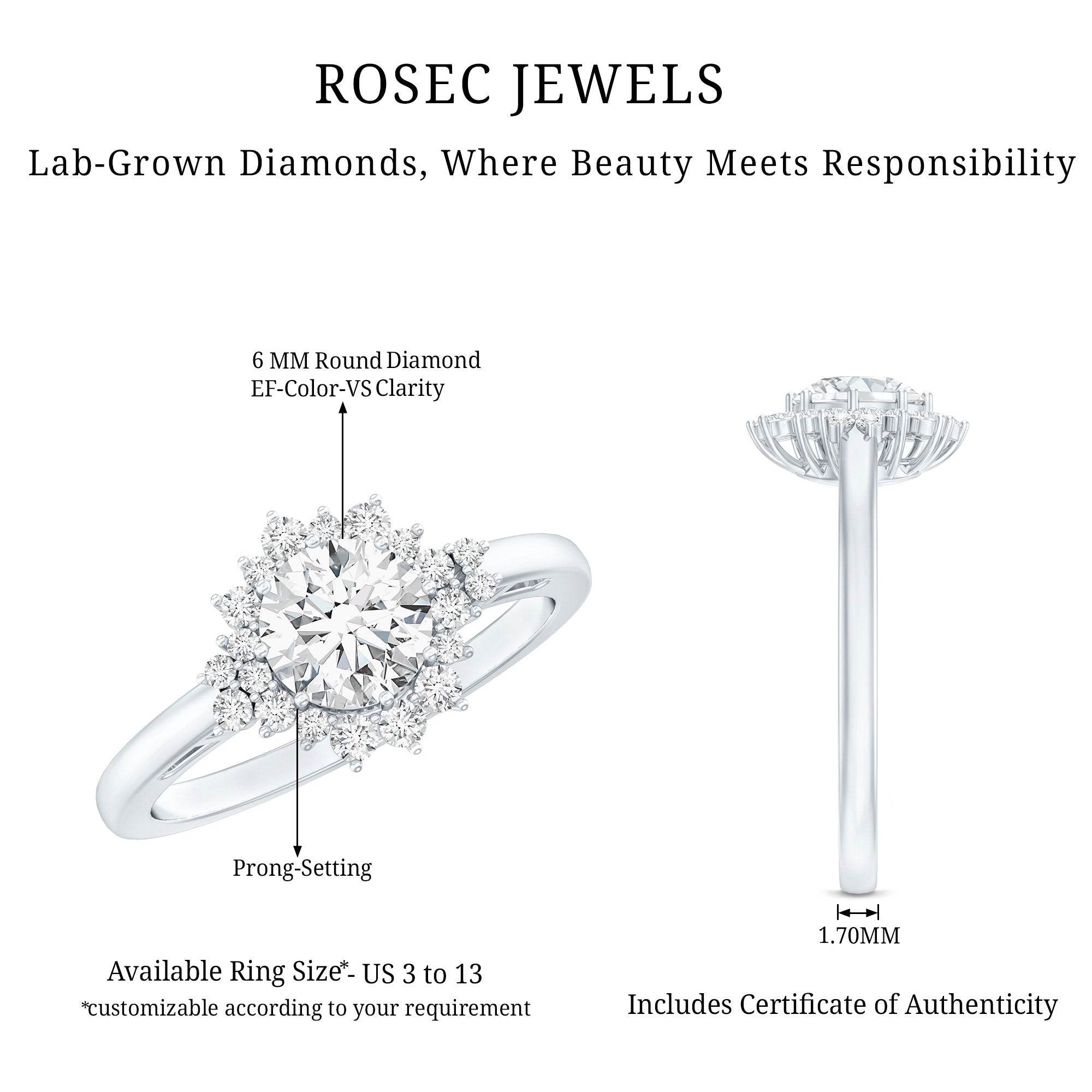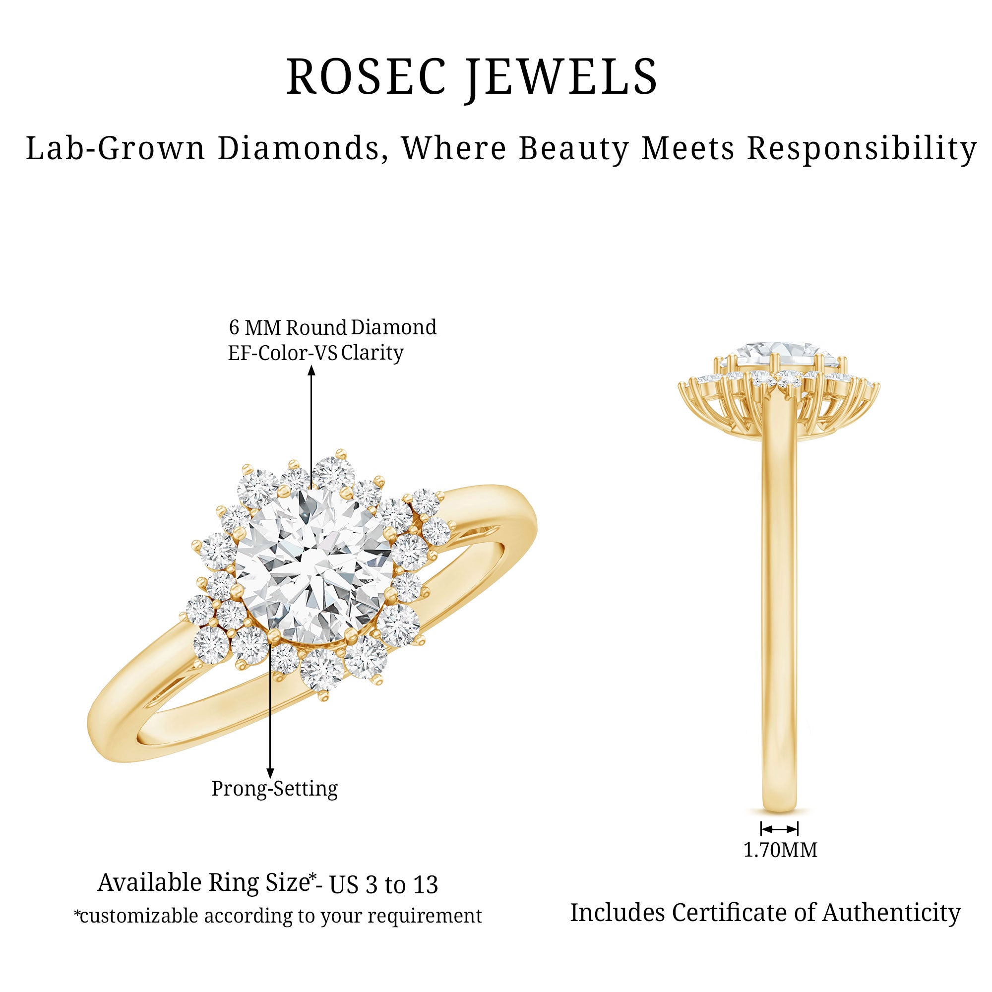 Express your love by presenting her this exquisite Lab Grown Diamond Engagement Ring. This stunning piece showcases a 6 MM round shaped diamond of EF-VS Quality at its heart elevating its allure, surrounded by a halo of smaller gemstones. Order this 1 carat Diamond Ring by Rosec Jewels, which specializes in crafting stunning jewelry pieces using certified lab-cultured gemstones. Gift it to your girlfriend or wife and let this Promise Ring speak volumes about your enduring affection and make her eyes shine like never before. Our Circle Engagement Ring comes in a premium box that can later be used to store the jewelry when not in use also, available in various sizes and metal color options.