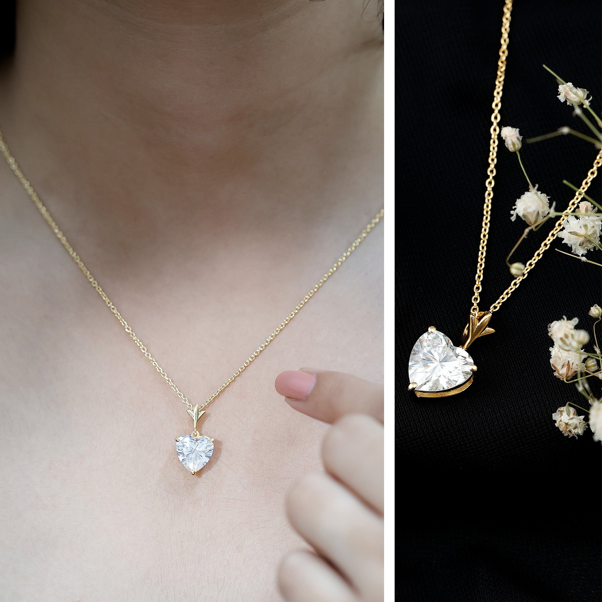 Add a little sparkle to your daily style with our Moissanite Heart Necklace, crafted in 14k yellow gold plated silver with a stunning blend of timeless romance and modern artistry. At the center of this elegant design lies a brilliant 10 MM heart shaped moissanite, graded D color and VS1 clarity, expertly cut to reflect light with stunning fire and brilliance. Secured in 3-prong setting, the gemstone sparkles effortlessly, capturing the essence of heartfelt emotion in every glance. Crafted for both lasting impression and everyday wear, this Heart Pendant Necklace is more than a piece of jewelry, it is a meaningful keepsake. Whether worn as a daily reminder of love or saved for special moments, its timeless shape and refined finish make it a versatile companion for any style. The Solitaire Heart Necklace hangs gracefully from a delicate, adjustable chain, offering the perfect fit whether you wear it solo or layered. Thoughtfully packaged in an elegant jewelry box, it is ready to become a cherished gift. Whether you are celebrating Valentine’s Day, a romantic anniversary, a birthday, or simply choosing to honor self-love or friendship, this Moissanite Necklace is a perfect gesture. A true solitaire statement, it brings joy with every wear, the kind of piece that earns compliments, sparks smiles, and makes you feel beautifully seen.