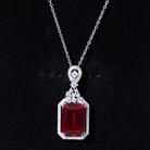 Make a statement that lasts forever with this stunning Art Deco Necklace. Made from white gold plated silver, this gorgeous Wedding Necklace for Bride showcases a 10X14 MM emerald cut lab-created ruby in a prong setting, radiating a color of love with mesmerizing brilliance. The center stone is surrounded by a delicate Halo of round brilliant cut Moissanite and features a cluster at the top, boosting its luxurious vibe. The Vintage Ruby Necklace hangs from a cable chain, perfectly combining timeless charm with modern luxury. The Art Deco allure of the Lab Grown Ruby Necklace is crafted to embody timeless elegance, merging style and sophistication. The classic Emerald Cut embraces a vintage art deco-inspired design with bold geometric shape, making it a luxurious yet subtle accessory for any event.