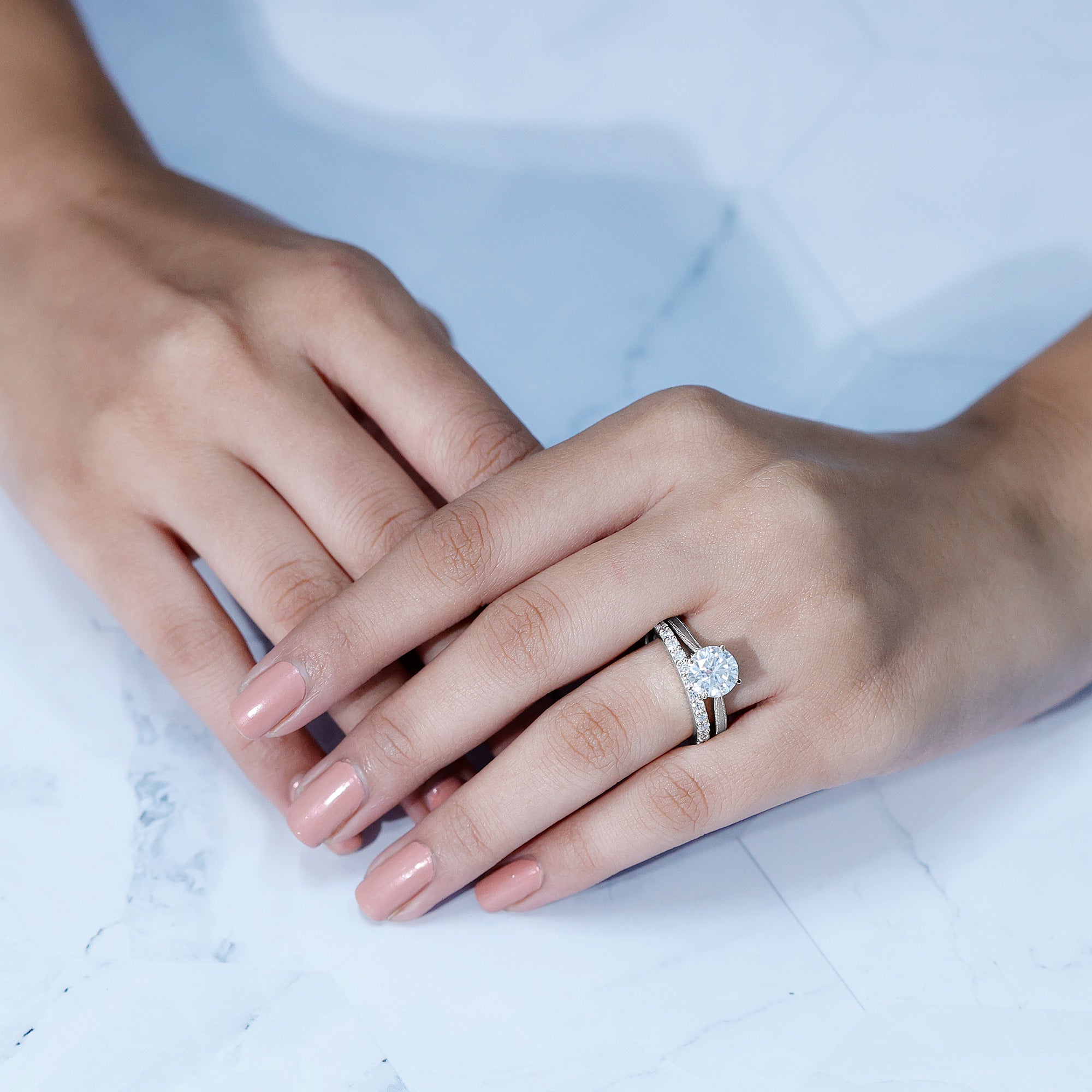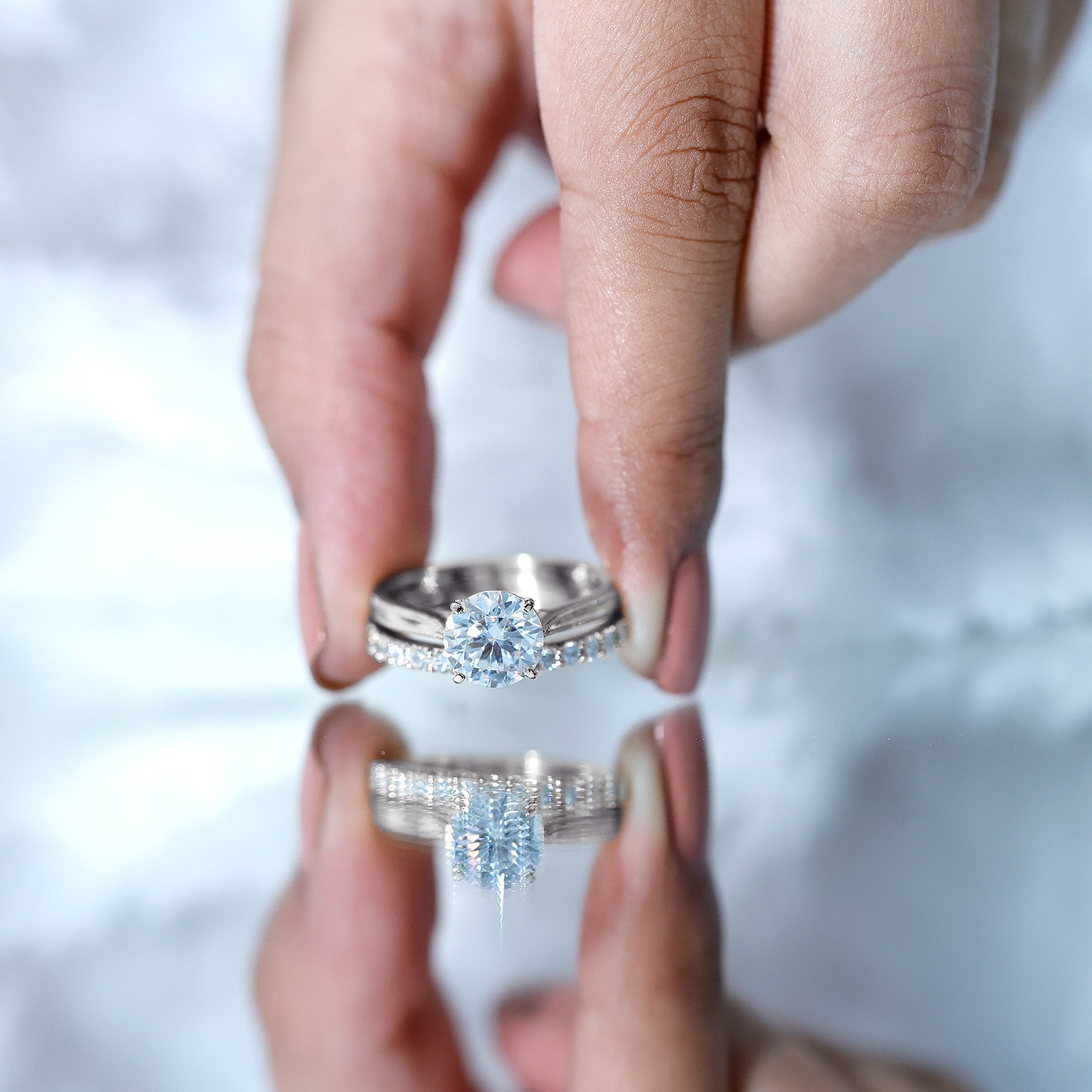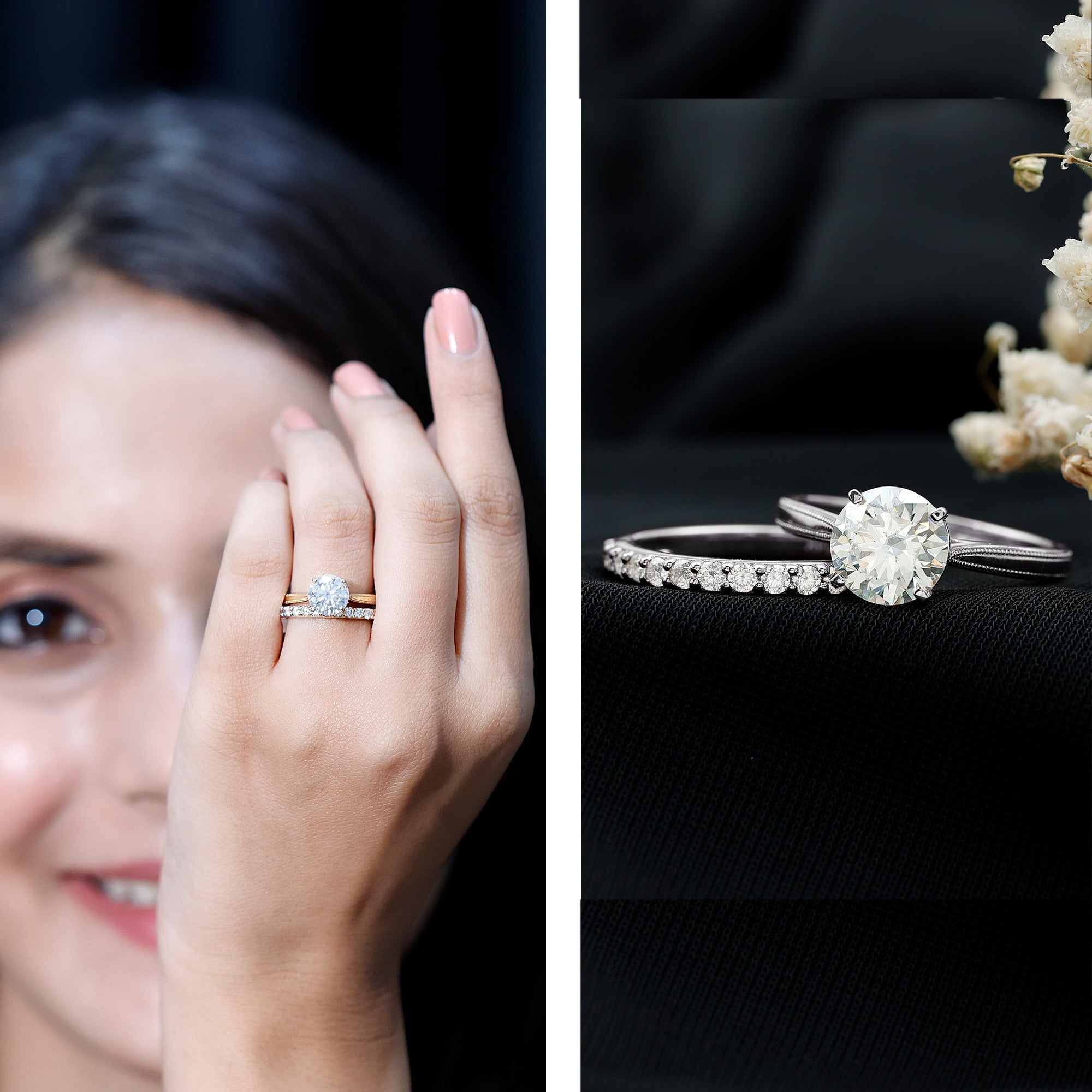The Solitaire Wedding Ring Set features a Cathedral Engagement Ring that showcases a stunning 8 MM round lab-grown diamond, complete with a surprise diamond and milgrain detailing on the band. The Half Eternity Wedding Band is also embellished with round-cut lab-made stones. The solitaire stone is set in basket setting, enhancing its sparkle and drawing attention as it rises from the finger. These rings form a beautiful pair that can be worn separately or together, depending on the occasion. We deliver this Diamond Engagement Ring Set in a signature jewelry box, creating unforgettable moments when you present it to her, and providing safe storage for later. Let her fall even more in love with our Engagement and Wedding Set on the big day, and get ready for a big Yes. We craft this Lab Created Diamond Bridal Ring Set in a variety of precious metals, offering options for color and purity. The exquisite detailing, brilliant sparkle, and thoughtful design ensure it stands out at every event, from proposals to anniversaries. Your love story deserves a 2 Carat Diamond Ring Set that shines just as brightly, and this one will make every moment unforgettable.