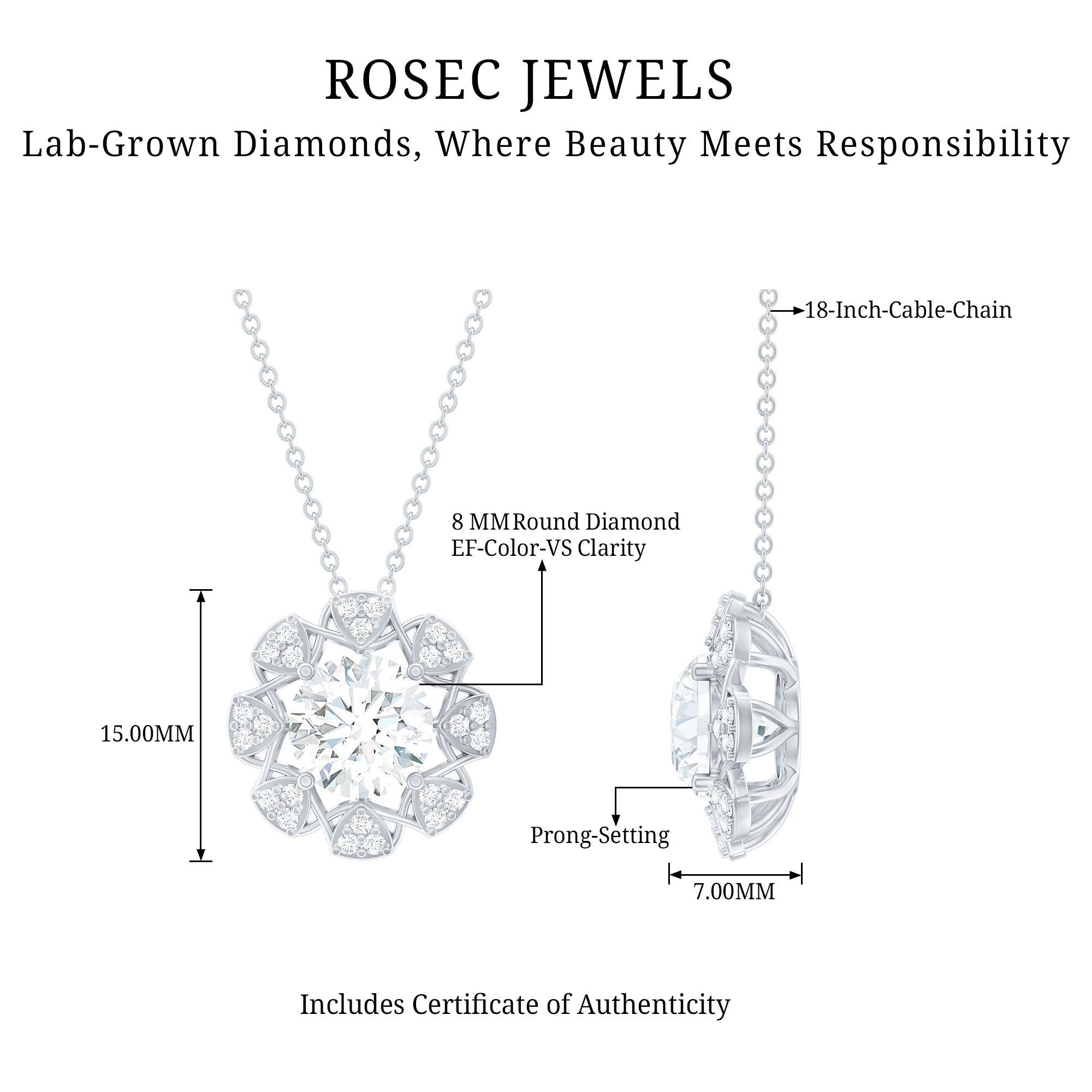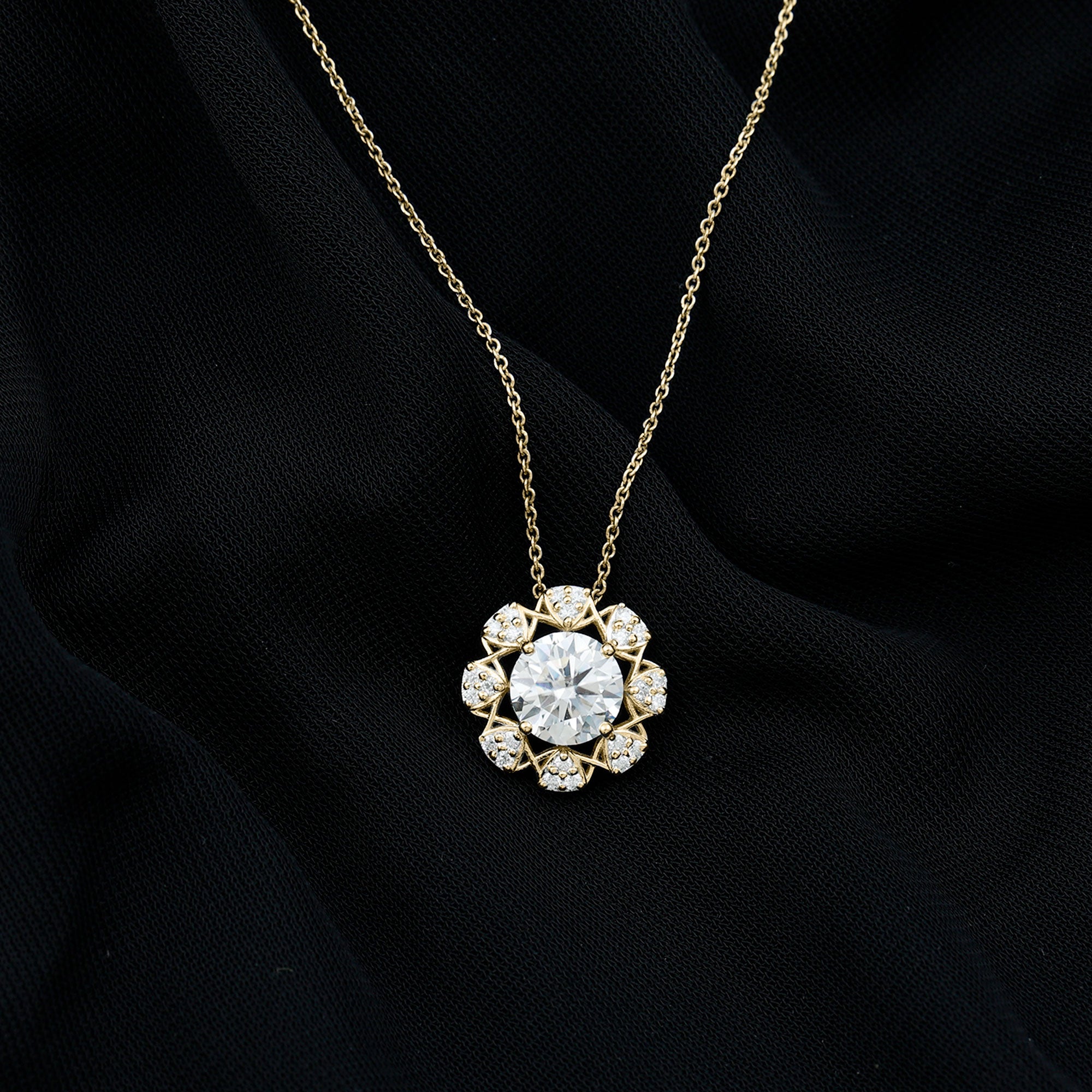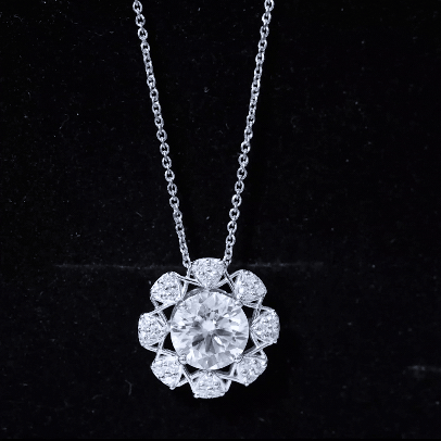 This Diamond Designer Necklace draws its inspiration from the beauty of flowers, making it a one-of-a-kind piece just for you. Adorn your neckline with this Floral Pendant, which showcases an 8 MM Round Shape Diamond of EF-VS quality set in prongs, surrounded by multiple trios of small gemstones that create a dazzling effect sure to attract attention. The simple yet elegant design of this Round Pendant Necklace beautifully represents the enduring themes of love, compassion, and lifelong commitment. Whether youre preparing for a special event or simply want to elevate a casual look, this Halo Pendant is the ideal finishing touch.