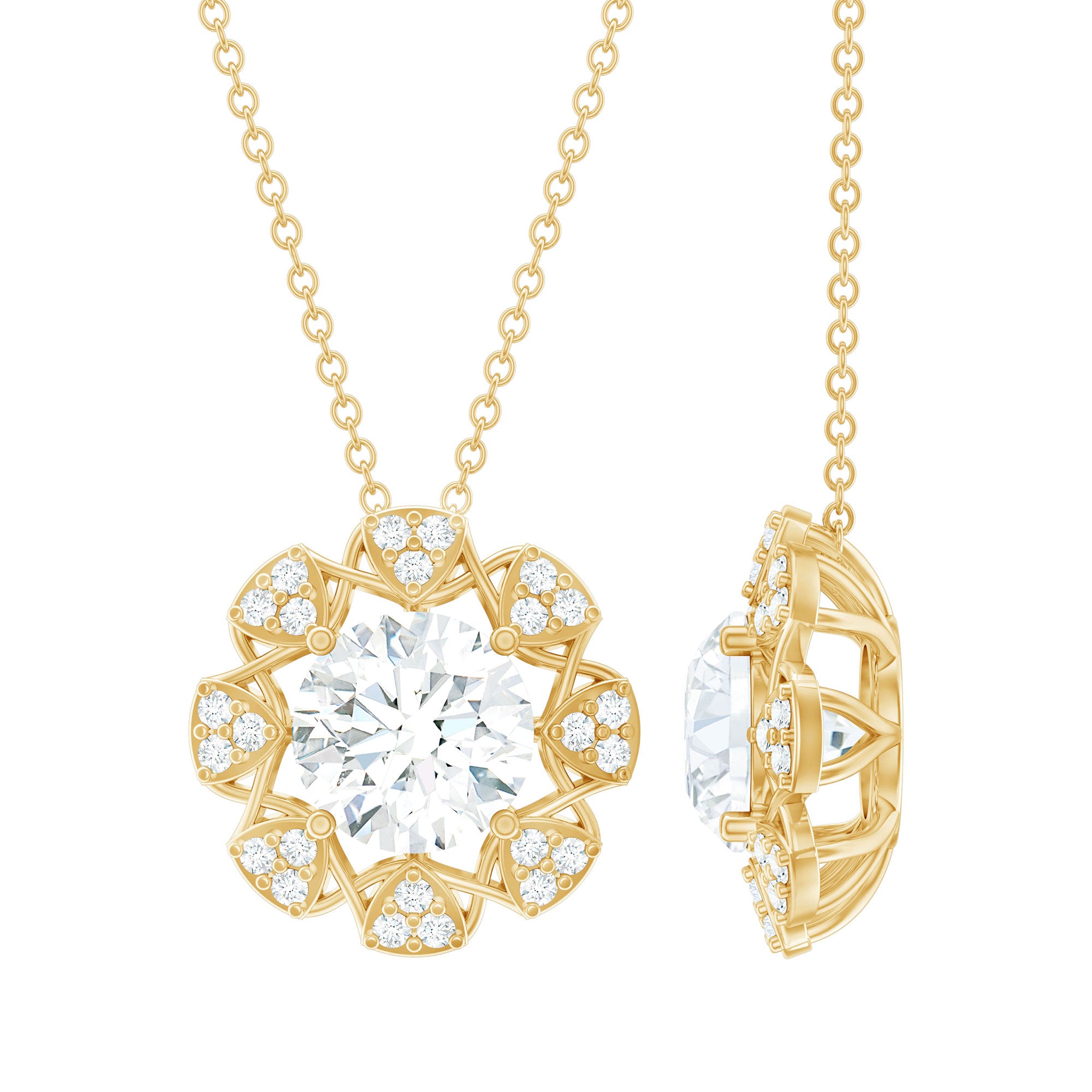 This Diamond Designer Necklace draws its inspiration from the beauty of flowers, making it a one-of-a-kind piece just for you. Adorn your neckline with this Floral Pendant, which showcases an 8 MM Round Shape Diamond of EF-VS quality set in prongs, surrounded by multiple trios of small gemstones that create a dazzling effect sure to attract attention. The simple yet elegant design of this Round Pendant Necklace beautifully represents the enduring themes of love, compassion, and lifelong commitment. Whether youre preparing for a special event or simply want to elevate a casual look, this Halo Pendant is the ideal finishing touch.