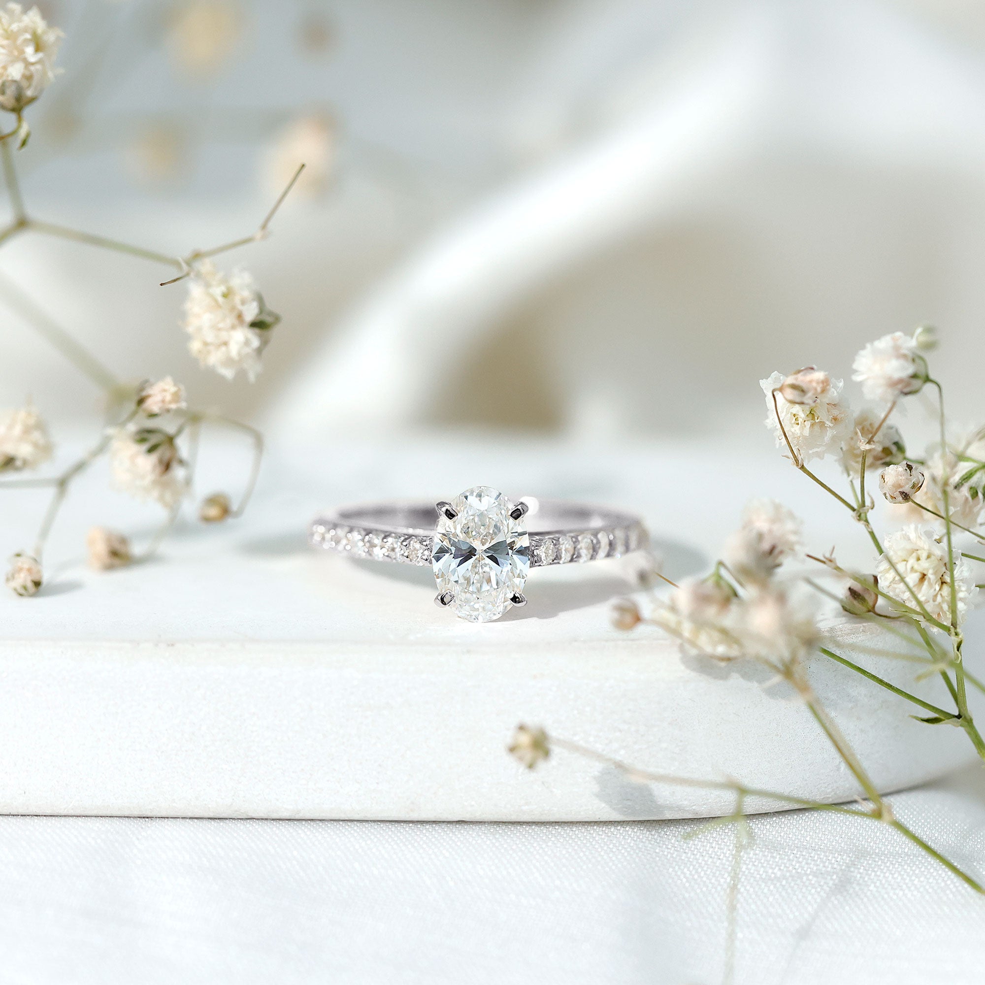 Because every yes deserves a Big Diamond Ring as unforgettable as the moment itself. This stunning Diamond Engagement Ring is a masterpiece of elegance and sophistication, featuring a 7X9 MM oval cut center stone securely held in a crown setting. Enhancing the centerpiece are dazzling round shaped side stones placed over the shank and 2 peek-a-boo diamonds add a little extra surprise. With a total gemstone weight of 2.5 carats, it offers the perfect amount of sparkle, and the unnatural diamonds are sustainably sourced. Unique and eye-catching, this Oval Shaped Engagement Ring turns the moment into forever. Plus, this affordable April Birthstone Ring comes with a certificate of authenticity and a signature protective package box, so you know you are getting the real deal.