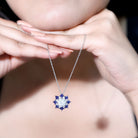 Adorn your neckline with this Moissanite Pendant beautified with Princess Cut Lab Grown Sapphires, precisely crafted with 14K White Gold Plated Silver. The center of the pendant is embedded with an 8 MM Round Shape Moissanite secured in Prong Setting encircled with a Halo of smaller Moissanite and Lab Curated Sapphire. The Halo Pendant exudes a classic shine of D-VS1 quality Moissanite, making it perfect to wear on a special occasion such as an anniversary or birthday. This Art Deco Pendant Chain will be delivered to you in a velvet pouch for storage when not in use, along with the certificate of authenticity.