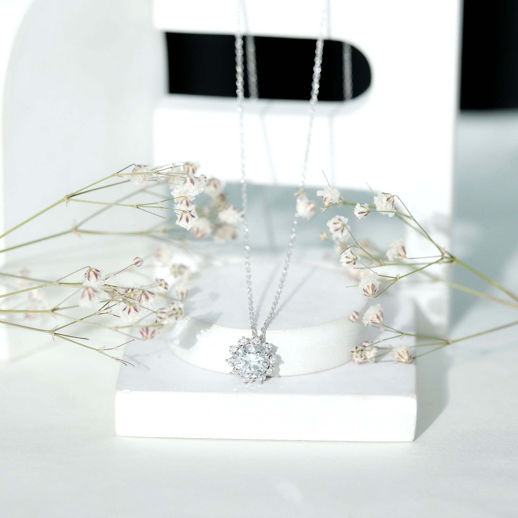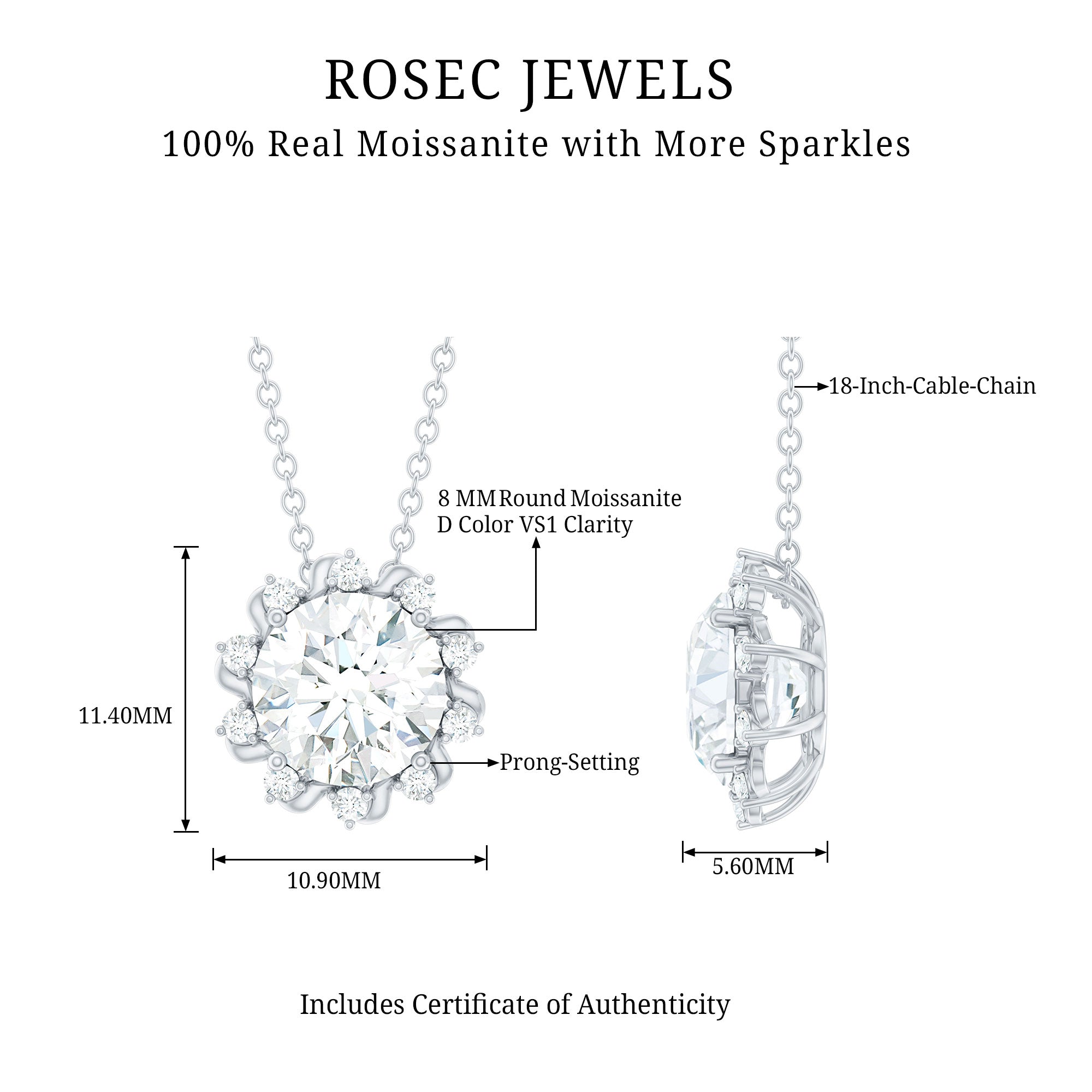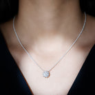 Adorn your Neckline with this Moissanite pendant, precisely crafted with 14K White Gold Plated Silver. The pendant features an 8 MM Round Shape Moissanite adorned with smaller Moissanite secured in Prong Setting. This Sunburst Pendant Necklace holds the classic shine of the classic shine of D-VS1 Quality Moissanite. This pendant is accentuated with a hidden bail and dangles with a cable chain, which allows you to adjust the length of the pendant according to your style.