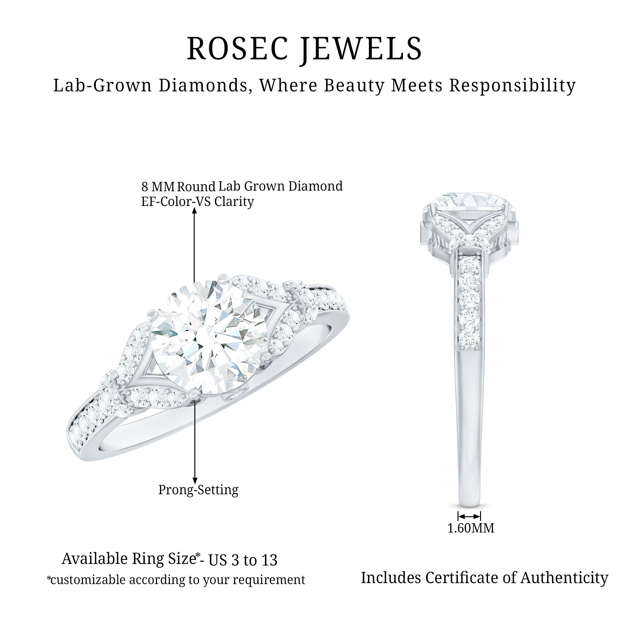Add an bold but elegant style statement on the big day with this Diamond Engagement Ring, designed by Rosec Jewels. The center features a brilliant 8 MM round shaped EF-VS quality diamond set in prong setting while the smaller diamonds line the split shank, giving this Solitaire Ring a modern, eye catching look and adding the perfect sparkle. We design jewelry thats easy on your wallet and the planet. Every gemstone in this Split Shank Engagement Ring is lab-grown which is ethically made, responsibly sourced, and absolutely amazing. We ship this Fine Ring in the appropriate packaging ensuring they are ready for gift upon arrival.
