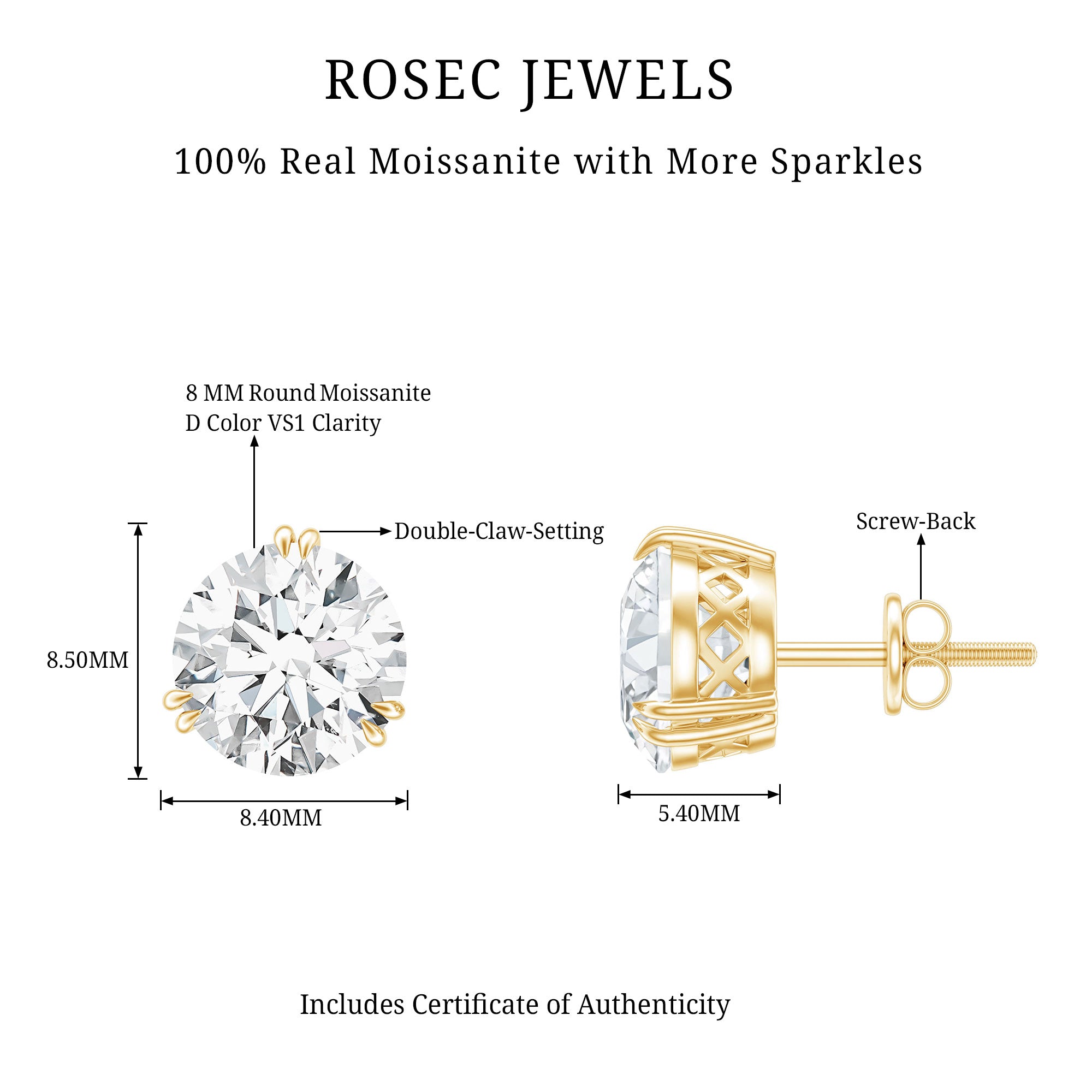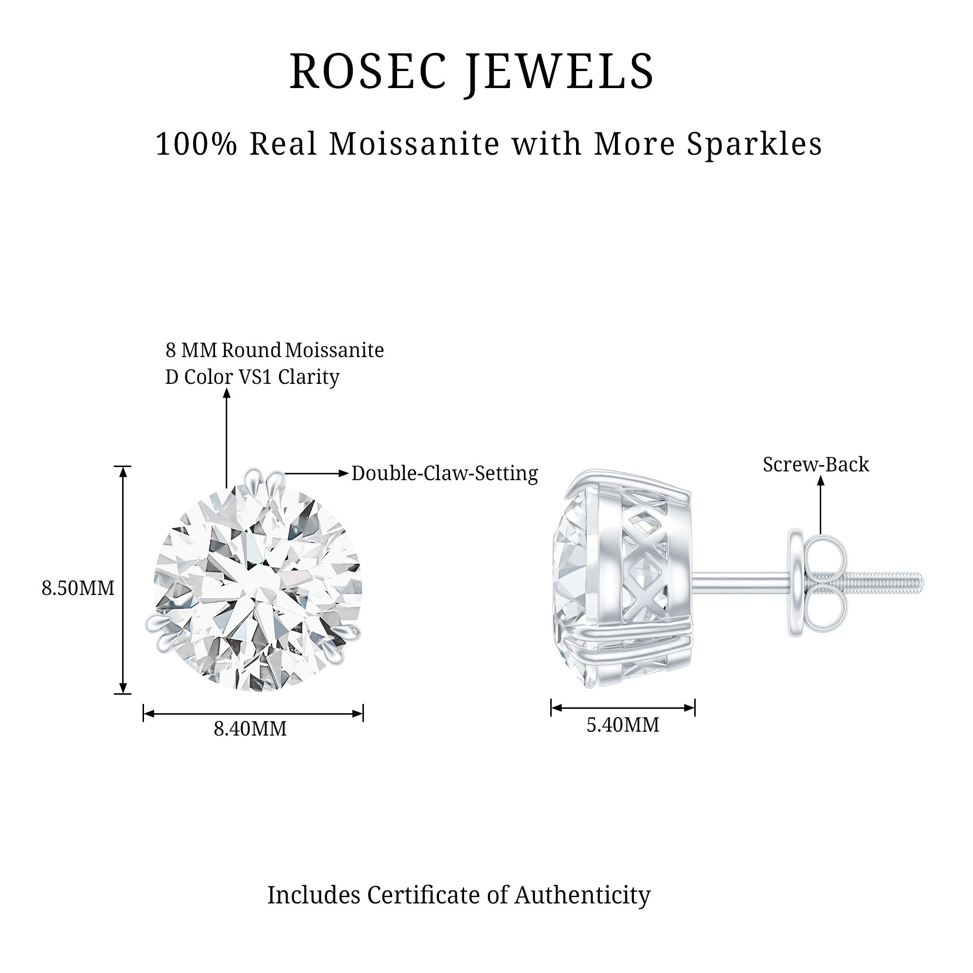 A small gift can create the biggest smile, and these Solitaire Stud Earrings are designed to do just that. Thoughtful and timeless, they make a beautiful birthday present she will treasure for years. Embellished with an 8 MM round moissanite set in secure 3 double-claw prong setting, allowing the stone to shine brightly from every angle. Made with D-VS1 quality moissanite, they offer exceptional sparkle while remaining an ethical and affordable choice. The screw-back closures ensure a snug and comfortable fit, making these Moissanite Stud Earrings perfect for everyday wear. Their simple and classic style suits both men and women, making them a versatile piece for any jewelry collection. Whether worn to work, a special event, or a casual outing, these studs add a touch of elegance. Presented in a beautiful jewelry box, these Everyday Earrings arrive ready to gift, making the moment even more special. A certificate of authenticity is also included, giving confidence and assurance of quality.